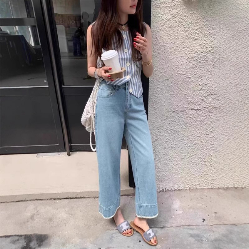 라이트 블루 하이 허리 와이드 레그 청바지 여자 2025 년 여름 슬리밍 올 매치 루즈 캐주얼 크롭 스트레이트 팬츠