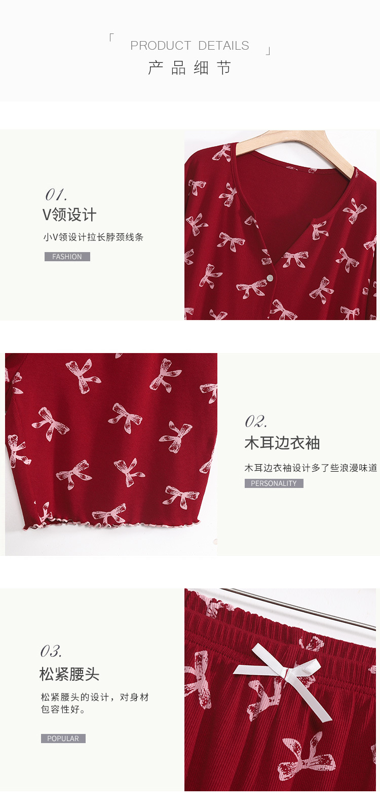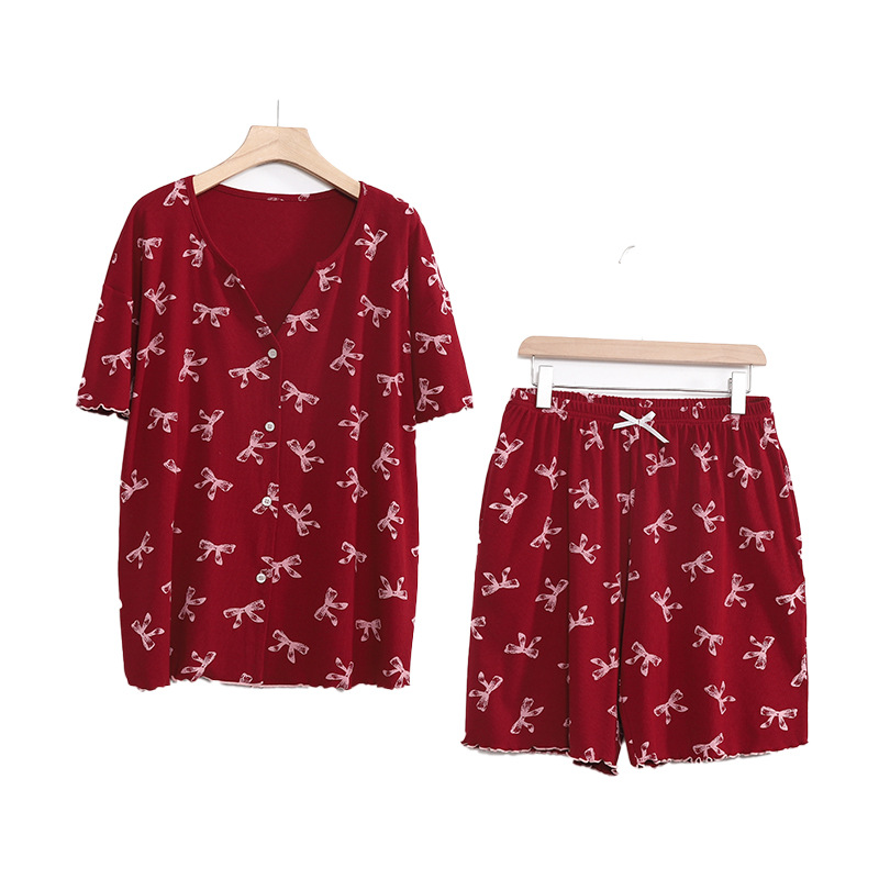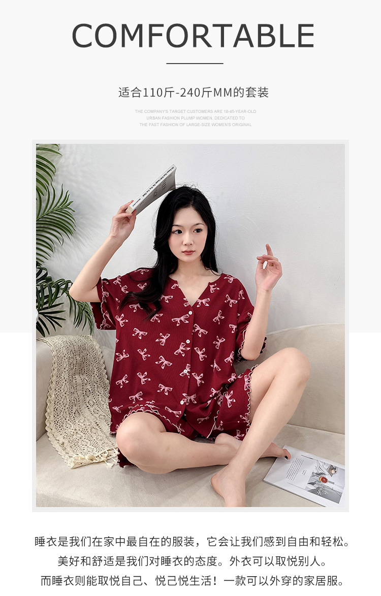 2025 여름 V-목 플러스 사이즈 잠옷 여성의 얇은 달콤한 활 인쇄 의상 플러스 사이즈 홈 의류