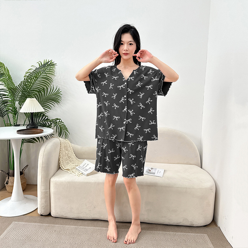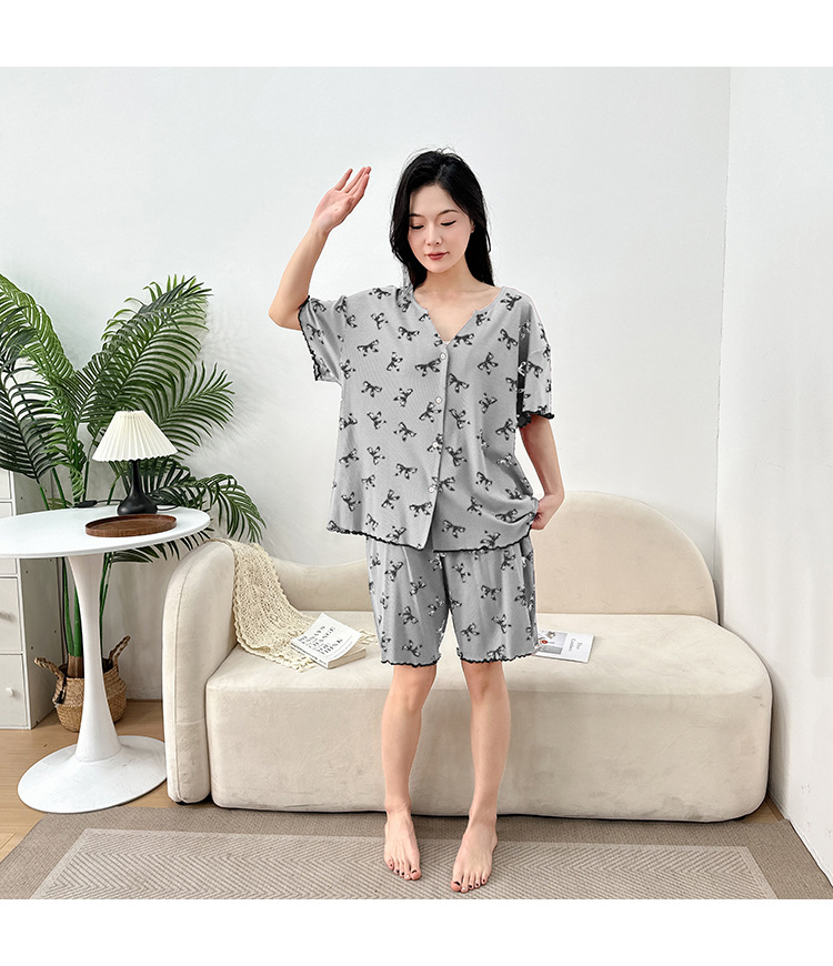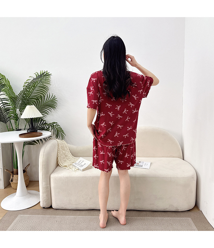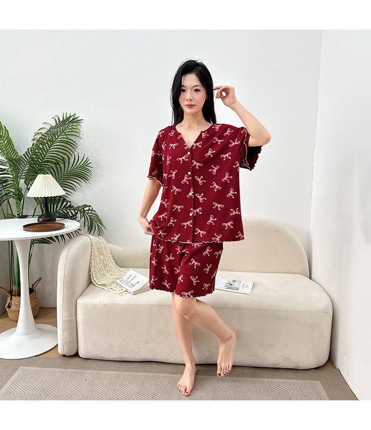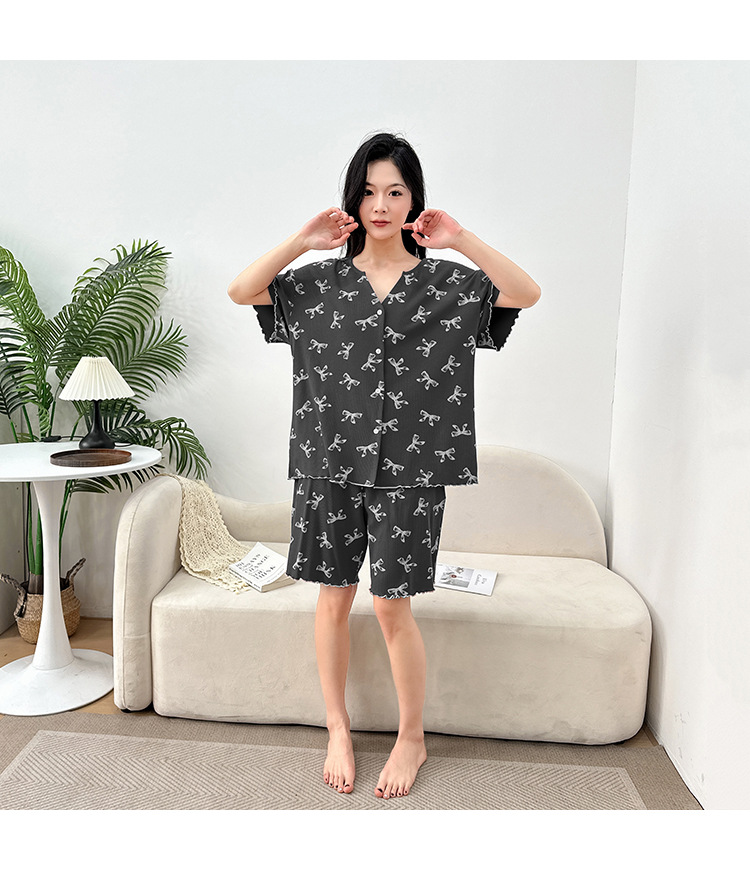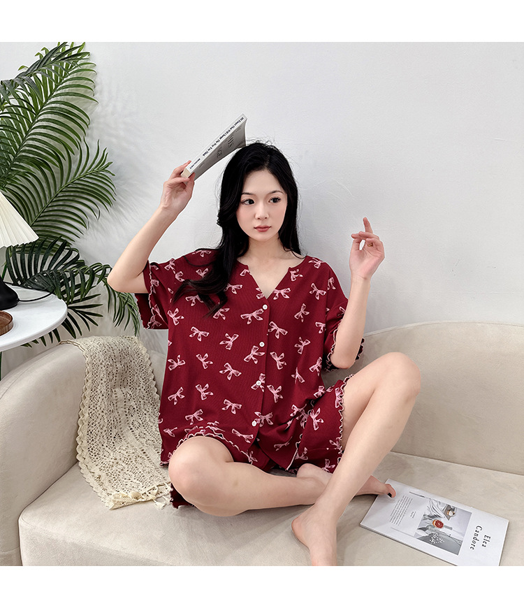 2025 여름 V-목 플러스 사이즈 잠옷 여성의 얇은 달콤한 활 인쇄 의상 플러스 사이즈 홈 의류스토어 가기