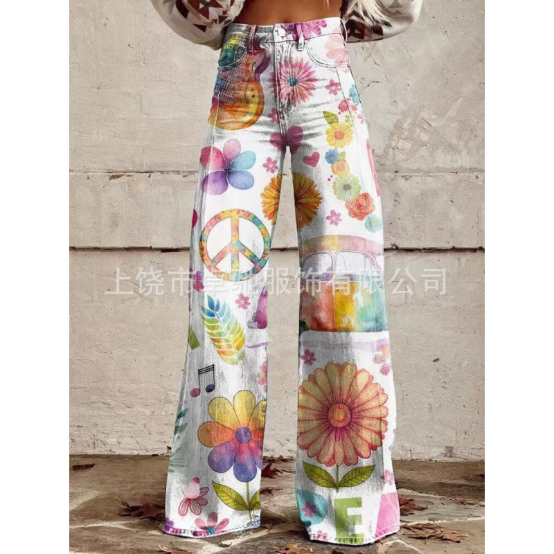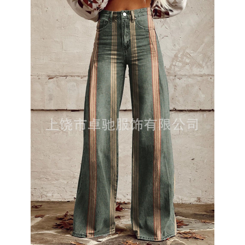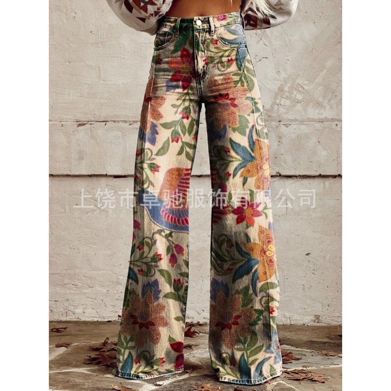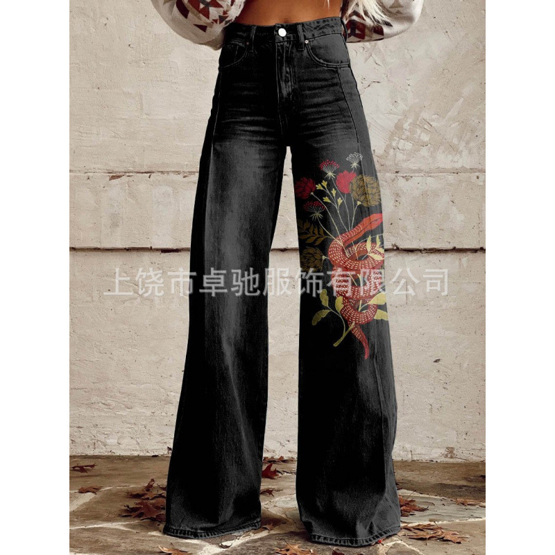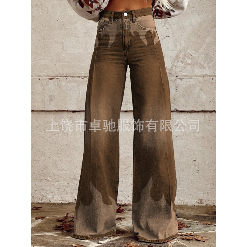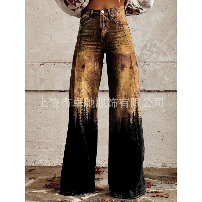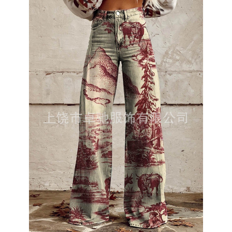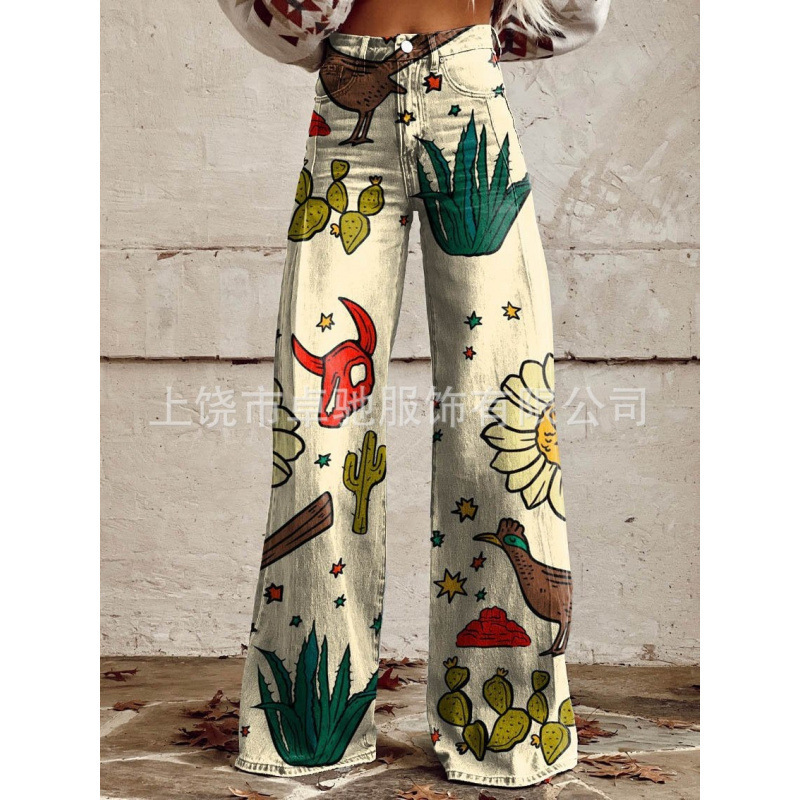 2025 독립 역 Xiyin 유럽 및 미국 대외 무역 플러스 사이즈 여성 캐주얼 바지 인쇄 모방 청바지 넓은 다리 3D 패션 여성 바지