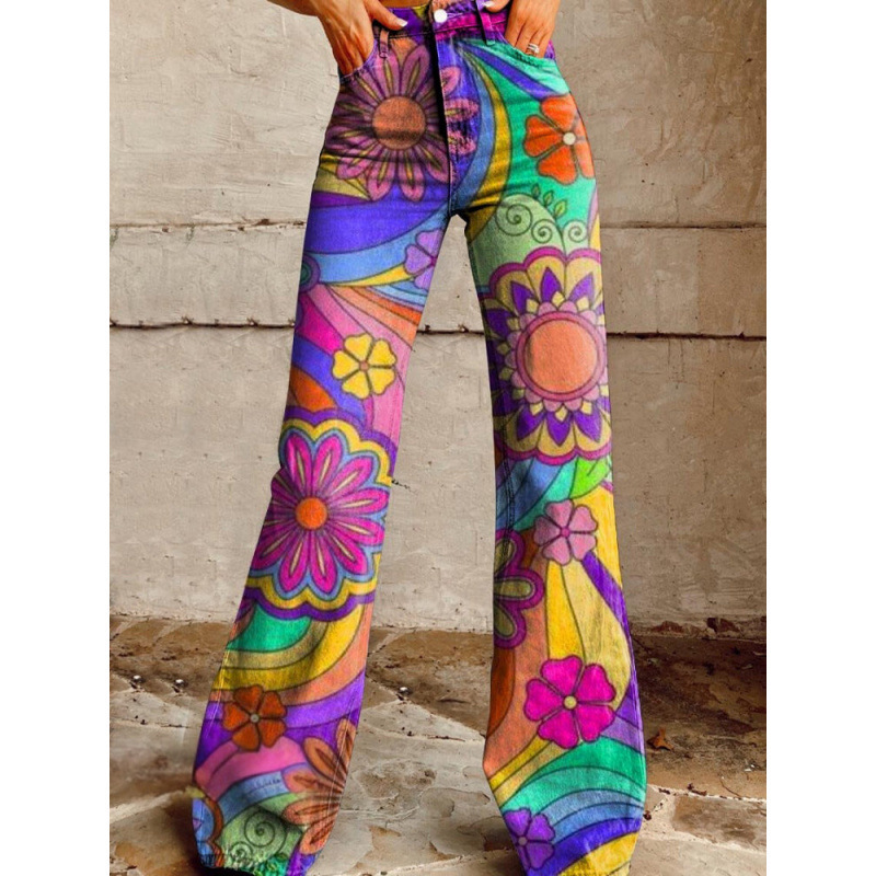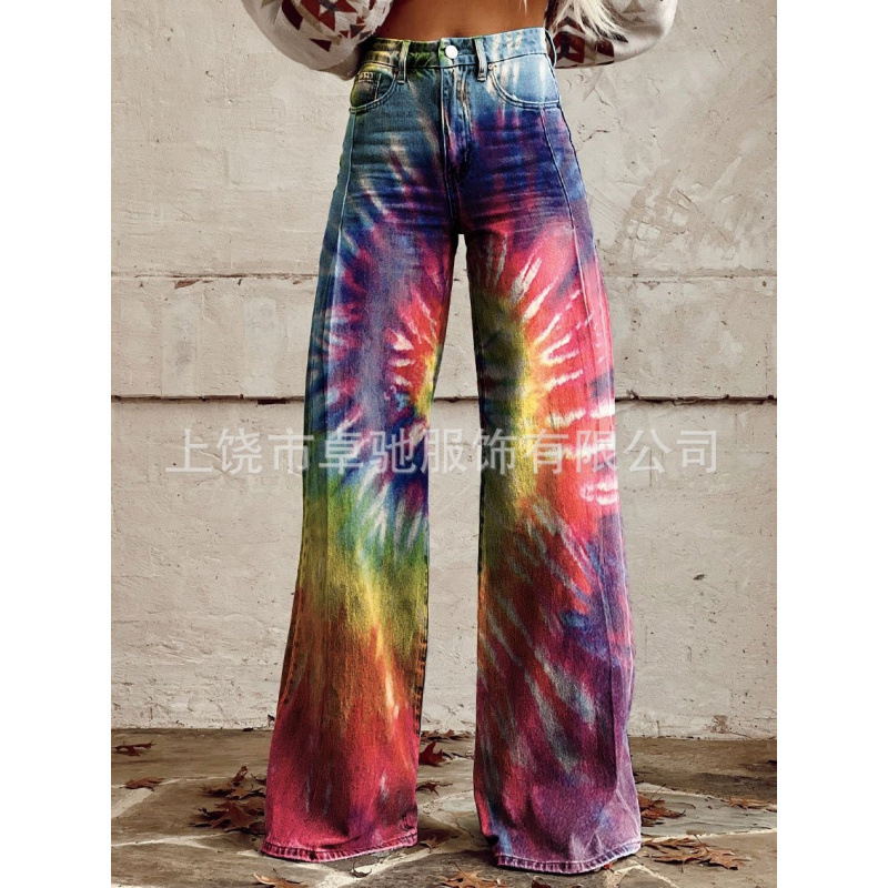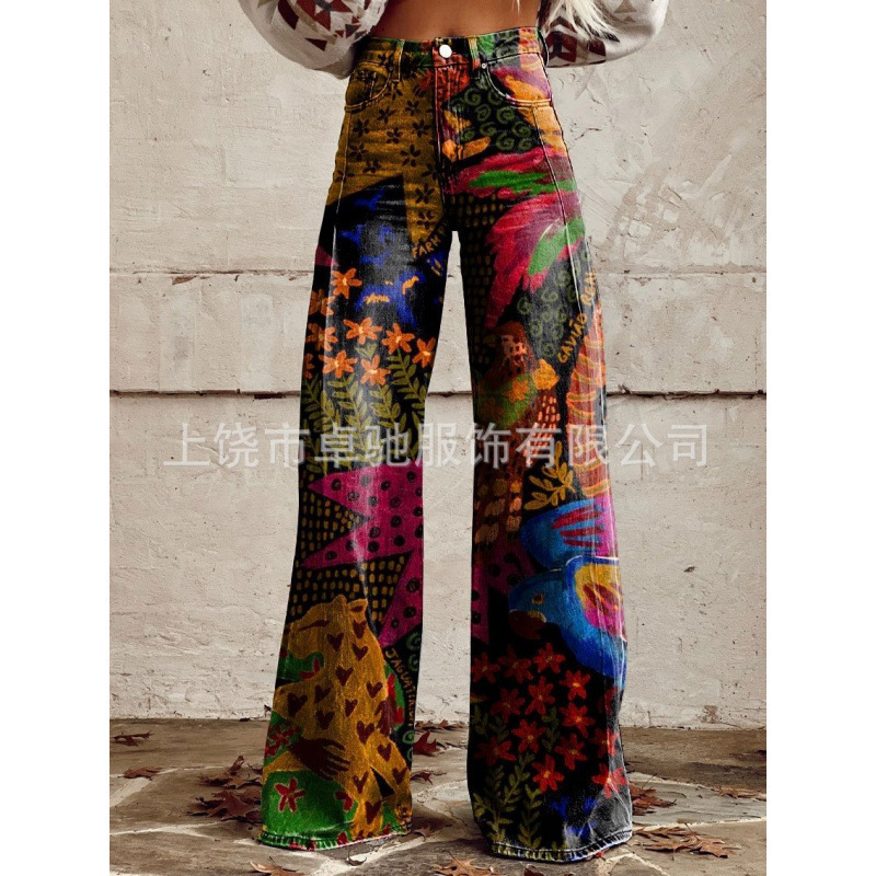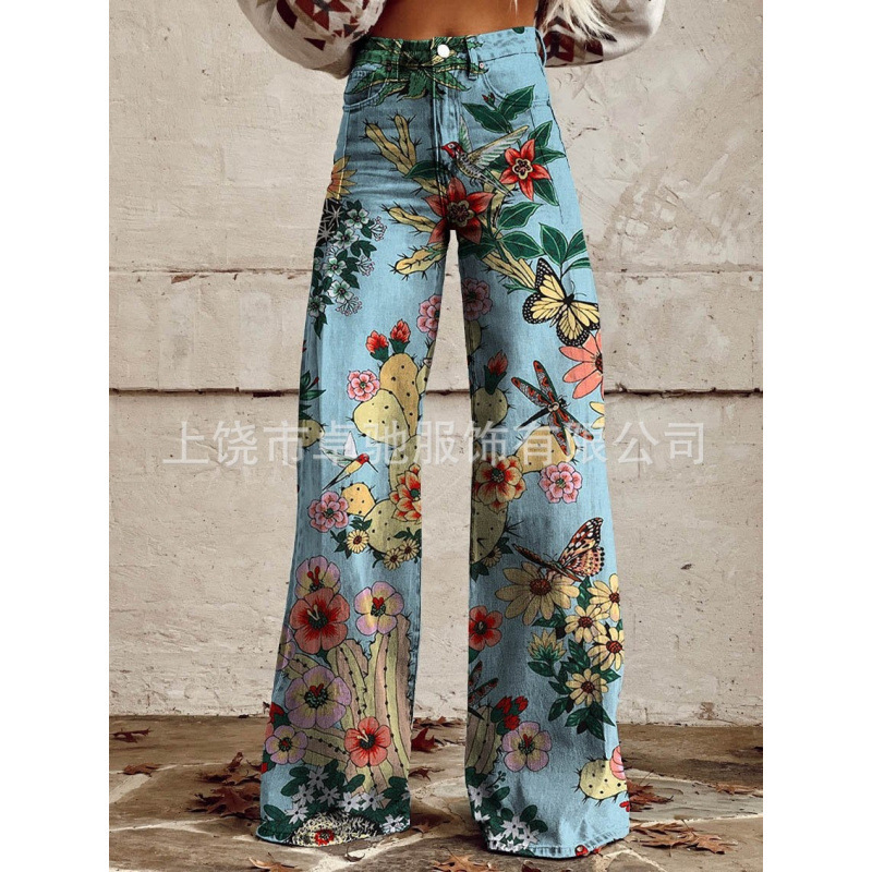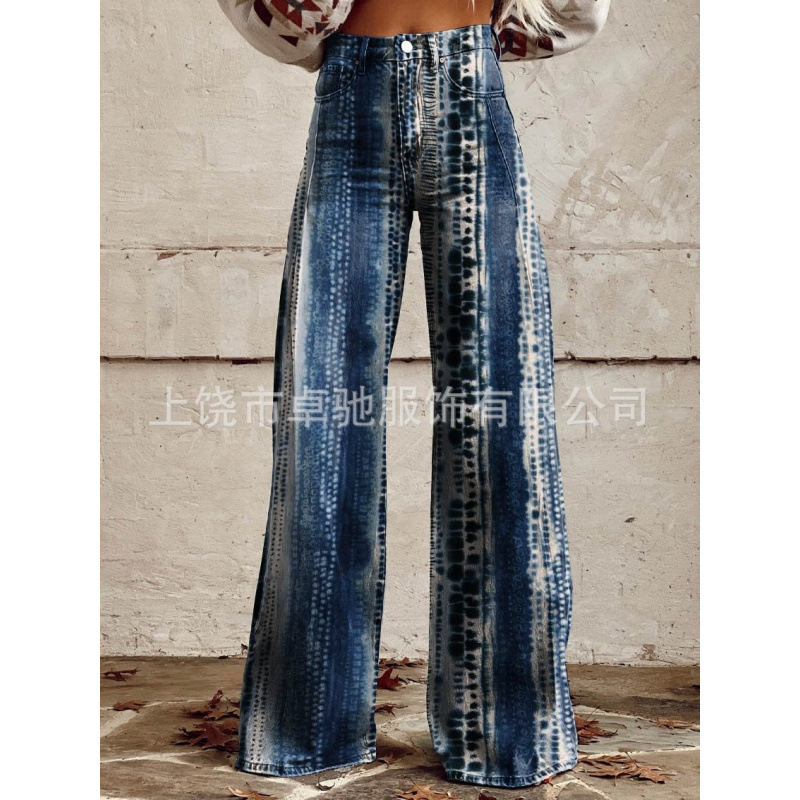 2025 독립 역 Xiyin 유럽 및 미국 대외 무역 플러스 사이즈 여성 캐주얼 바지 인쇄 모방 청바지 넓은 다리 3D 패션 여성 바지스토어 가기
