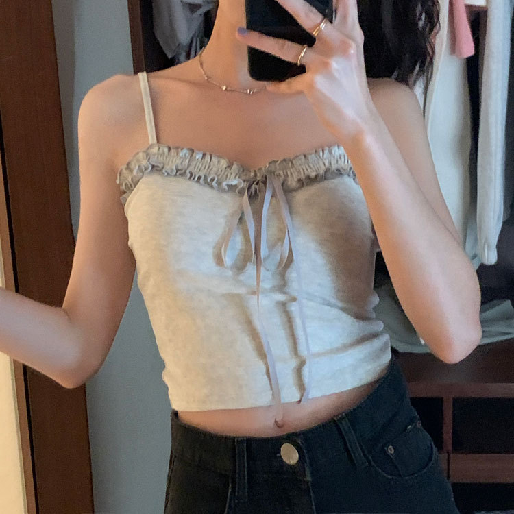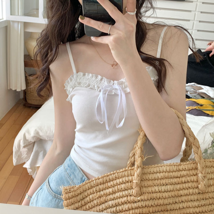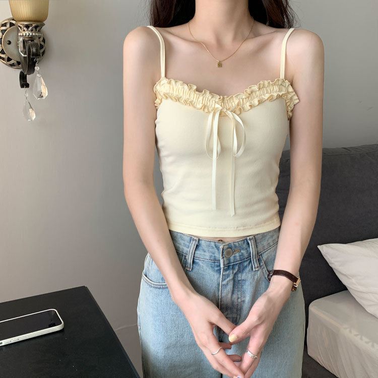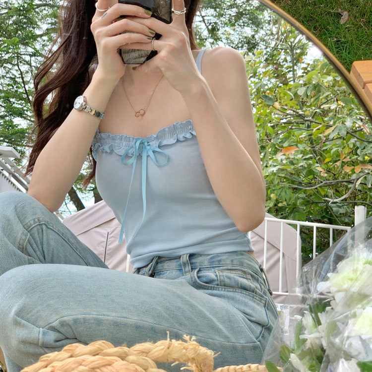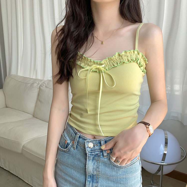 한국 스타일의 러블리한 러플 끈나시, 가슴 패드 내장, 슬림핏, 아름다운 등라인, 짧은 기장, 외출용 또는 이너웨어로 착용 가능스토어 가기