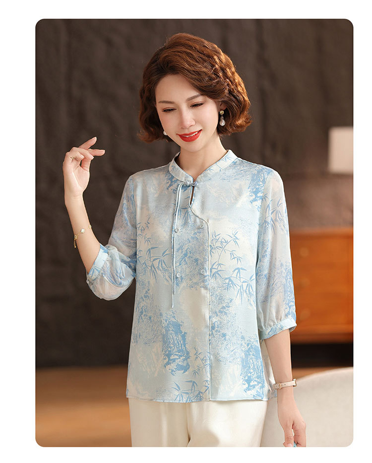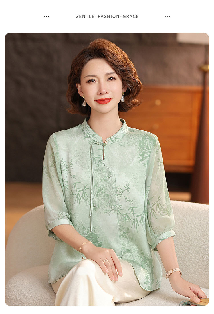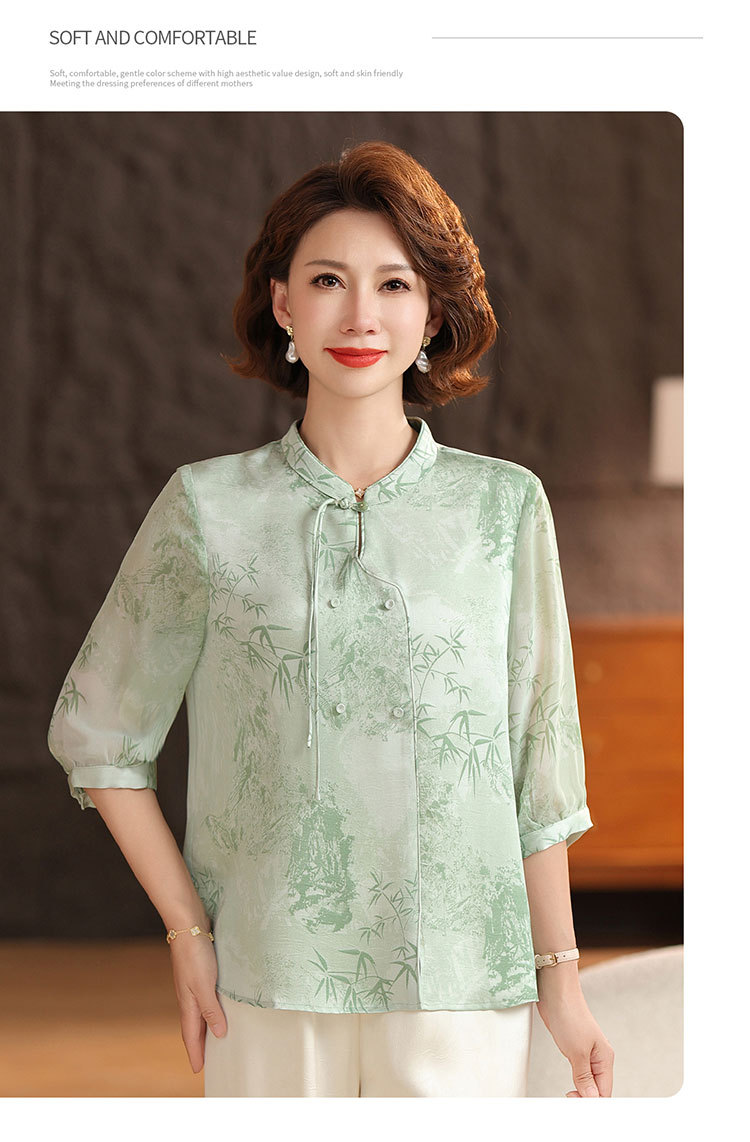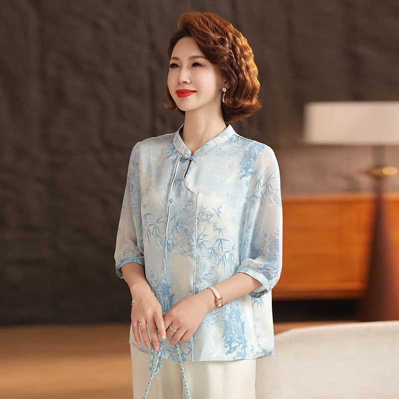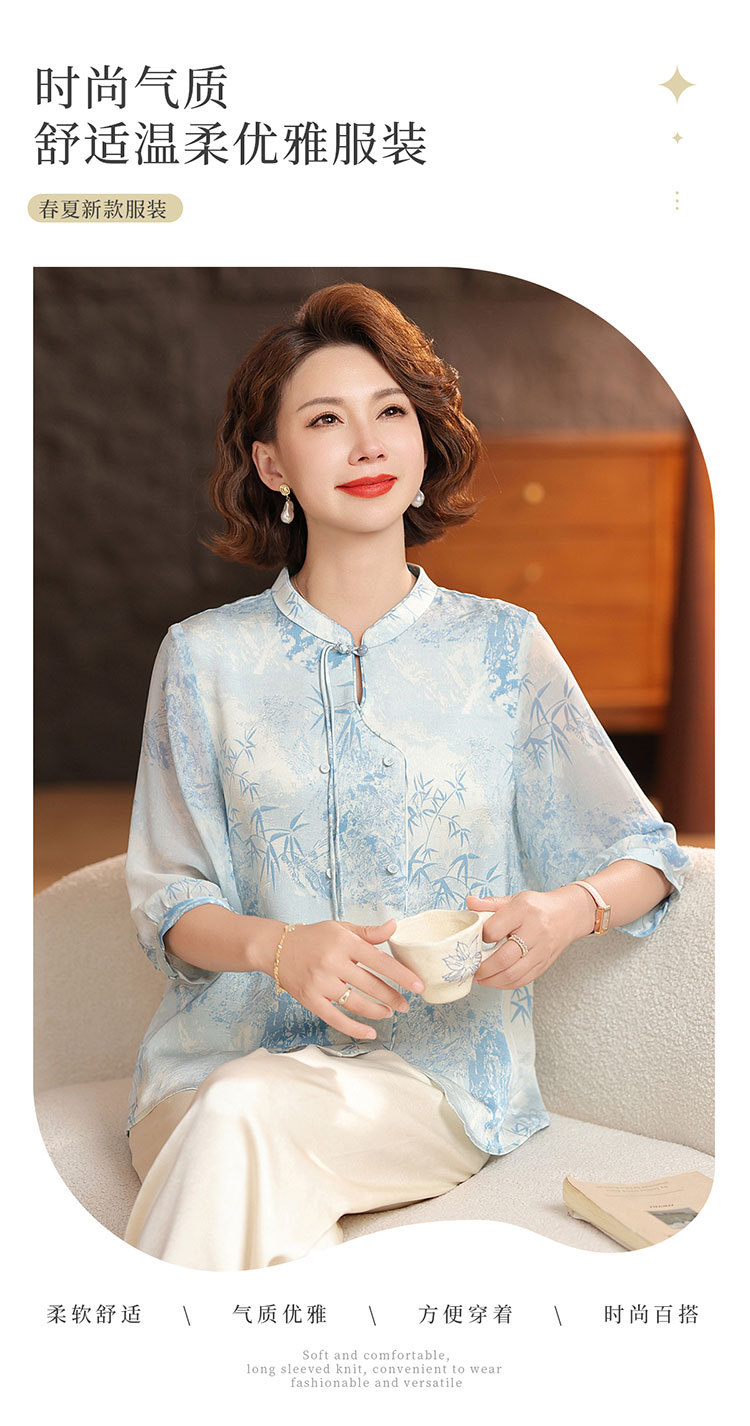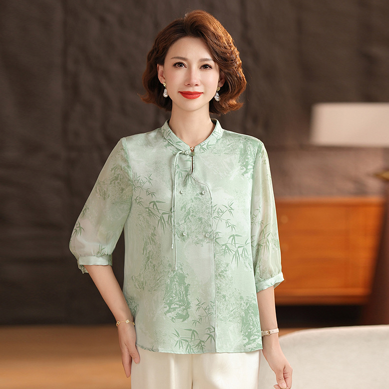 어머니 여름 원피스 세븐 슬리브 실크 셔츠 2025 새로운 스타일 여성 서양식 탑 중년 및 노인 여성 의류 국가 스타일 작은 셔츠