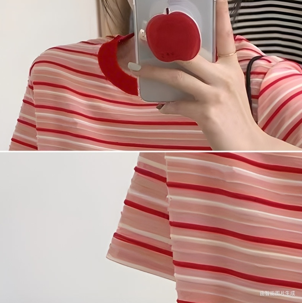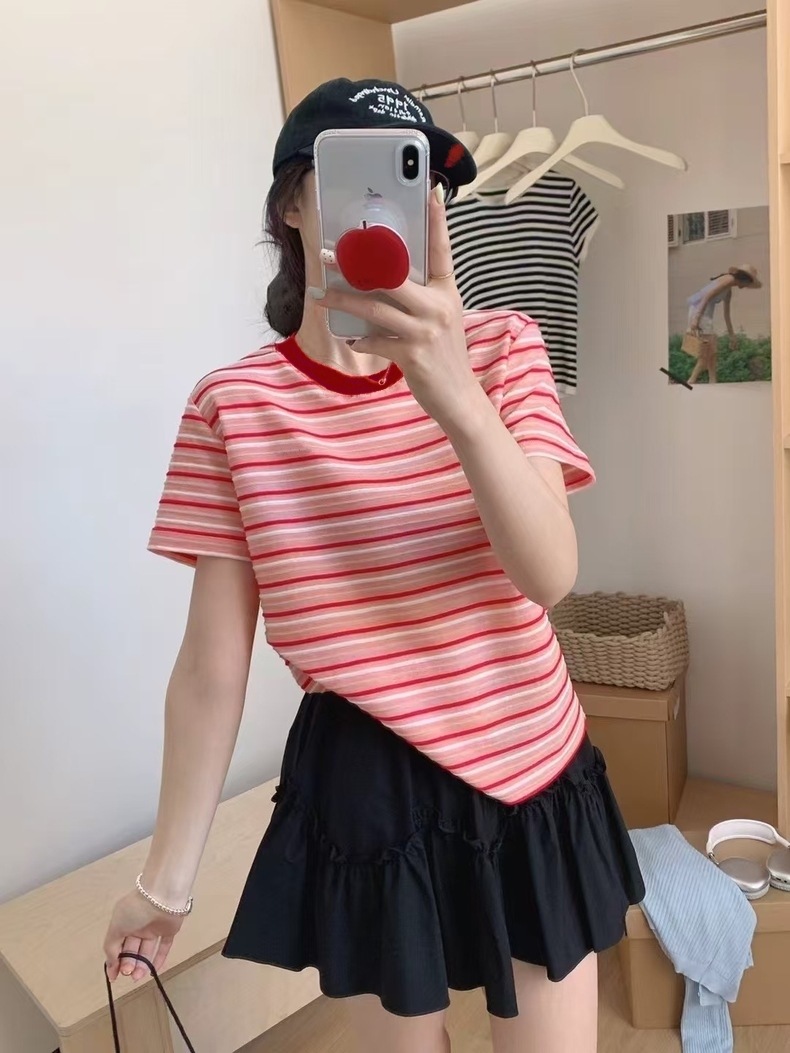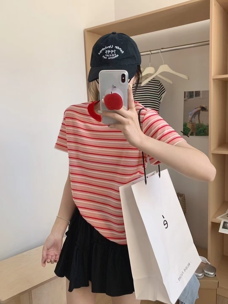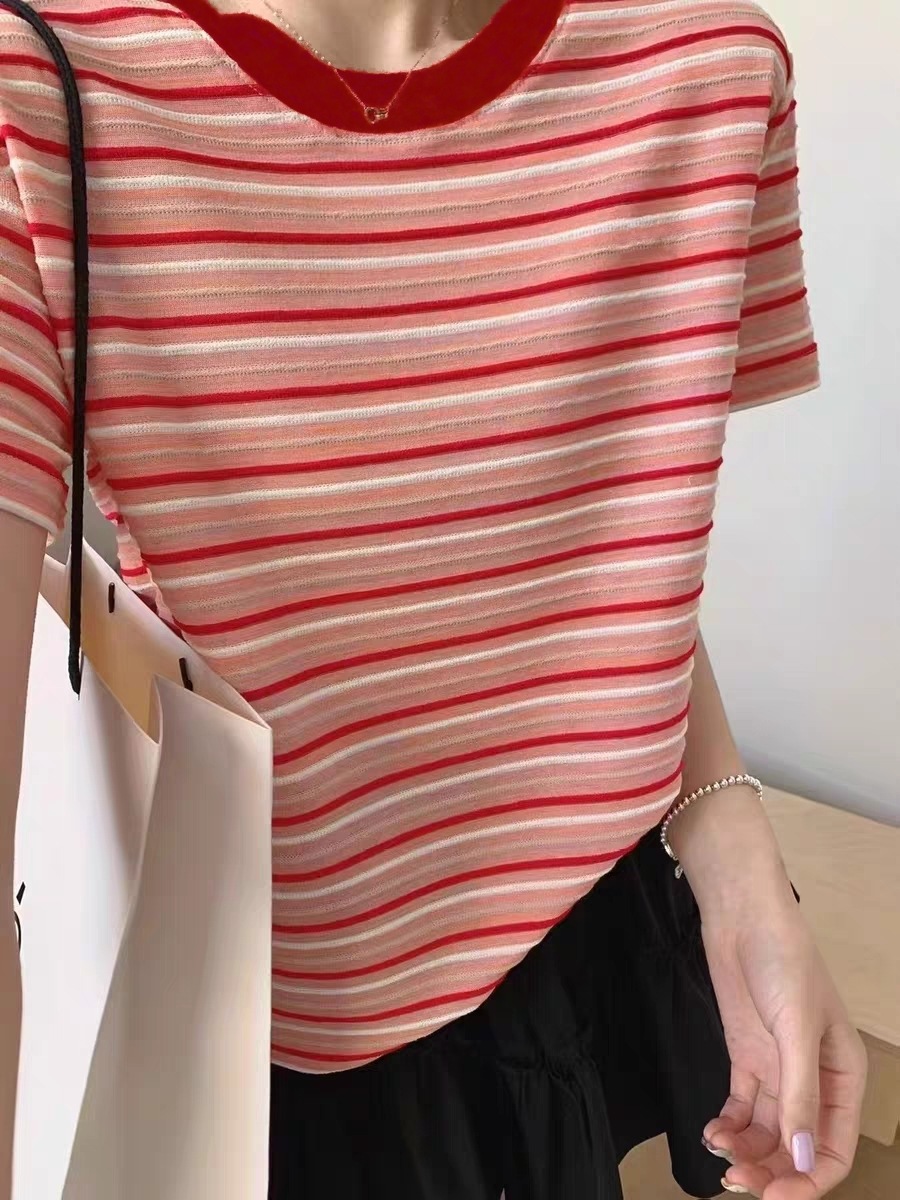 여성을위한 빨간색 대비 줄무늬 오른쪽 어깨 반팔 티셔츠 2025 여름 새로운 느슨한 캐주얼 바닥 셔츠 라운드 넥 탑스토어 가기
