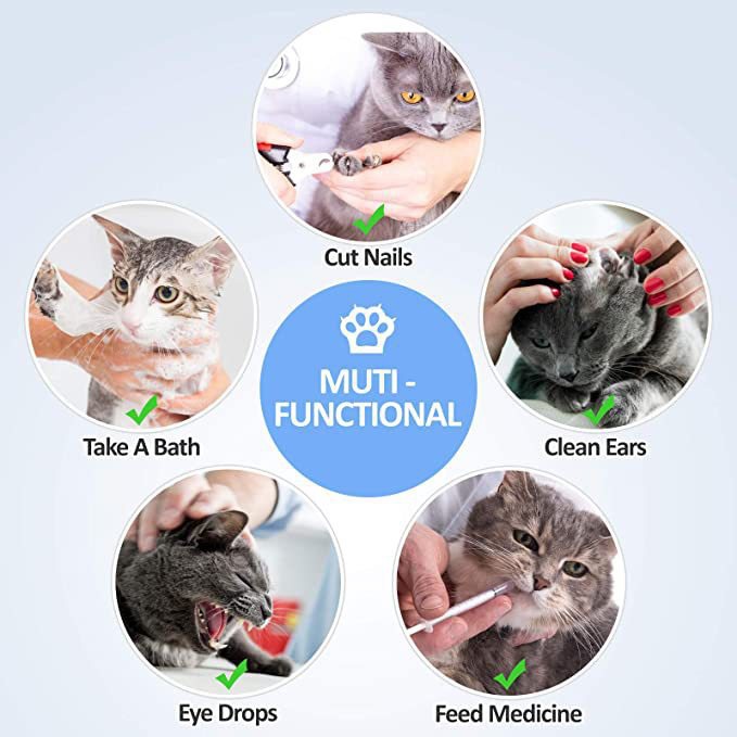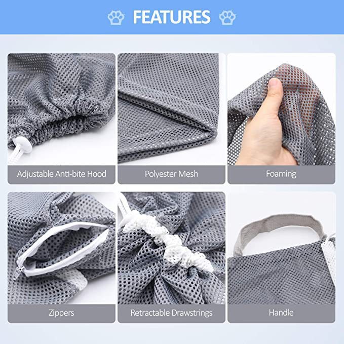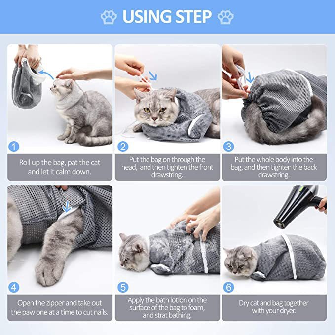 功能:猫浴袋非常适合沐浴/指甲修剪/服用药/牙齿和耳朵清洁/滴药/注射等其他场合,易于照顾您的猫和小狗