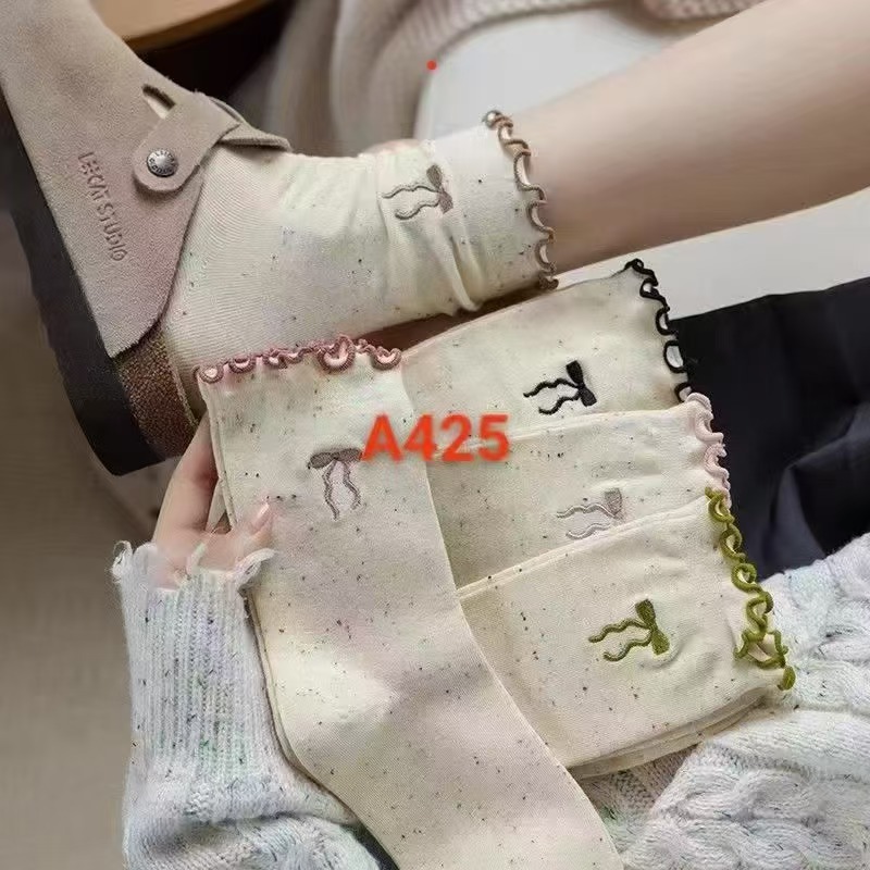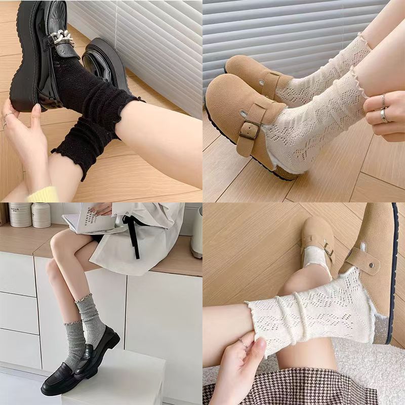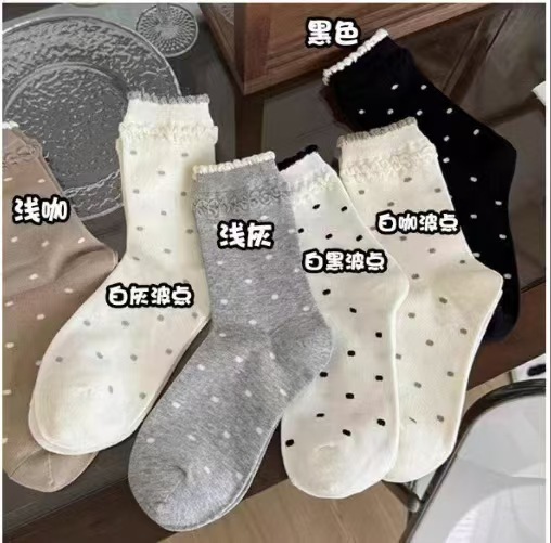 • 미드 종아리 양말 [솔리드 컬러 더블 레이스 도트무늬]