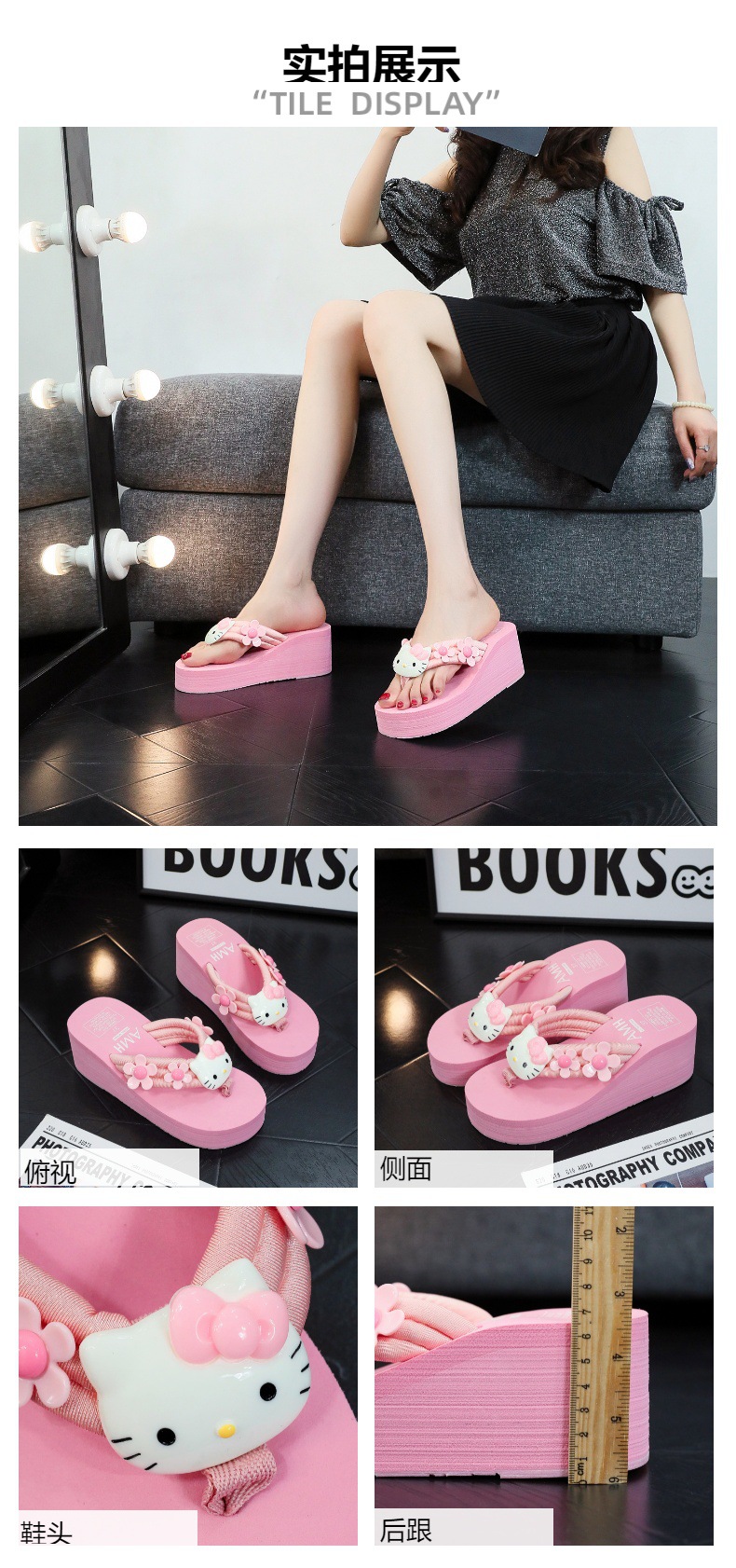 Ins 여름 새로운 데이지 플라워 플립 플롭 키티 키티 키티 라인스톤 샌들 여성용 클립 토 웨지 비치 슈즈스토어 가기