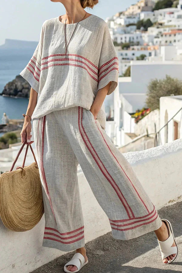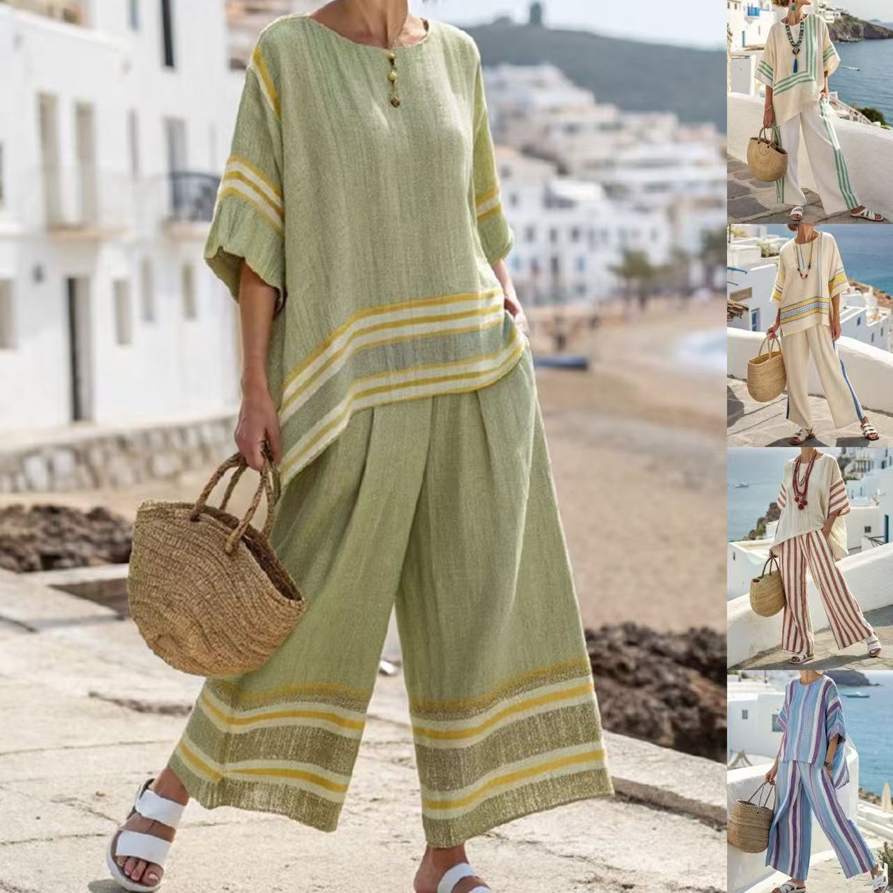 유럽과 미국 국경 여름 여성의 새로운 줄무늬 색상 매칭 스티칭 소매 라운드 넥 탑 스트레이트 캐주얼 바지 세트
