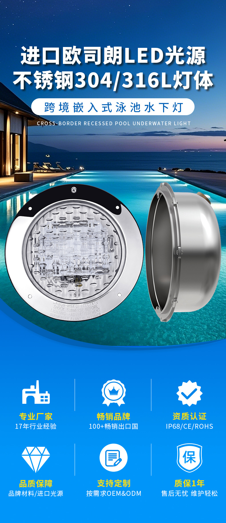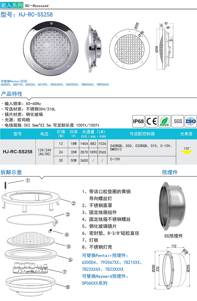 유럽과 북미 국경 수영장 빛 12V 홍수 빛 임베디드 RGB 수중 스포트라이트 교체 가능한 윅 임베디드 부품