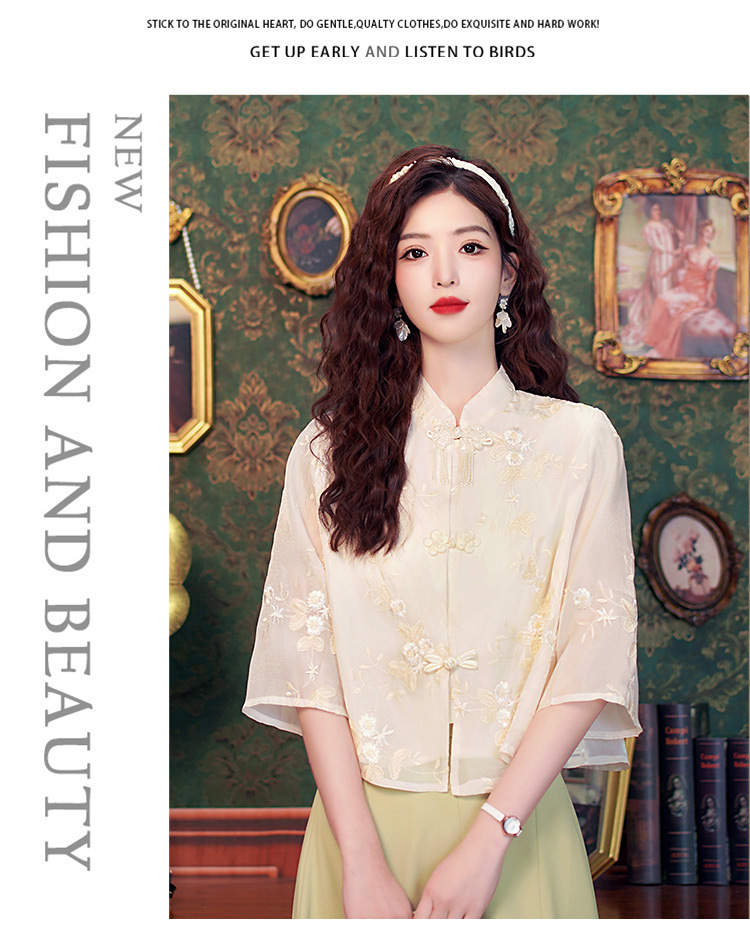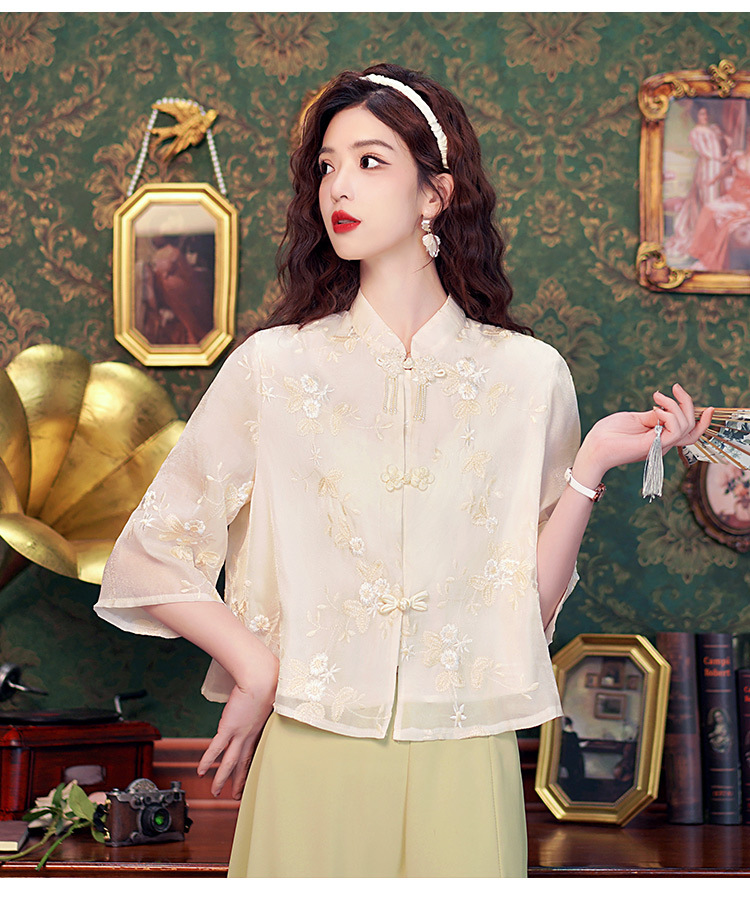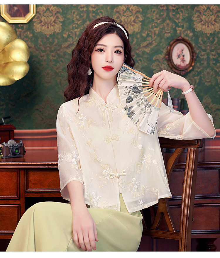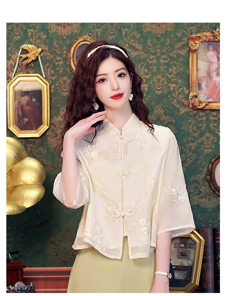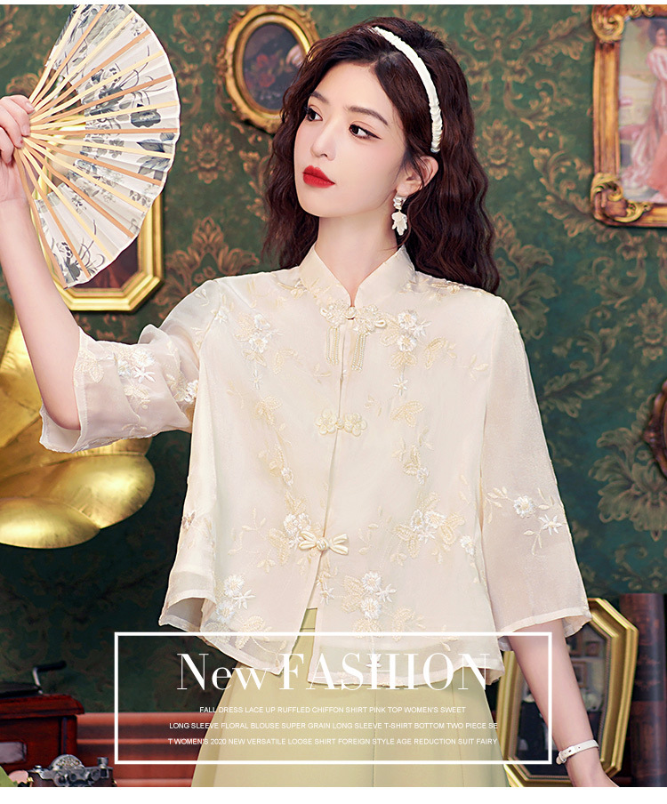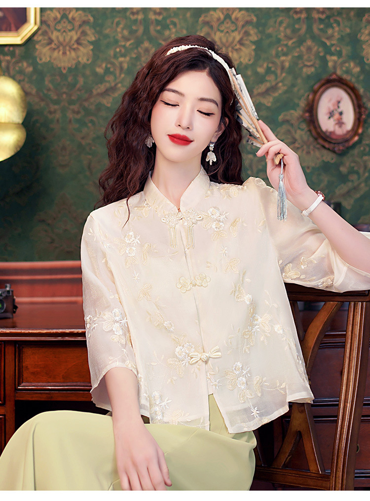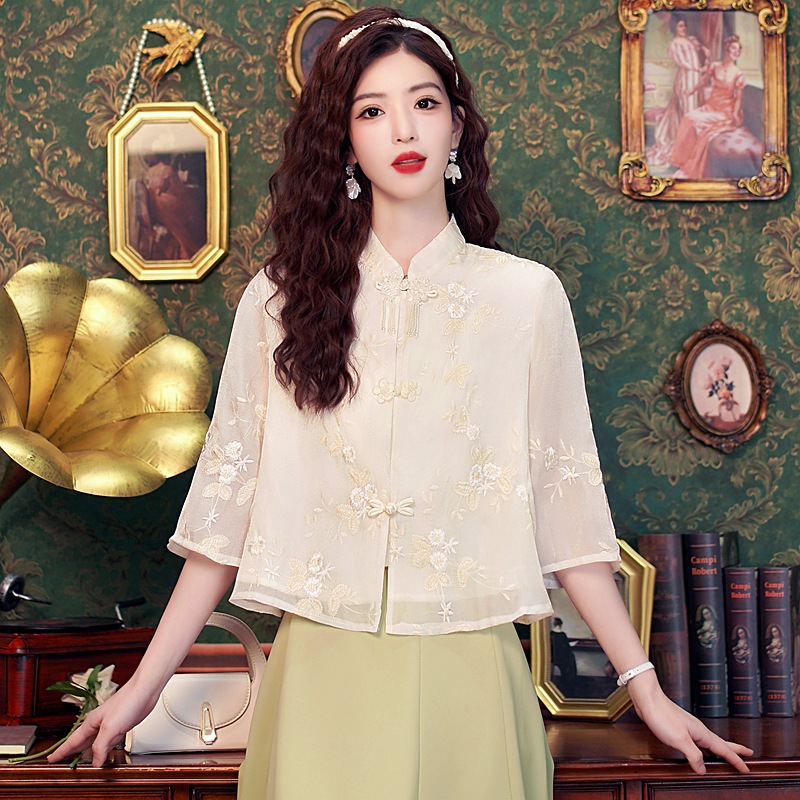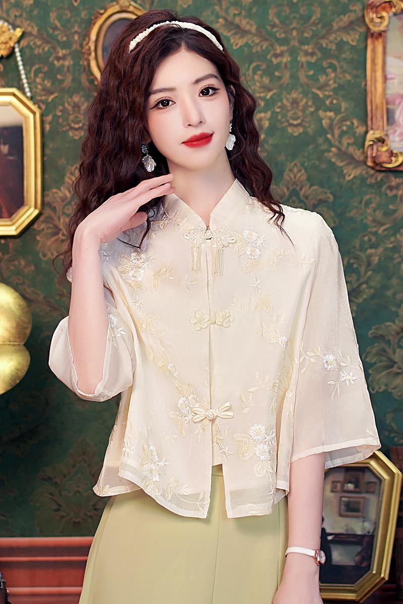 새로운 중국 스타일 국가 스타일 선 스타일 개선 된 청삼 중공업 수 놓은 버클 세븐 포인트 슬리브 탑 여성의 2024 여름 셔츠