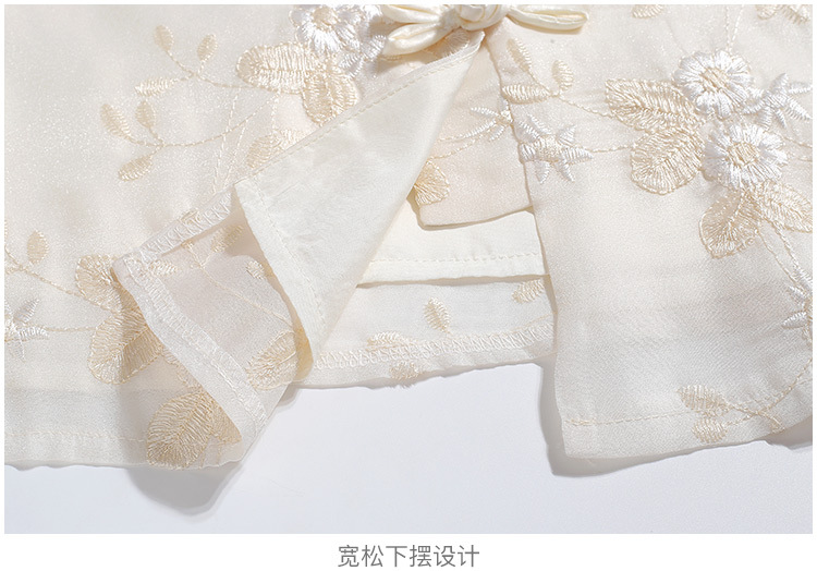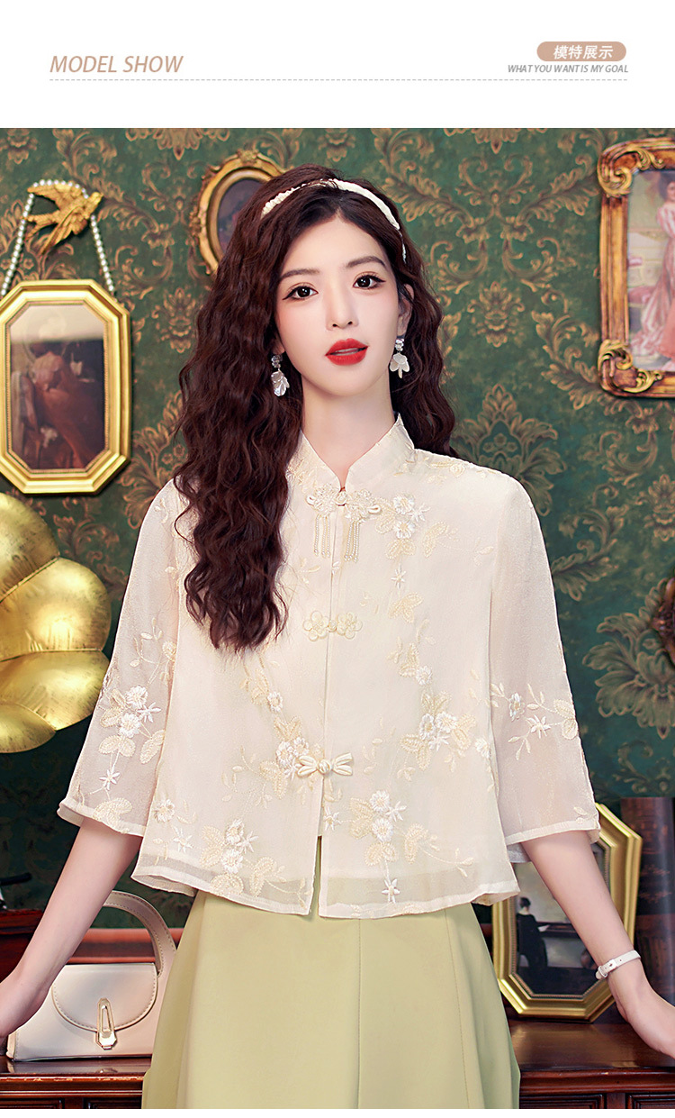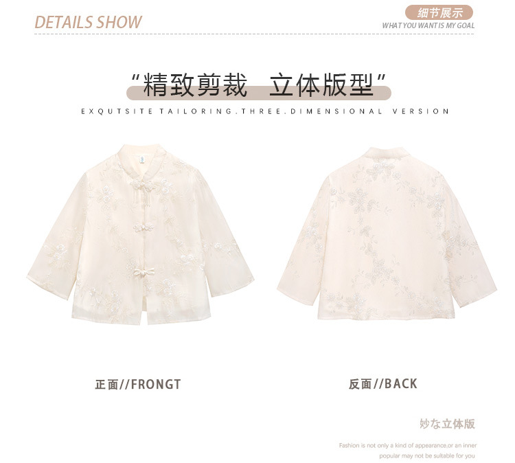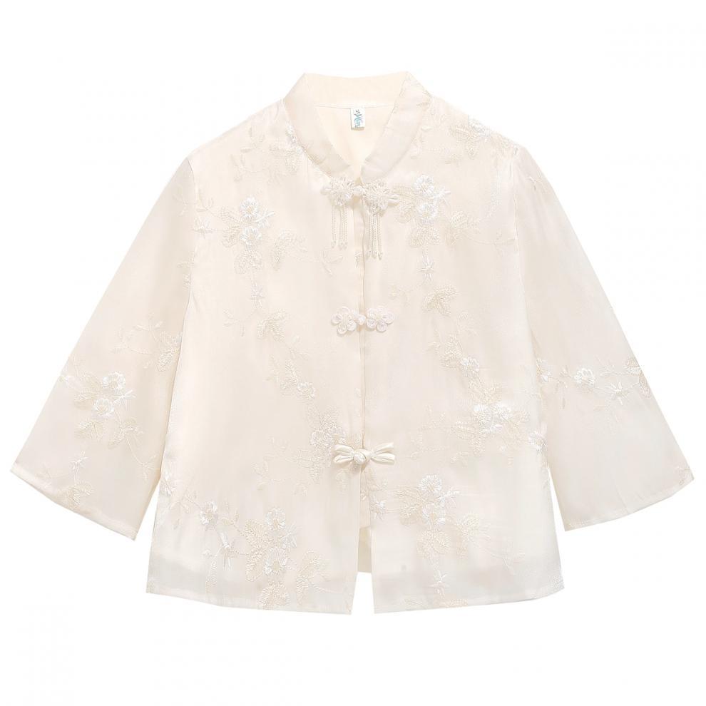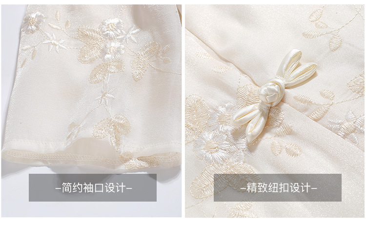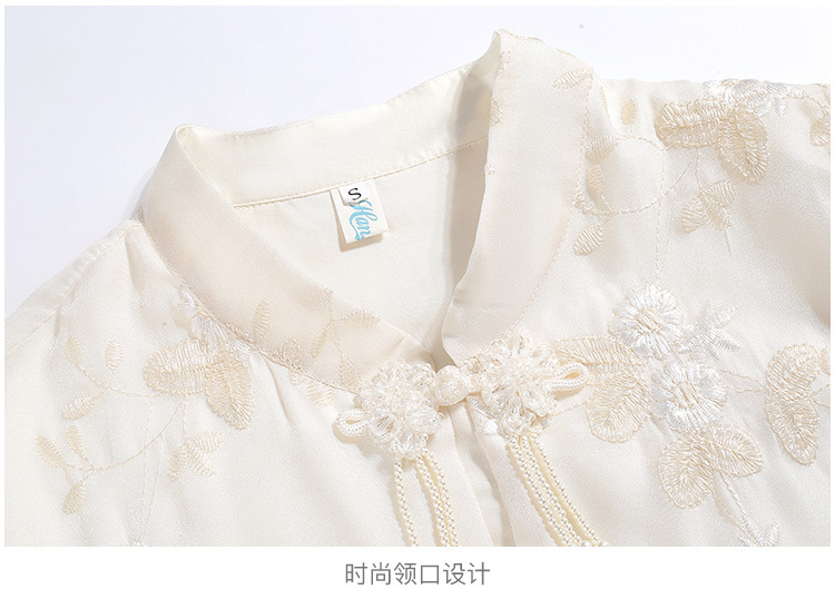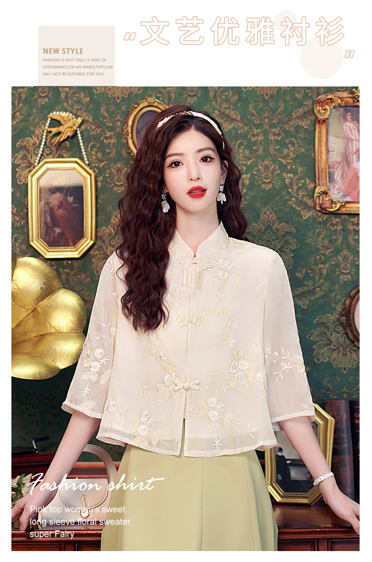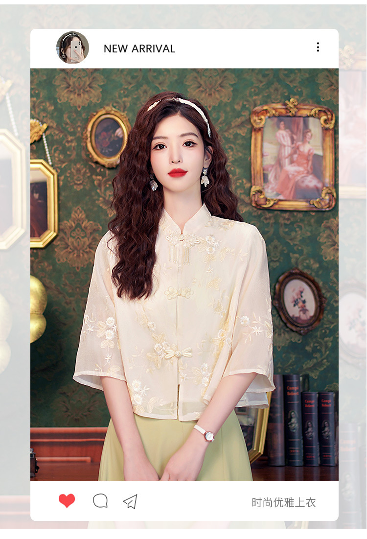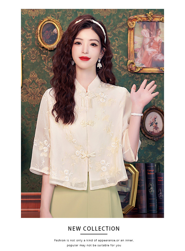 새로운 중국 스타일 국가 스타일 선 스타일 개선 된 청삼 중공업 수 놓은 버클 세븐 포인트 슬리브 탑 여성의 2024 여름 셔츠