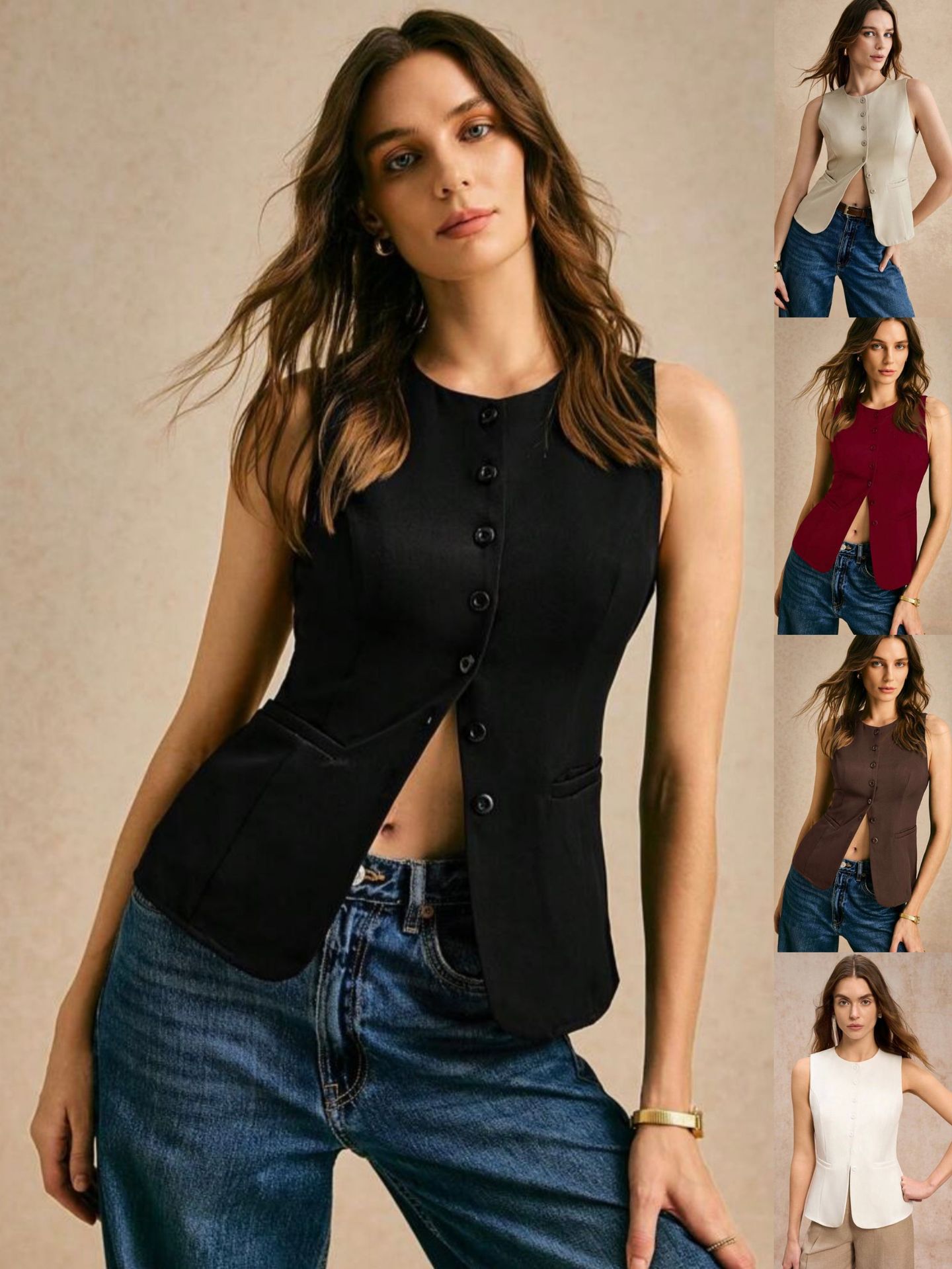 여름 유럽과 미국 여성의 국경 새로운 통근 간단한 패션 버튼 단색 조끼 캐주얼 탑 라운드 넥 조끼스토어 가기
