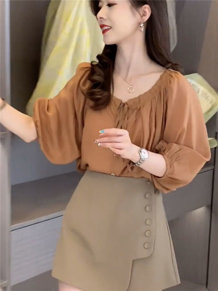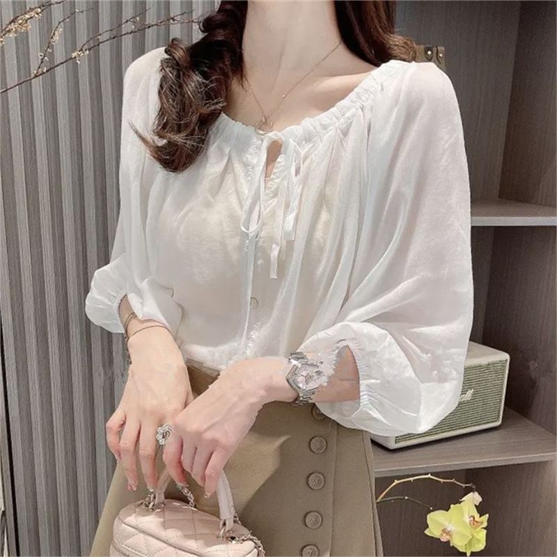 여름 여성을 위한 프렌치 니치 7부 소매 쉬폰 셔츠, 새로운 디자인, 패셔너블한 퍼프 슬리브, 시크 탑