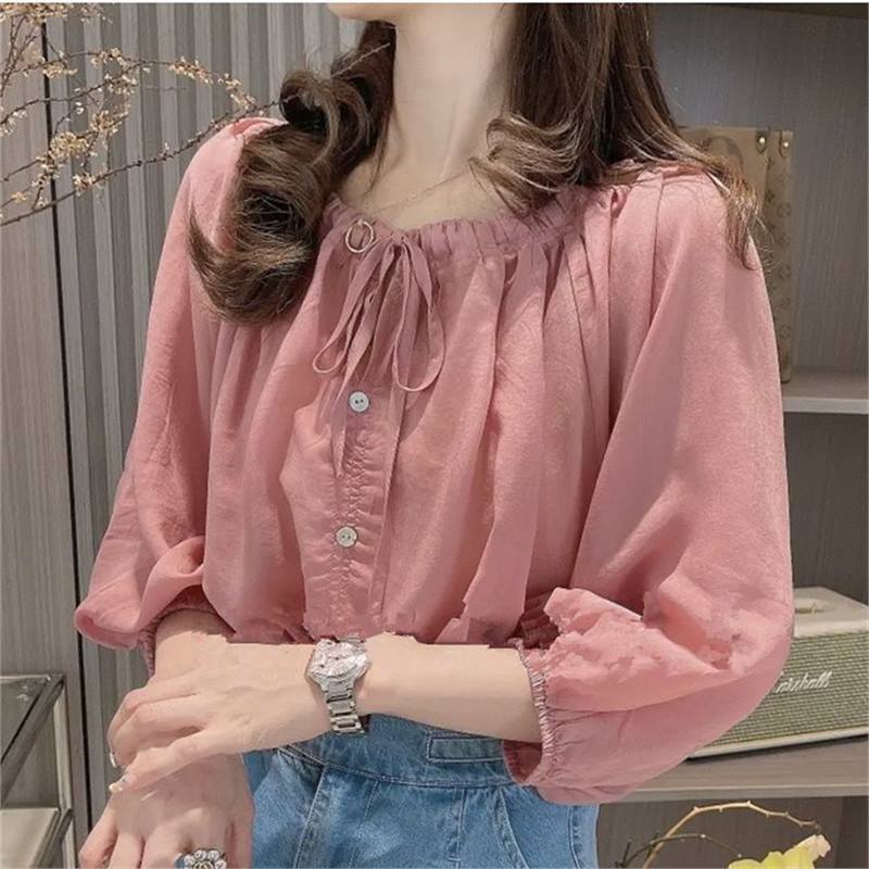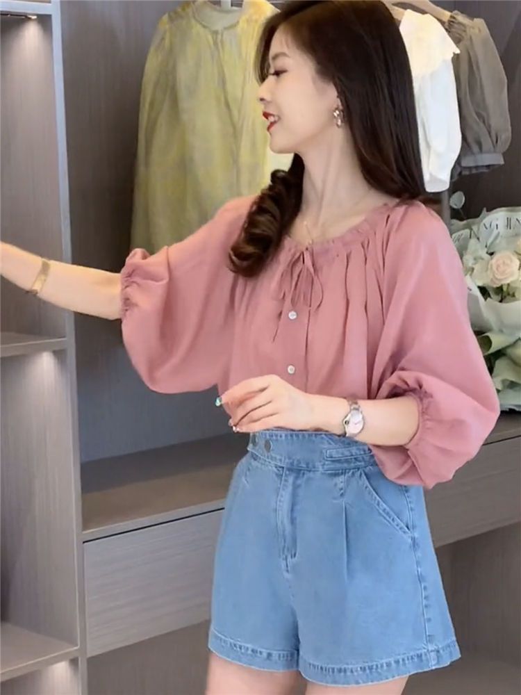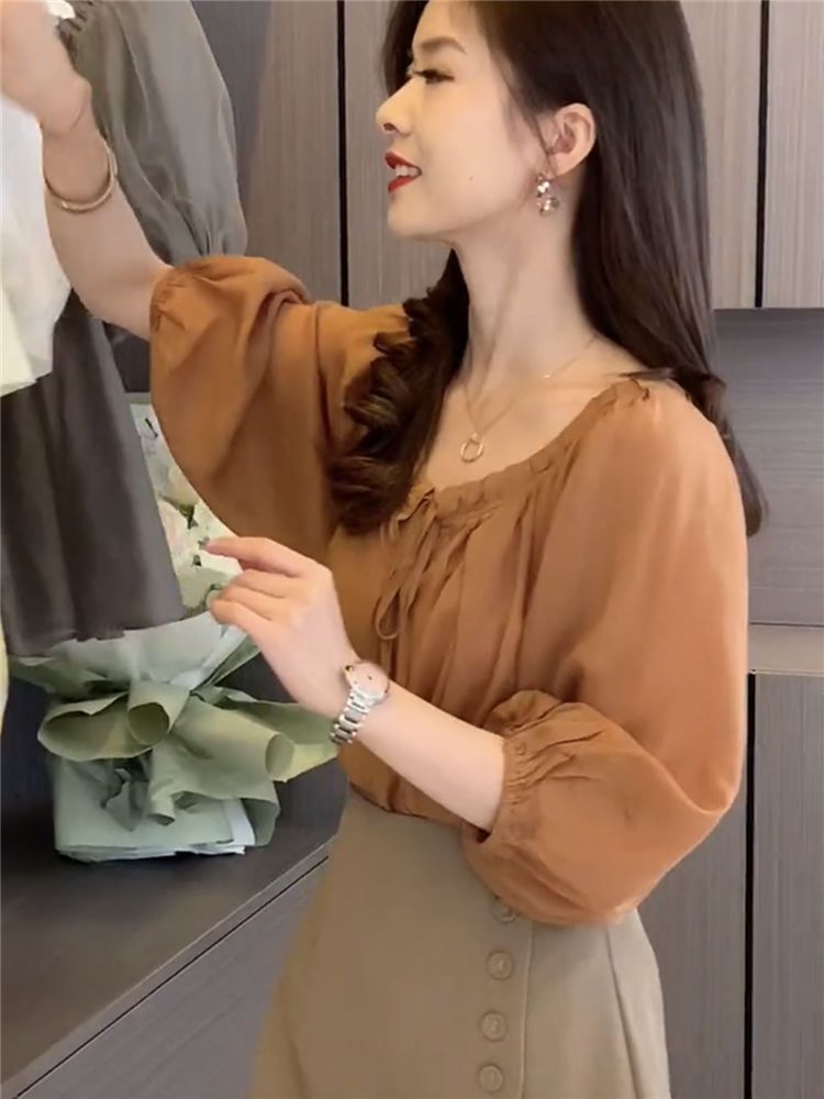 여름 여성을 위한 프렌치 니치 7부 소매 쉬폰 셔츠, 새로운 디자인, 패셔너블한 퍼프 슬리브, 시크 탑스토어 가기