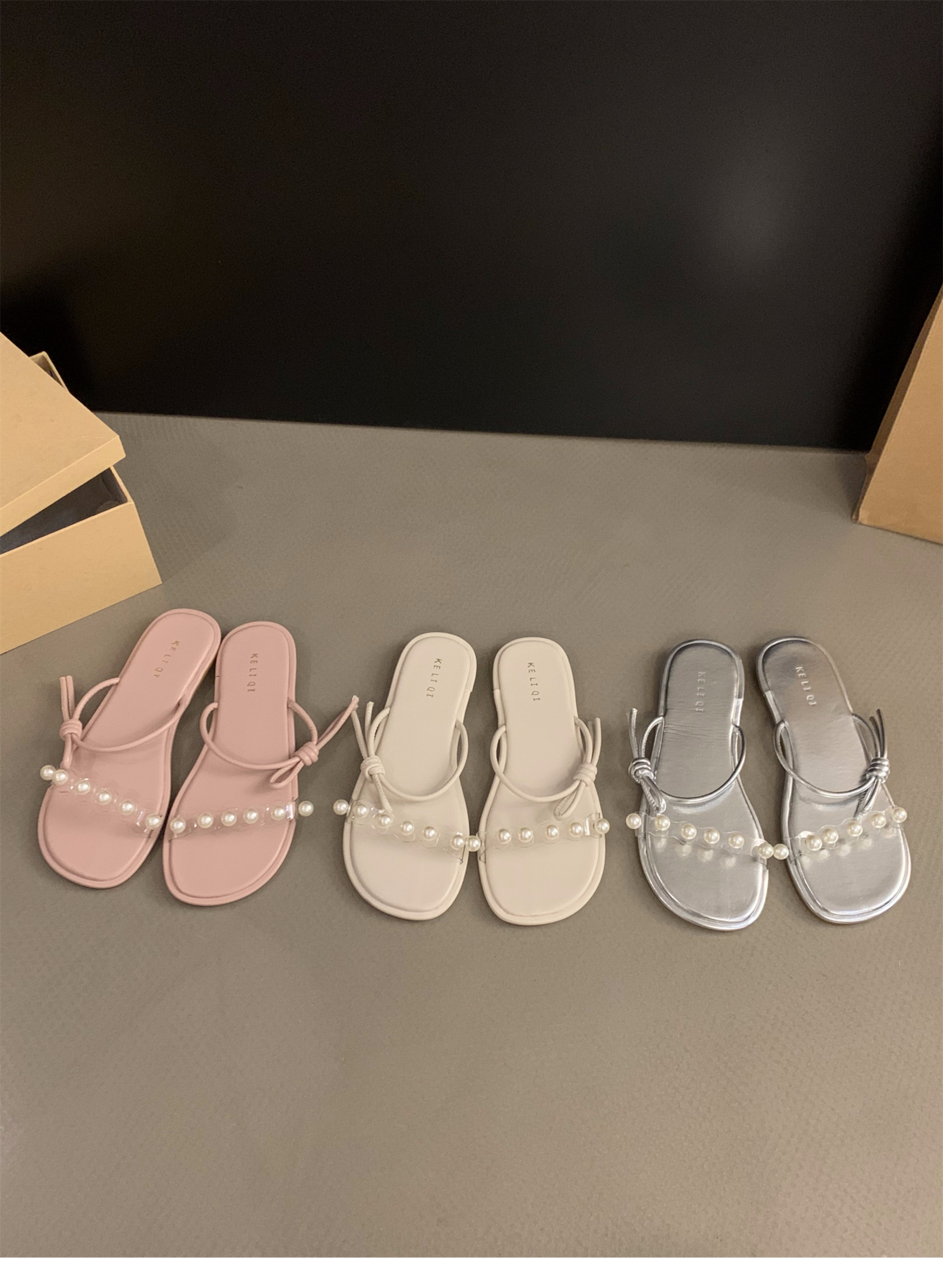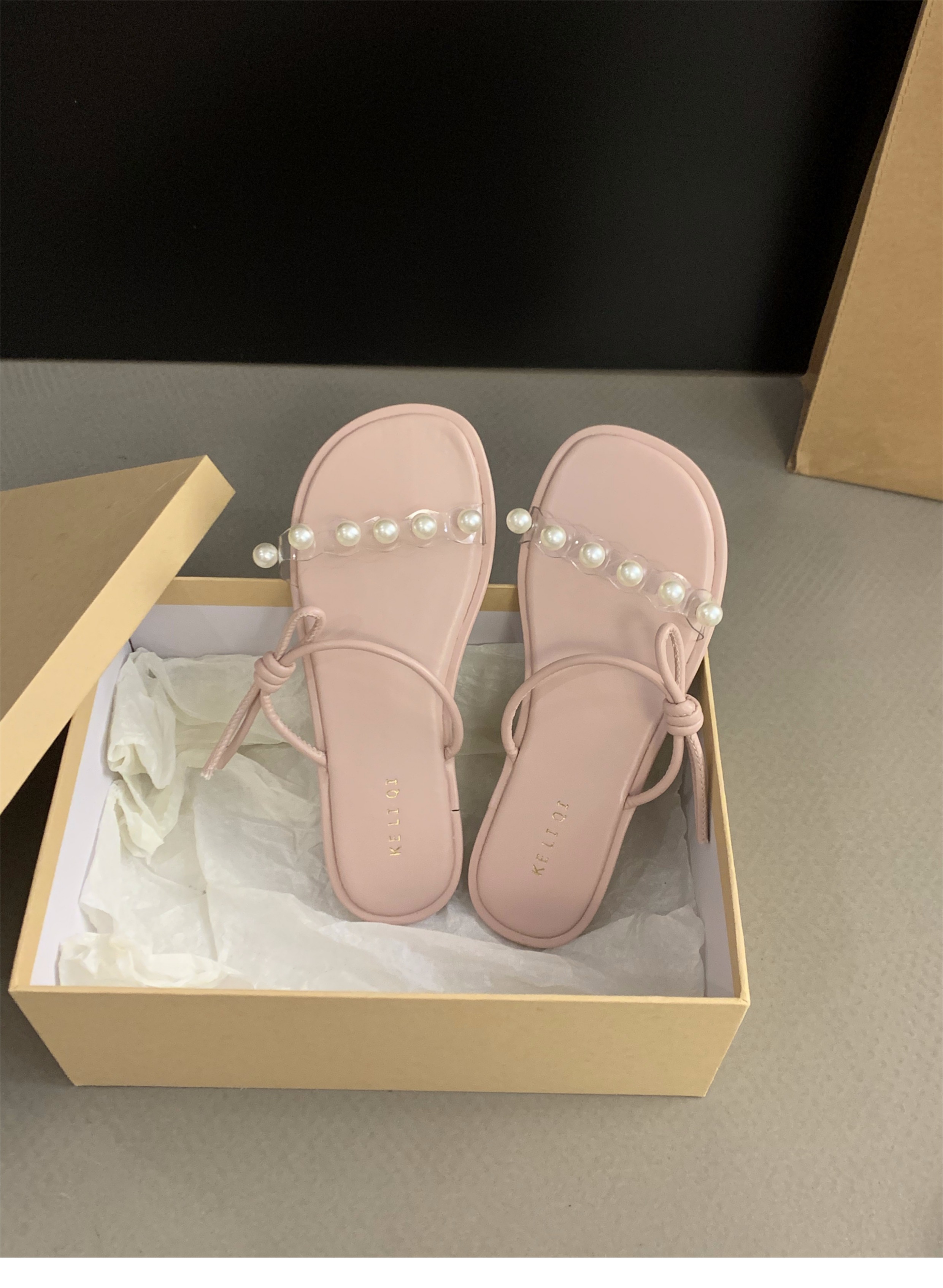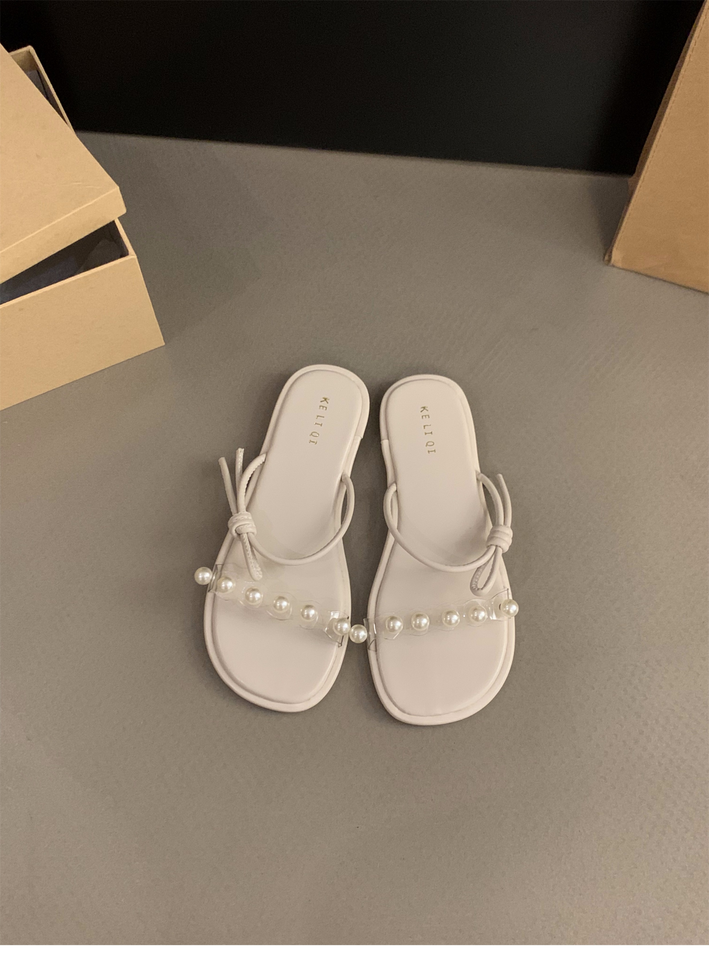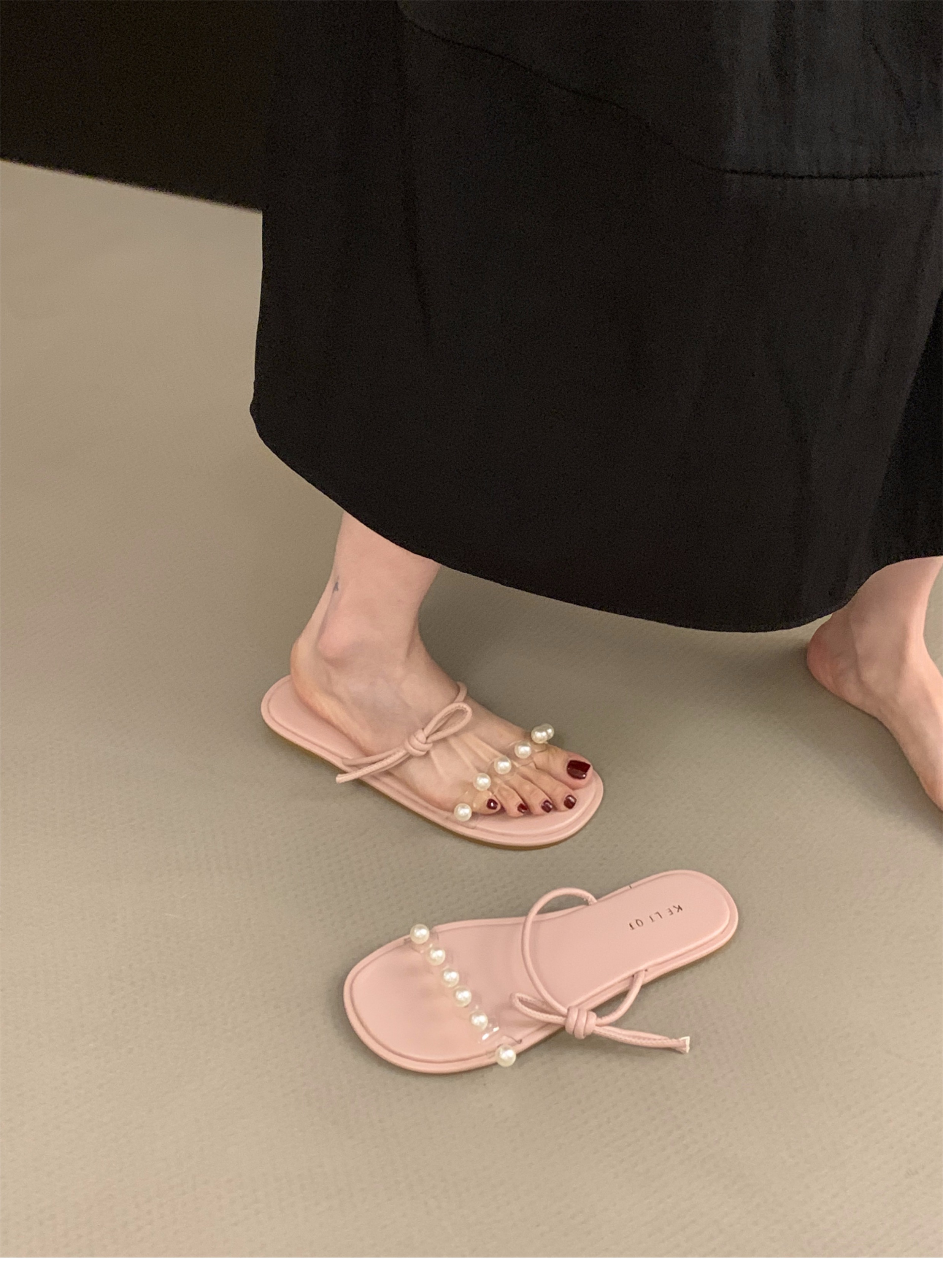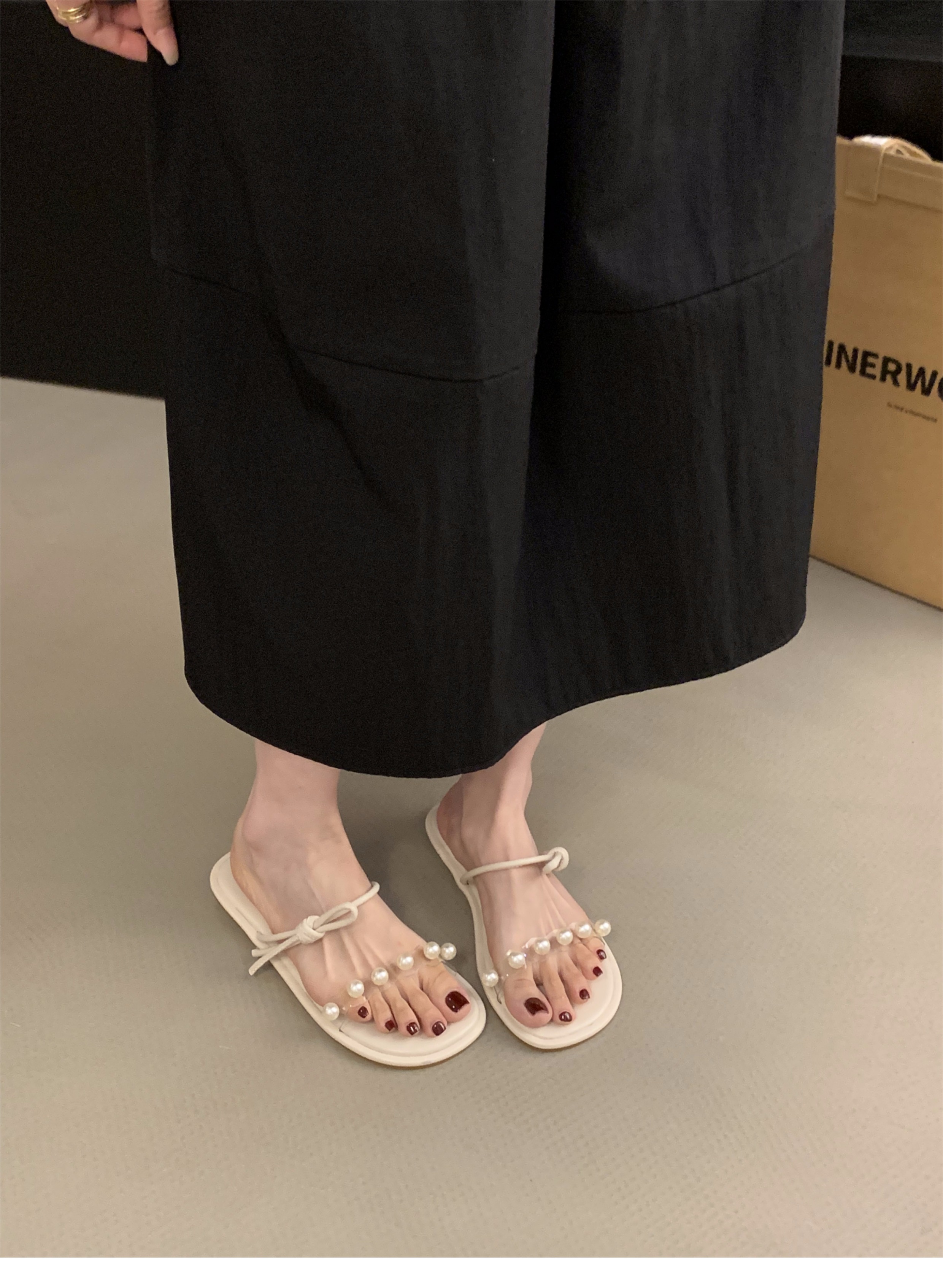 평면 프랑스 작은 샌들 투명 벨트 슬리퍼 요정 신발 2025 새로운 여름 외부 진주 샌들스토어 가기