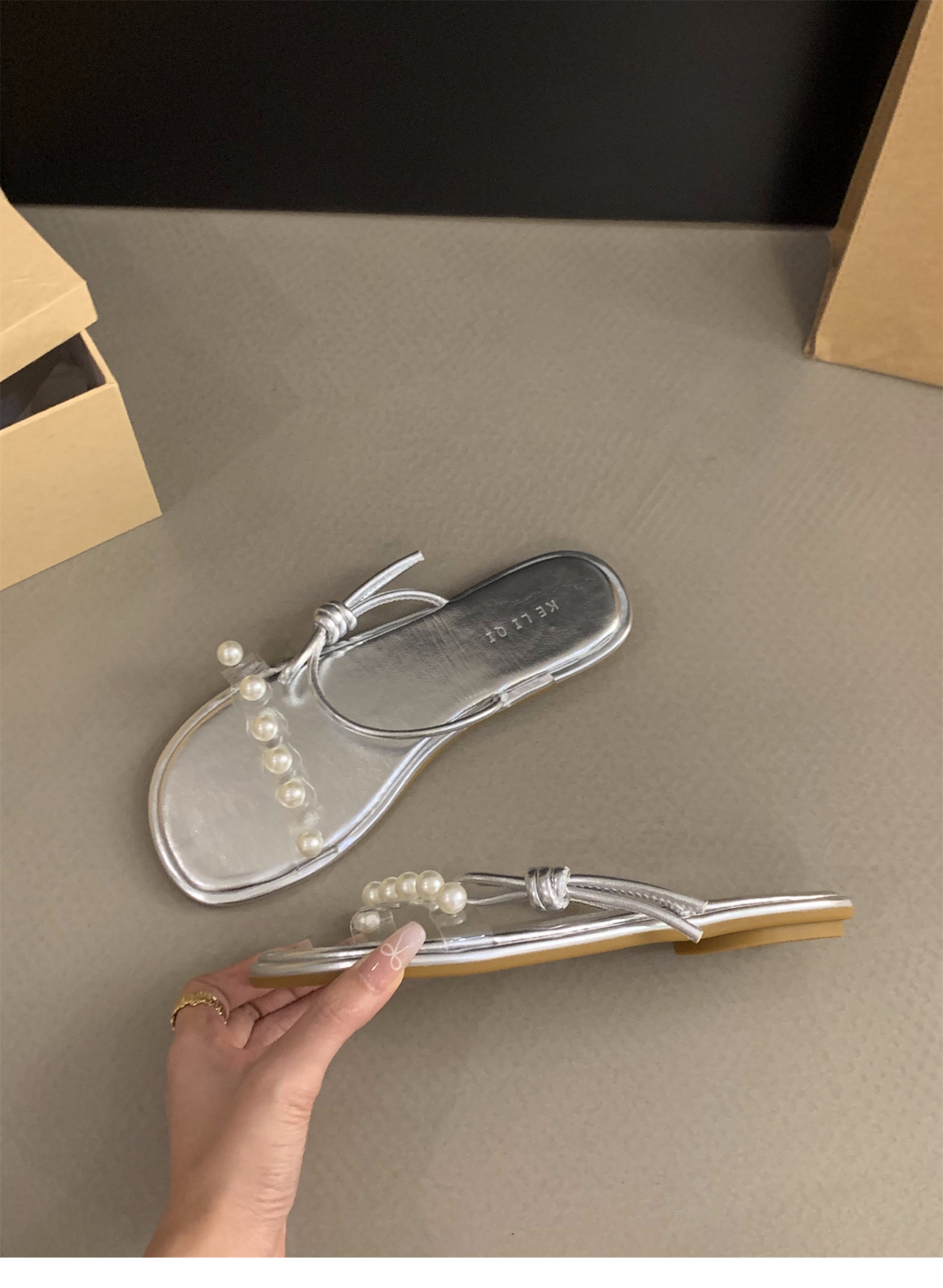 평면 프랑스 작은 샌들 투명 벨트 슬리퍼 요정 신발 2025 새로운 여름 외부 진주 샌들