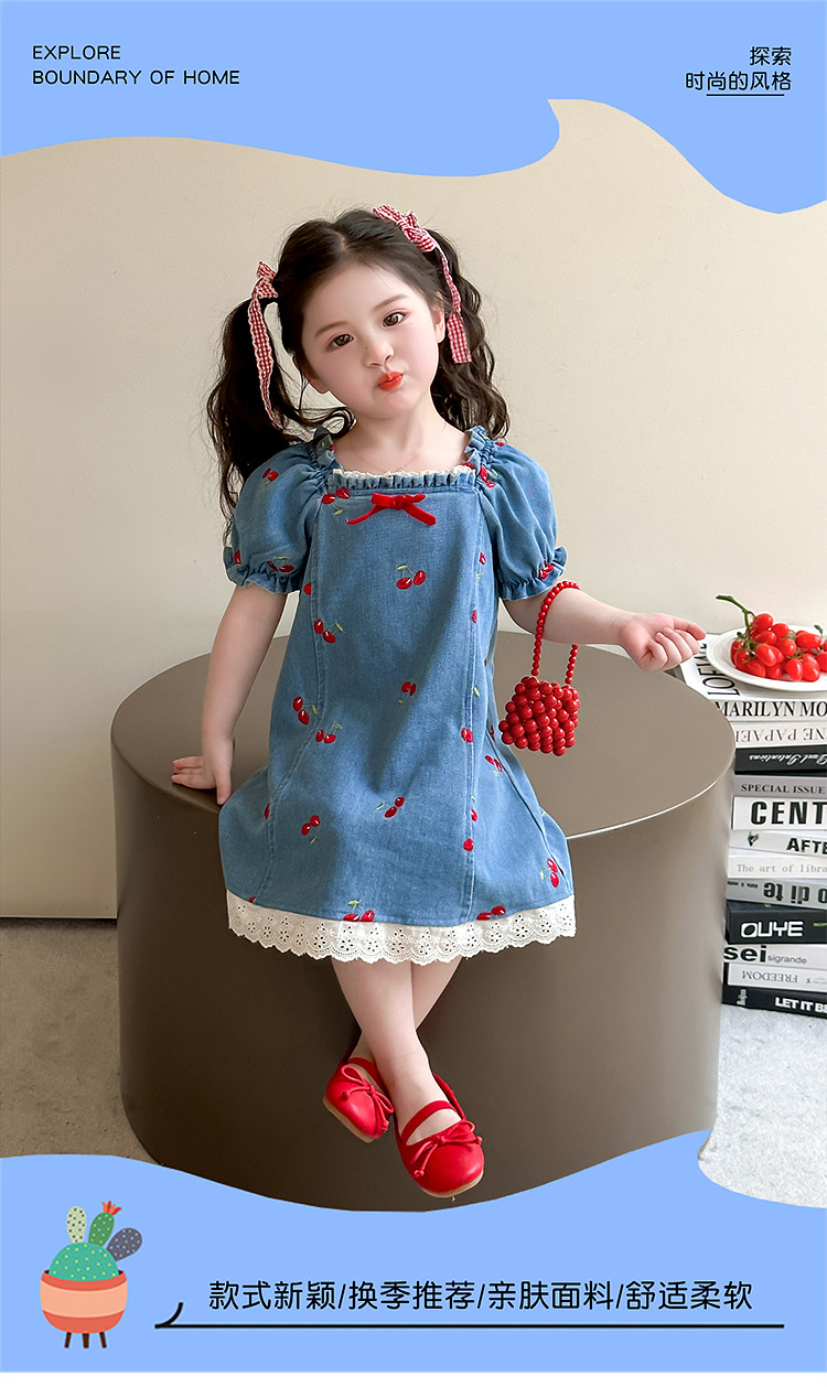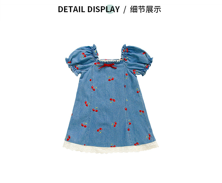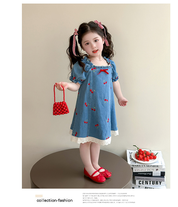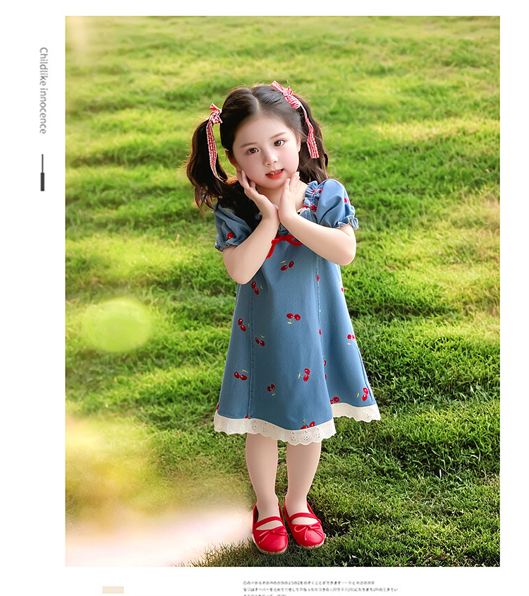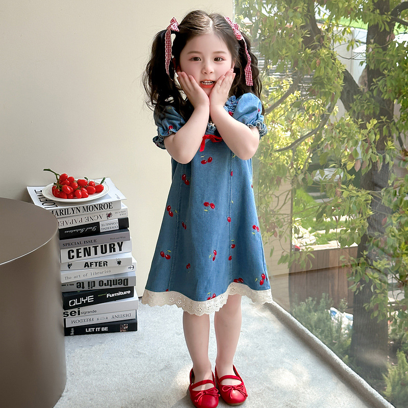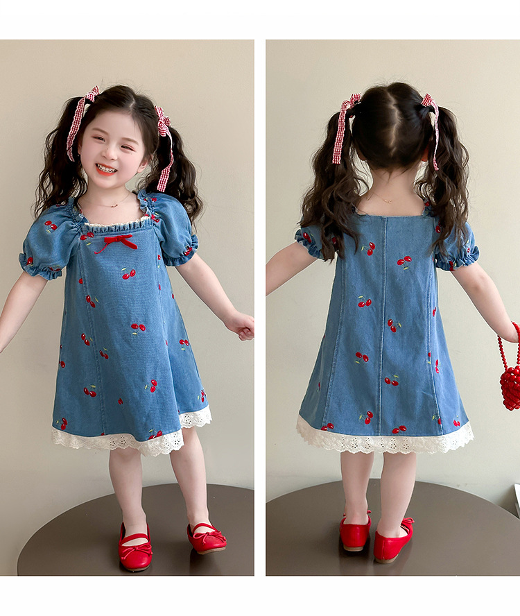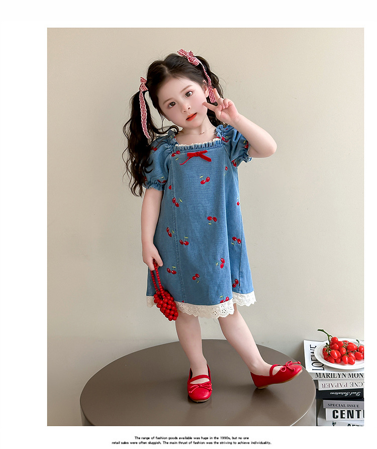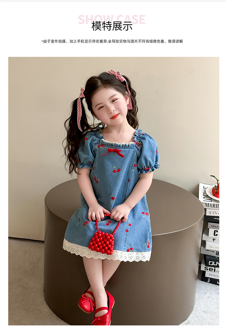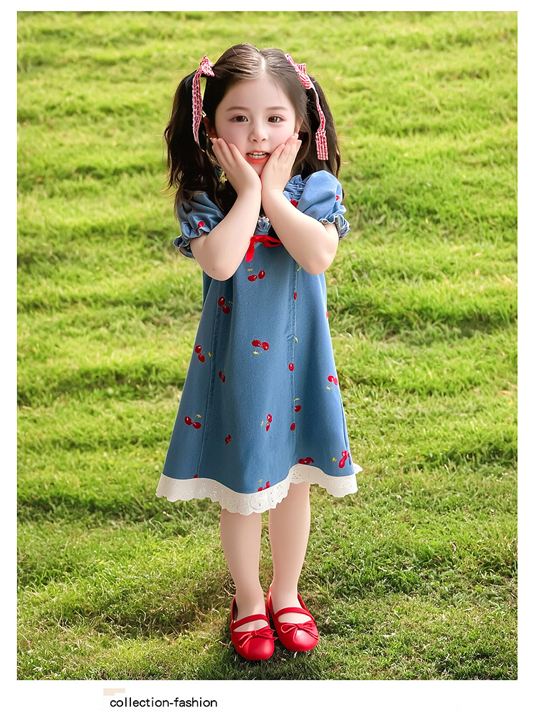 크로스보더 여아 체리 자수 데님 원피스 아동 한국 스타일 패션 어린 소녀들을 위한 세련된 공주 드레스 (중소 아동용)스토어 가기