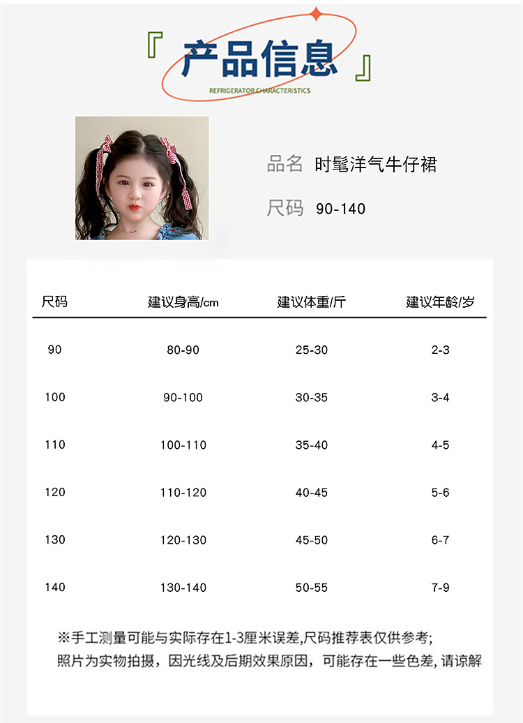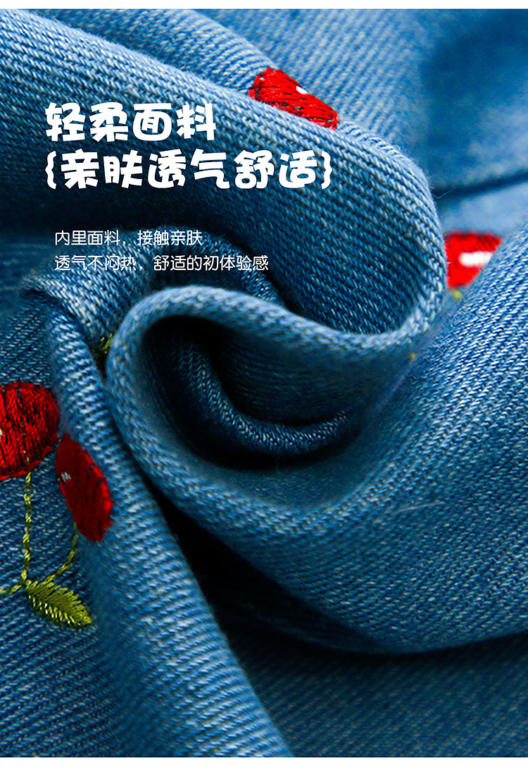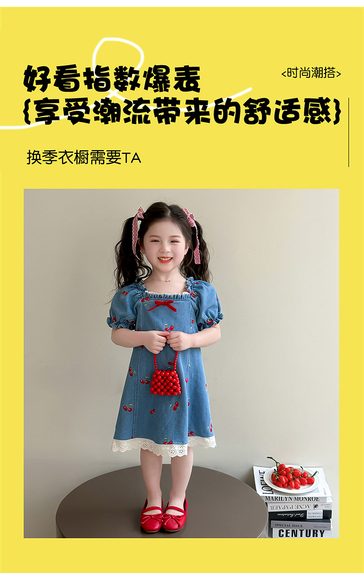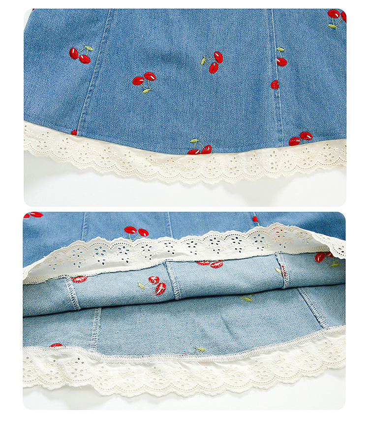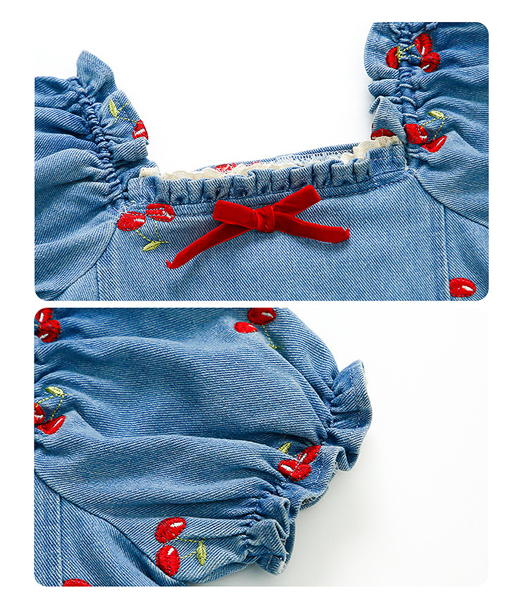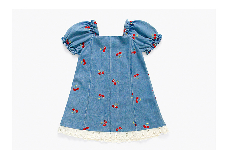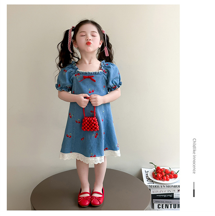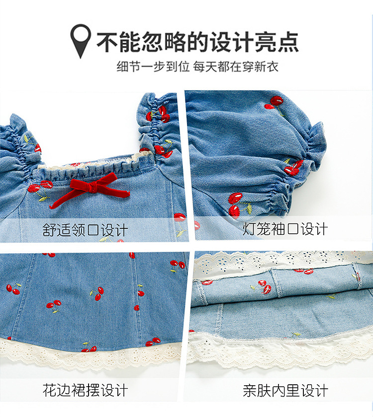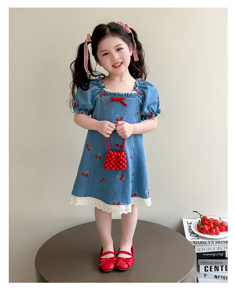 크로스보더 여아 체리 자수 데님 원피스 아동 한국 스타일 패션 어린 소녀들을 위한 세련된 공주 드레스 (중소 아동용)스토어 가기