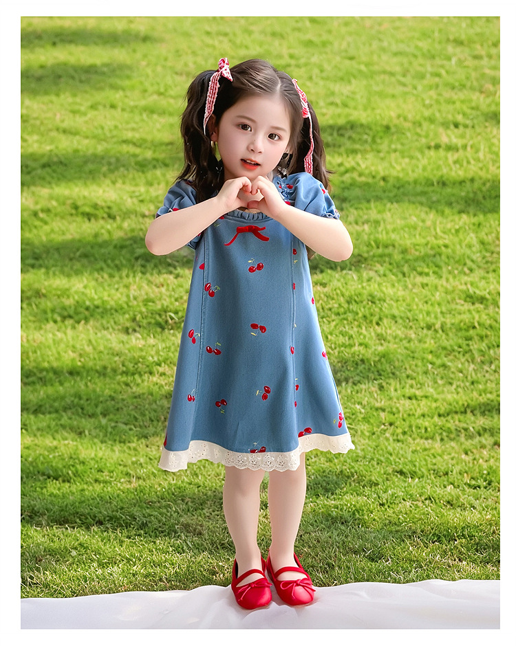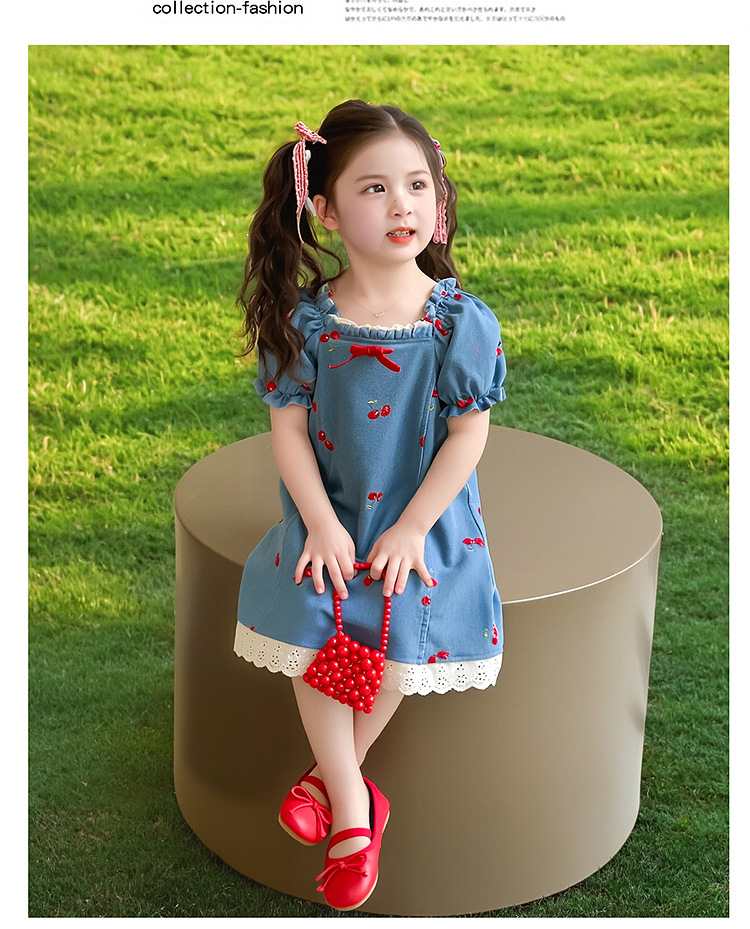 크로스보더 여아 체리 자수 데님 원피스 아동 한국 스타일 패션 어린 소녀들을 위한 세련된 공주 드레스 (중소 아동용)