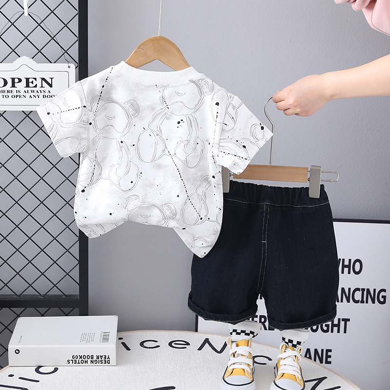 어린이와 중년 어린이 창의적인 풀 프린트 곰 라운드 넥 통기성 루즈 슈트 여름 신작 캐주얼 반팔 티셔츠 투피스 세트스토어 가기