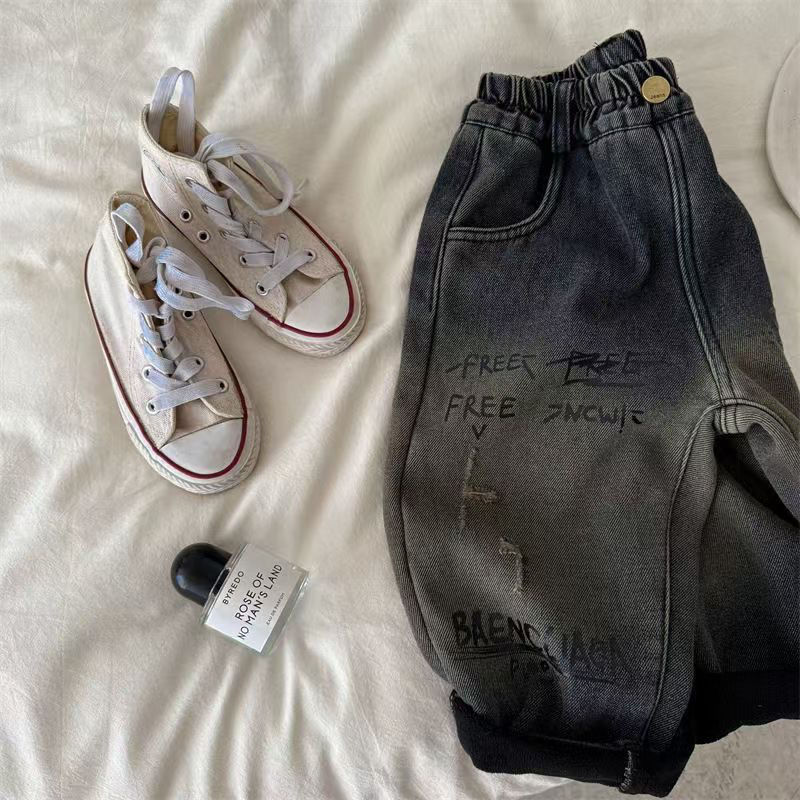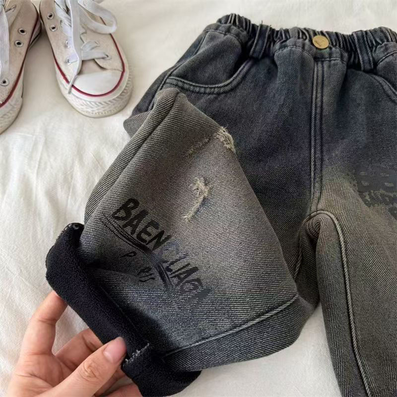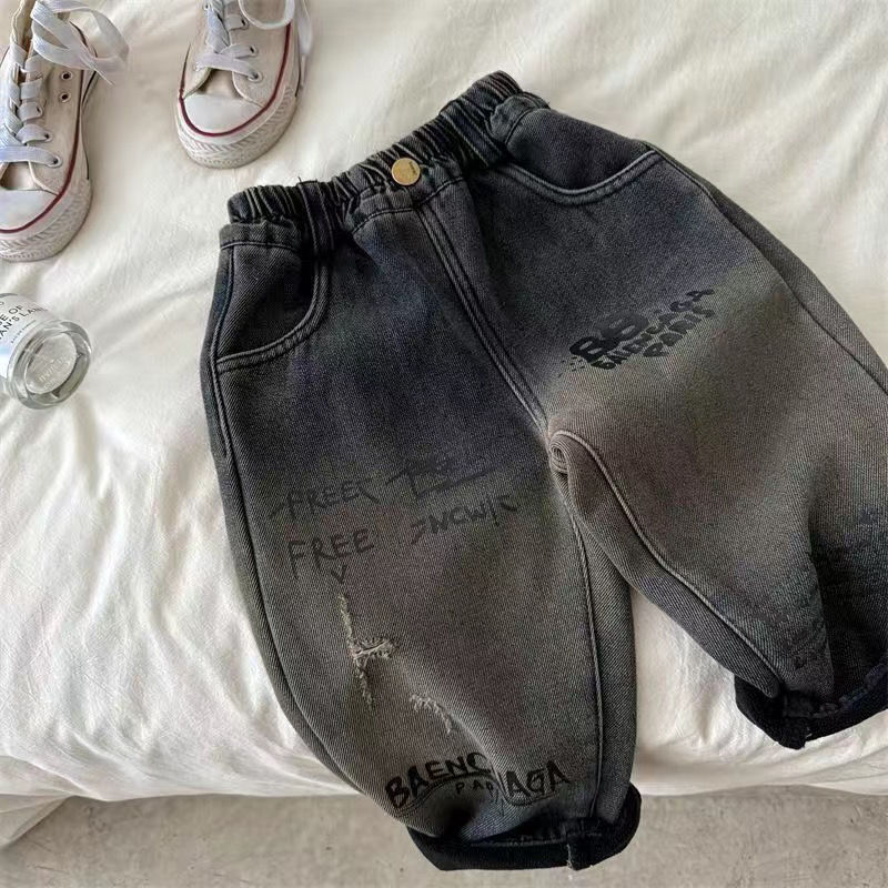 아동용 바지, 남성과 여성을 위한 새로운 겨울 제품, 두꺼운 글자 그라데이션 컬러 플러스 벨벳 데님 바지, 트렌디한 겉옷