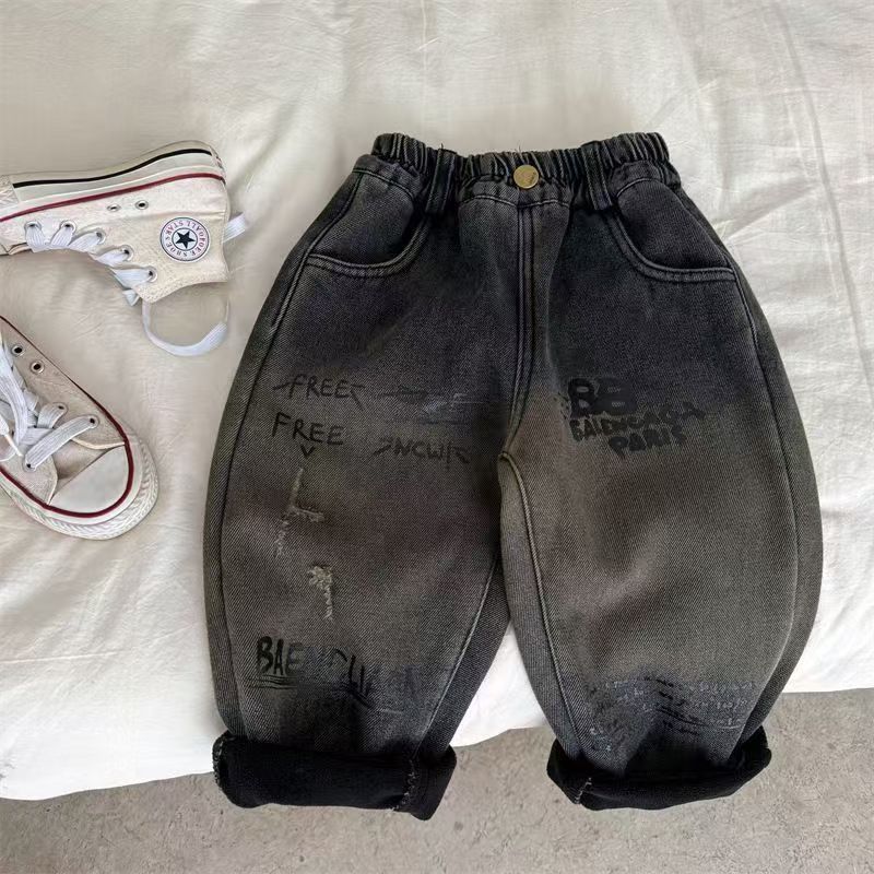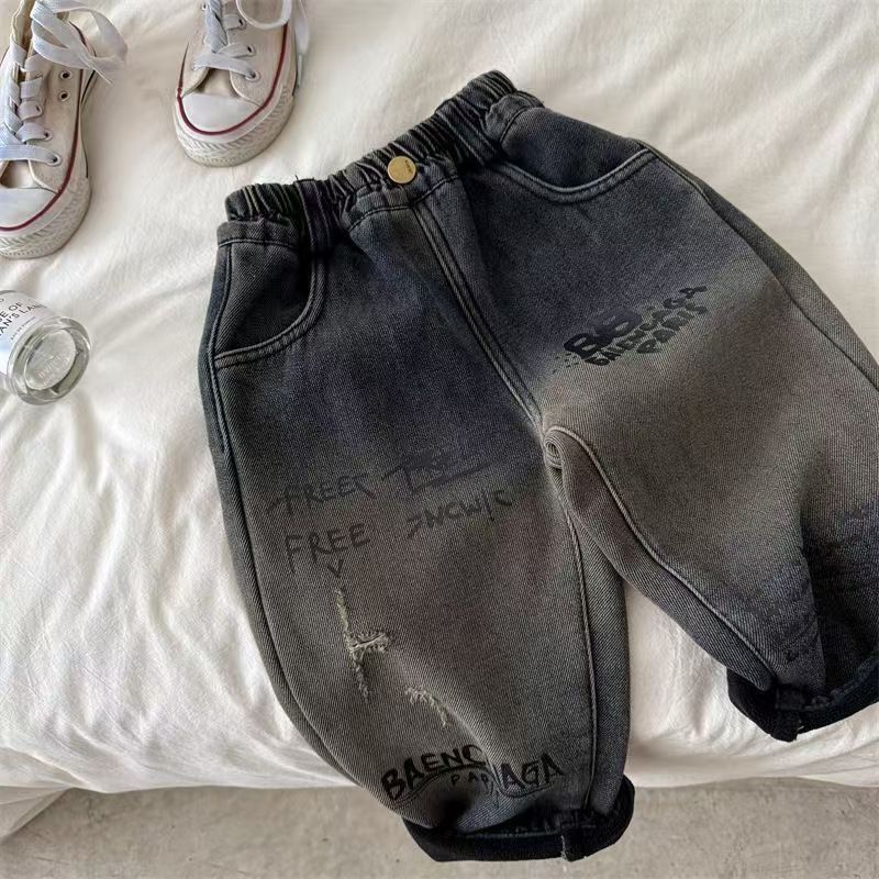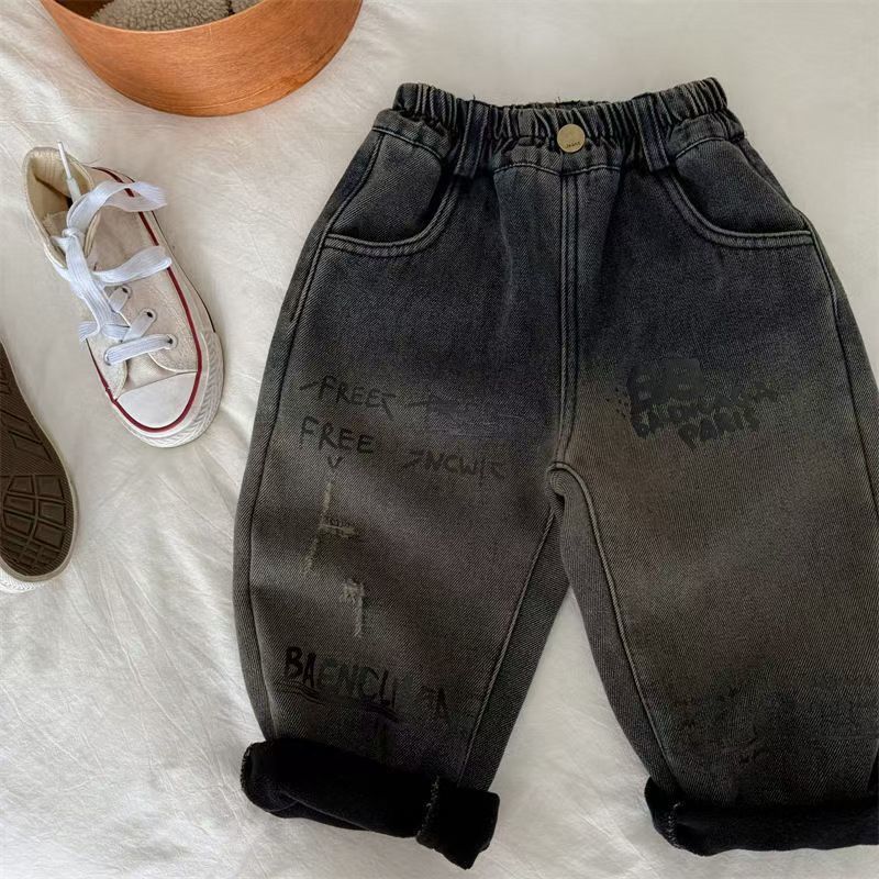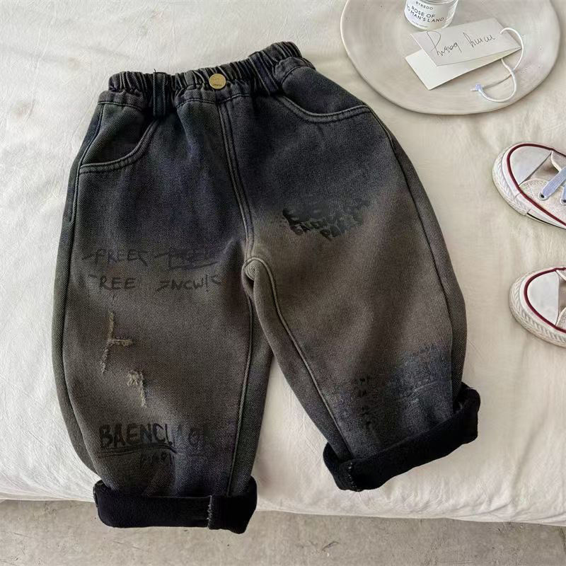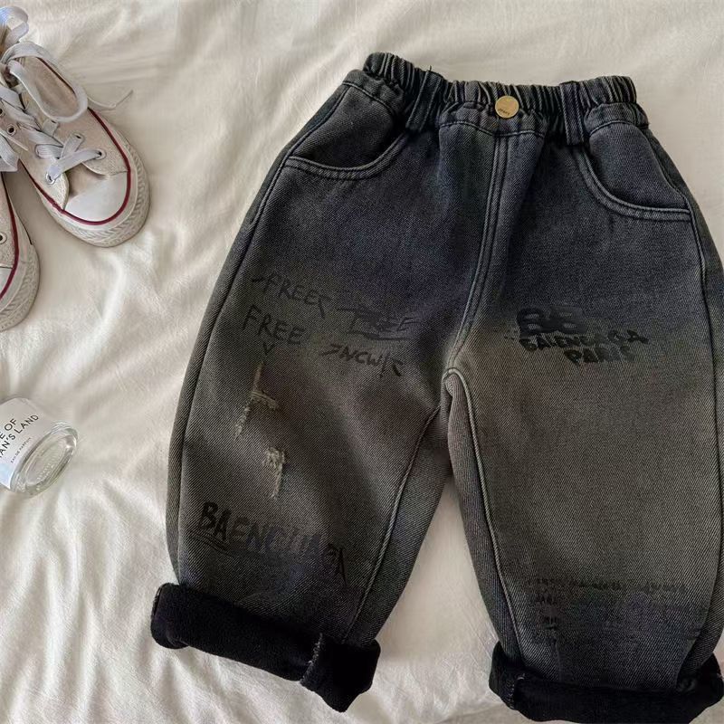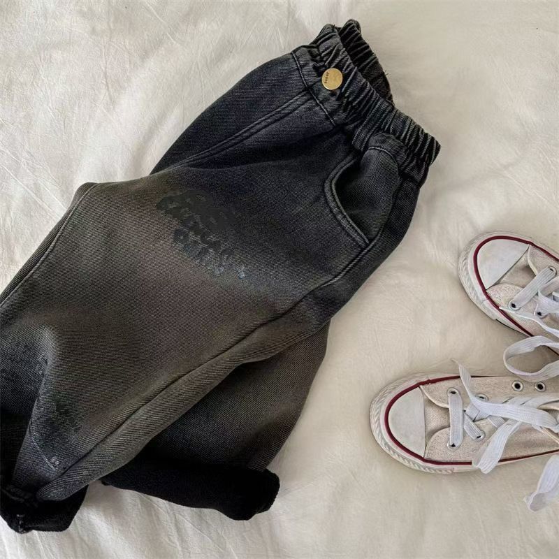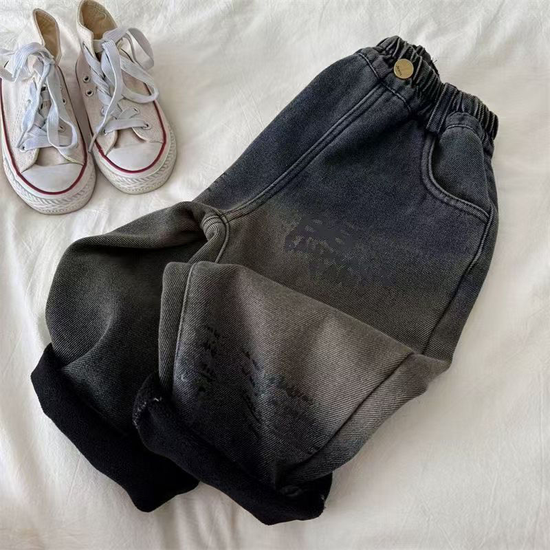 아동용 바지, 남성과 여성을 위한 새로운 겨울 제품, 두꺼운 글자 그라데이션 컬러 플러스 벨벳 데님 바지, 트렌디한 겉옷스토어 가기