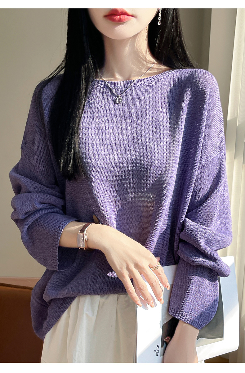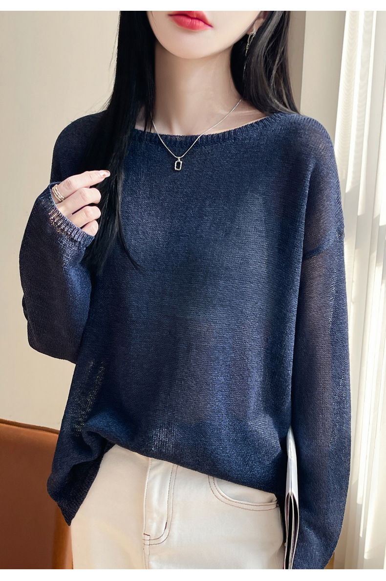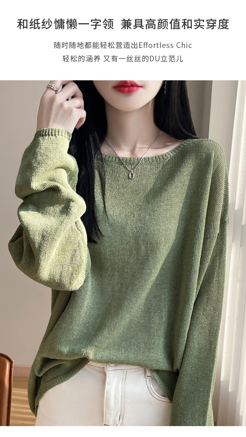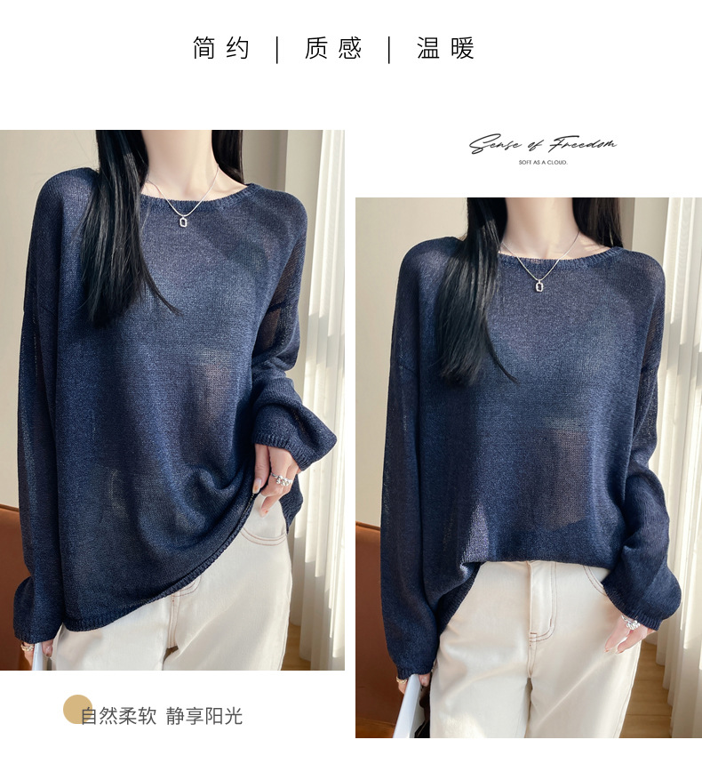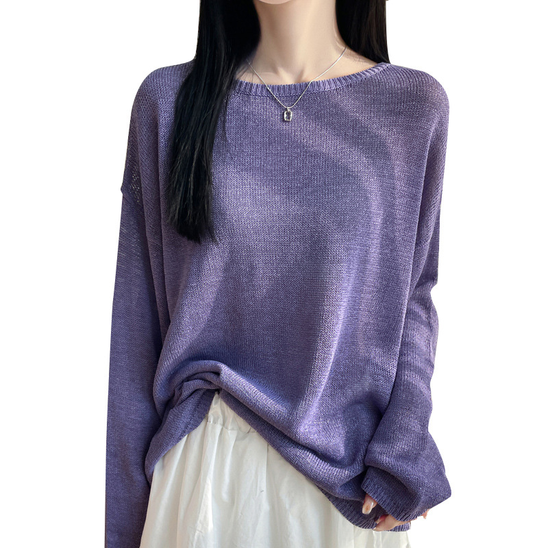 한국 스타일 게으른 스타일 원칼라 니트 블라우스 여성 여름 느슨한 플러스 사이즈 및 종이 원사 알몸 긴팔 에어컨 셔츠스토어 가기