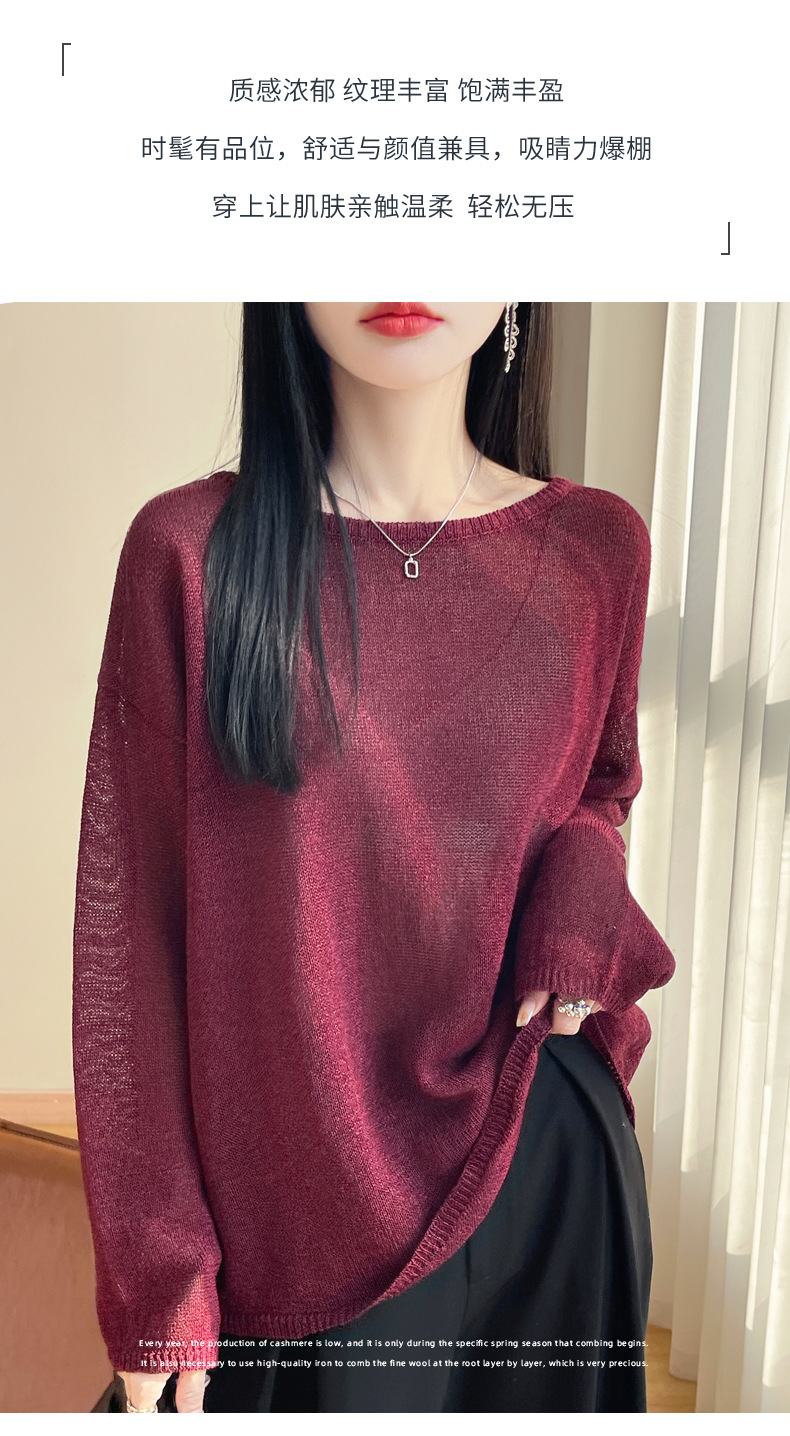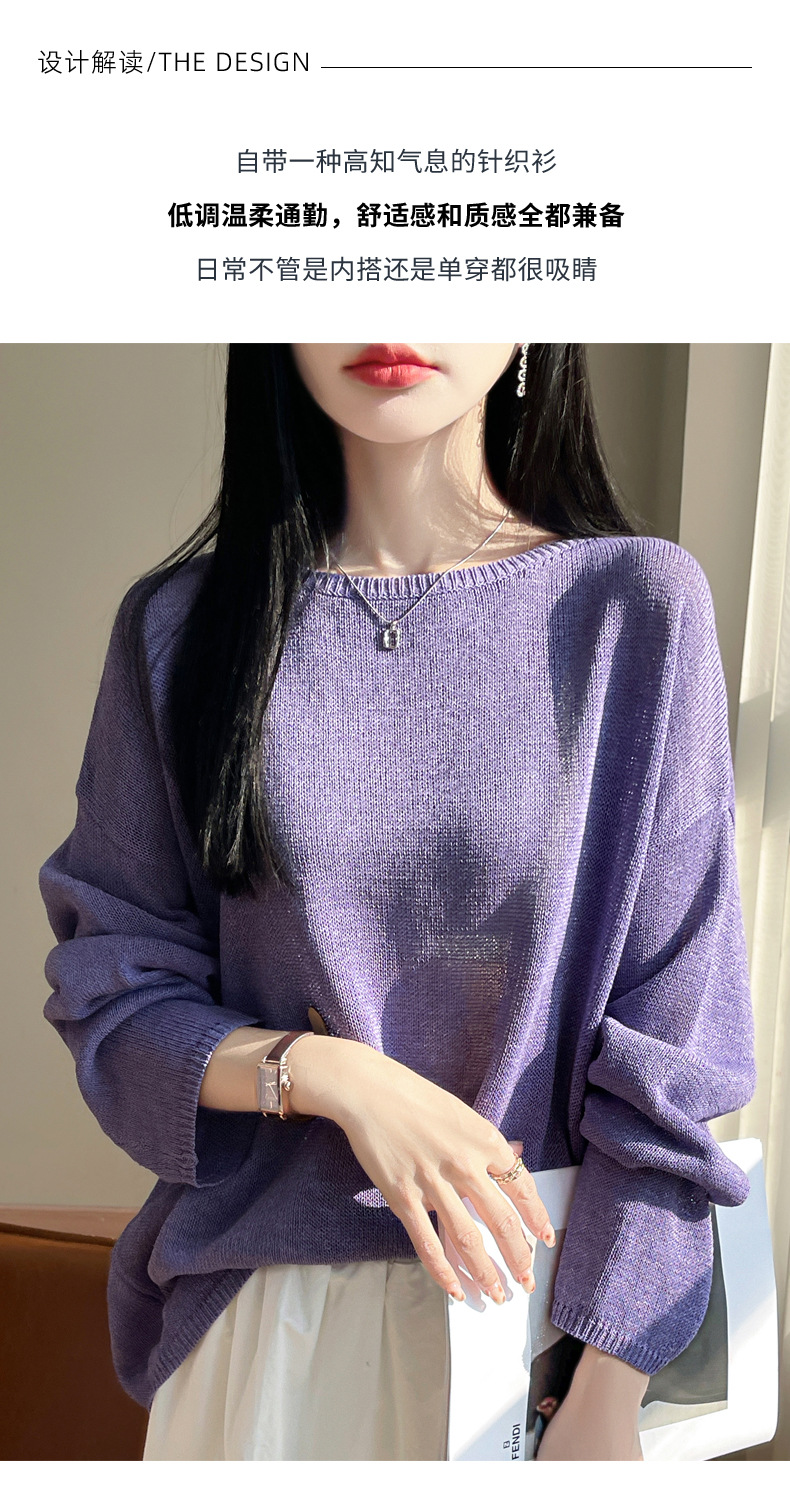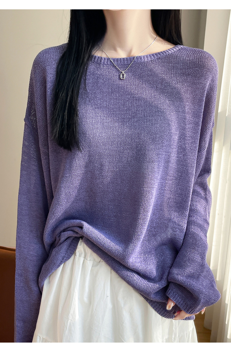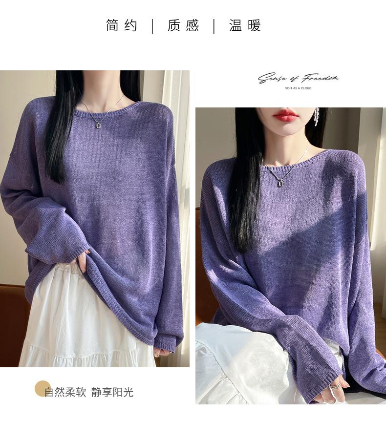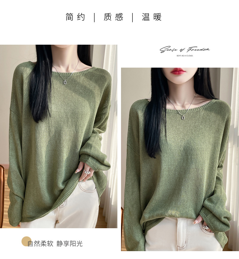 한국 스타일 게으른 스타일 원칼라 니트 블라우스 여성 여름 느슨한 플러스 사이즈 및 종이 원사 알몸 긴팔 에어컨 셔츠스토어 가기