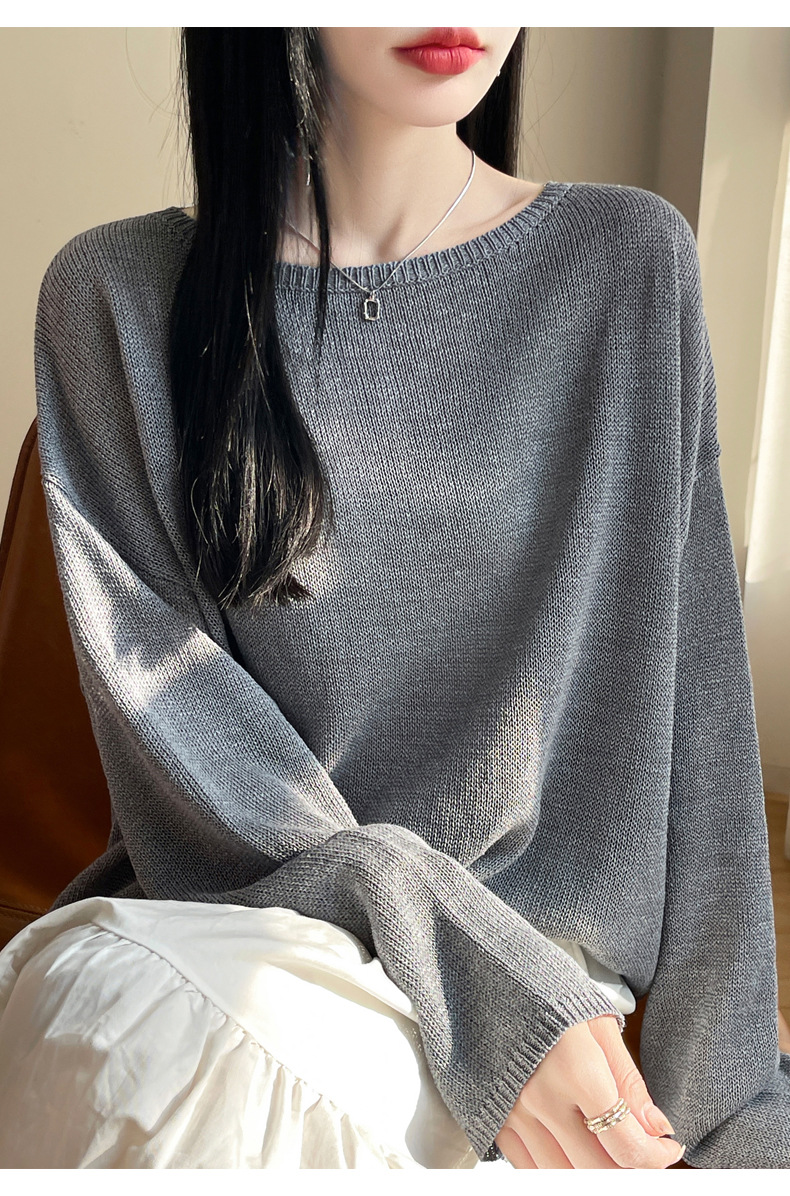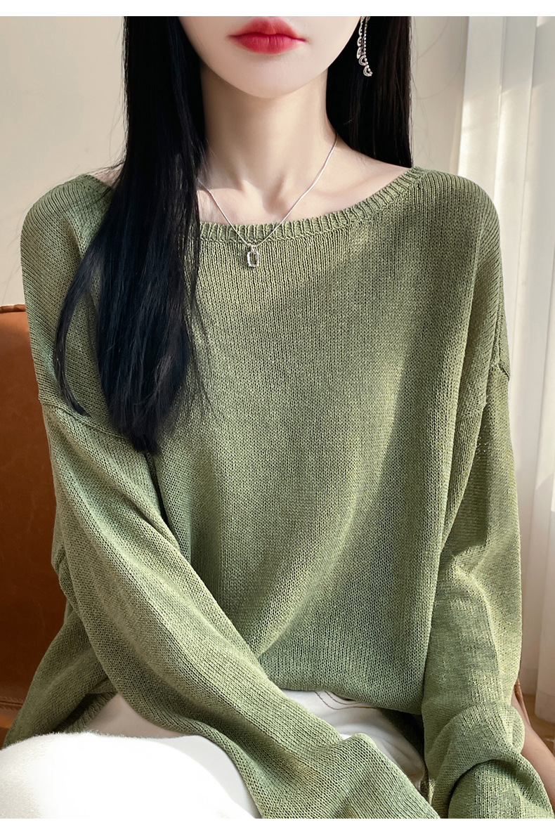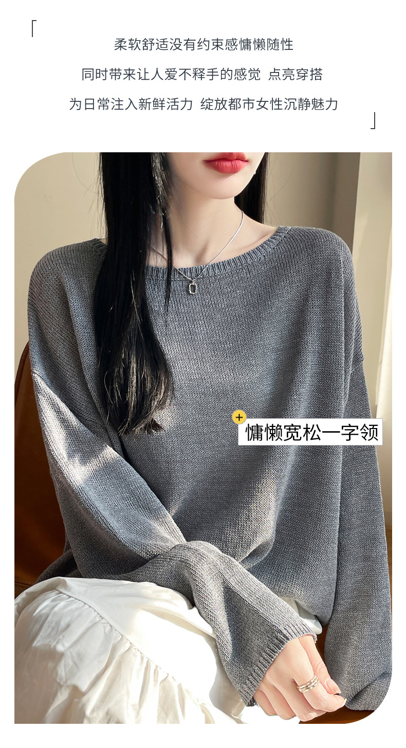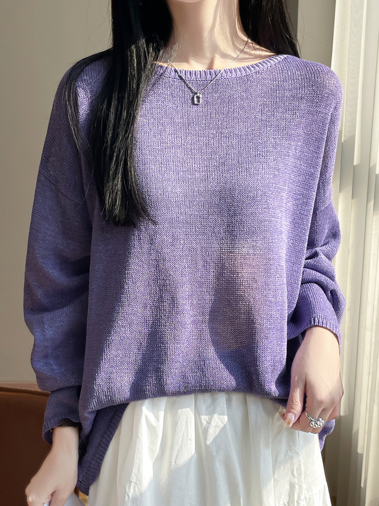 한국 스타일 게으른 스타일 원칼라 니트 블라우스 여성 여름 느슨한 플러스 사이즈 및 종이 원사 알몸 긴팔 에어컨 셔츠스토어 가기