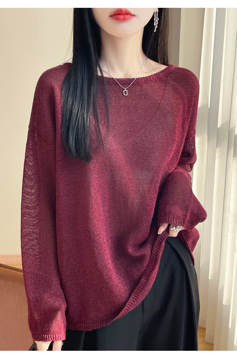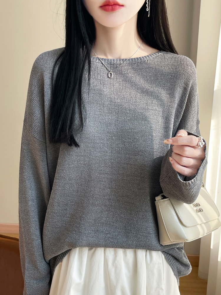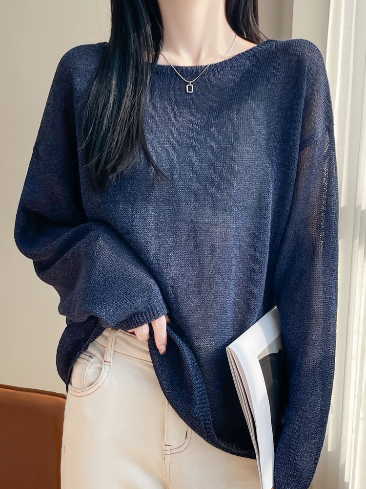한국 스타일 게으른 스타일 원칼라 니트 블라우스 여성 여름 느슨한 플러스 사이즈 및 종이 원사 알몸 긴팔 에어컨 셔츠