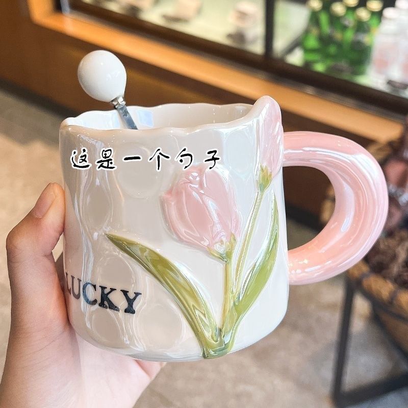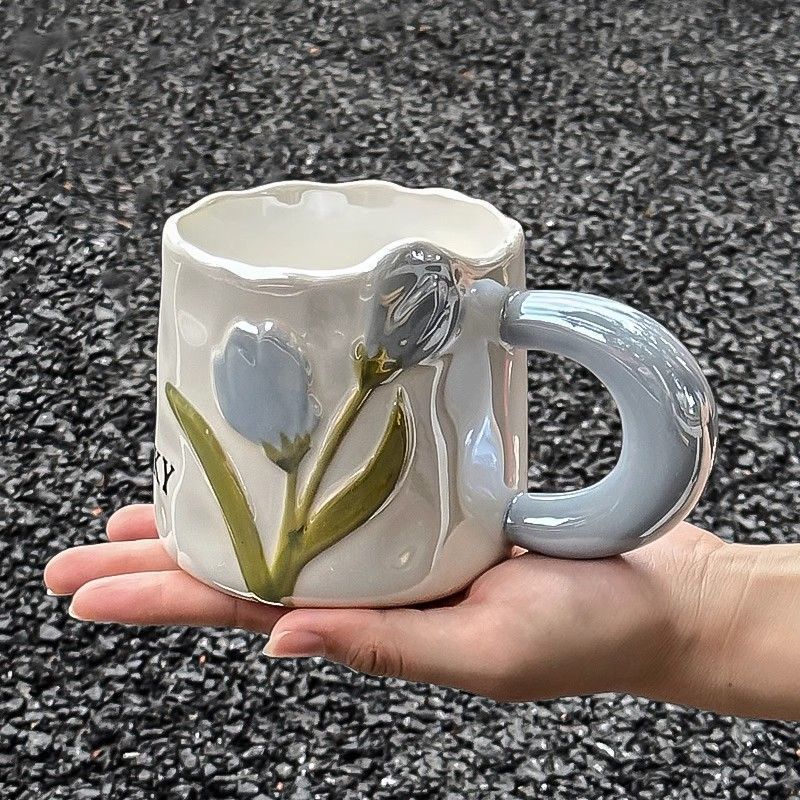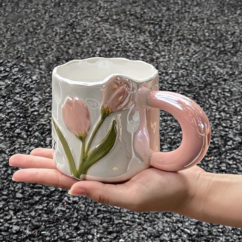 창의적인 고급 입체 부동 꽃 튤립 소녀 하트 손으로 그린 튤립 장미 꽃 감각 가장 친한 친구 머그잔 세라믹