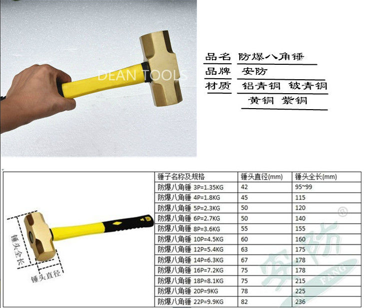 폭발 방지 팔각형 해머 구리 합금 비 스파크 사각 구리 해머 방폭 도구 브랜드 양면 망치