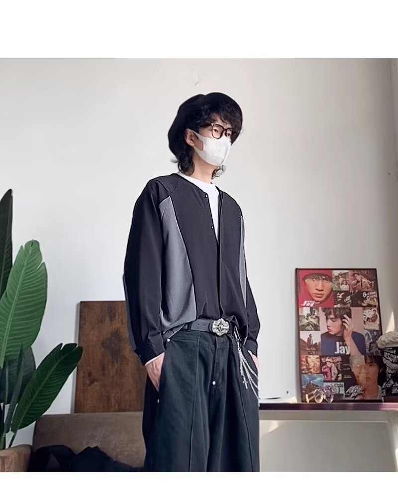 한국 스타일 드레이피 칼라리스 컬러 블록 긴팔 셔츠 남성 봄 여름 하이 스트리트 패션 한국 스타일 셔츠 루즈 캐주얼 트렌디스토어 가기