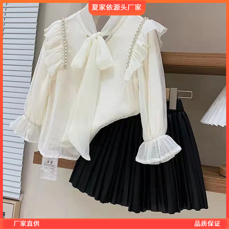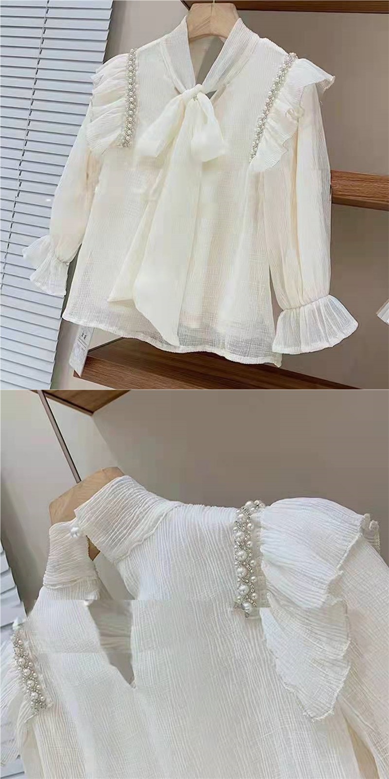 어린이 의류 2024 봄과 가을 새 셔츠 소녀 틈새 셔츠 프랑스 구슬 레이스 업 러플 쉬폰 트렌디스토어 가기