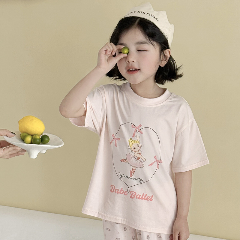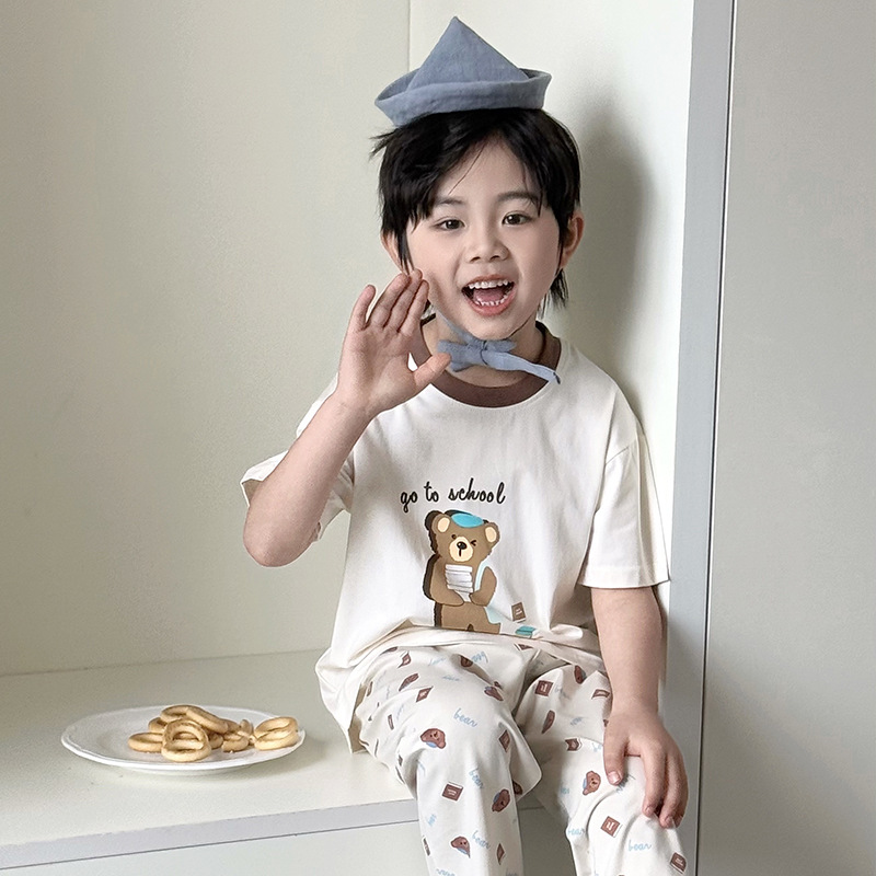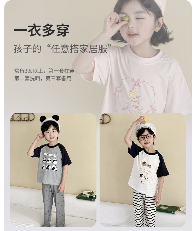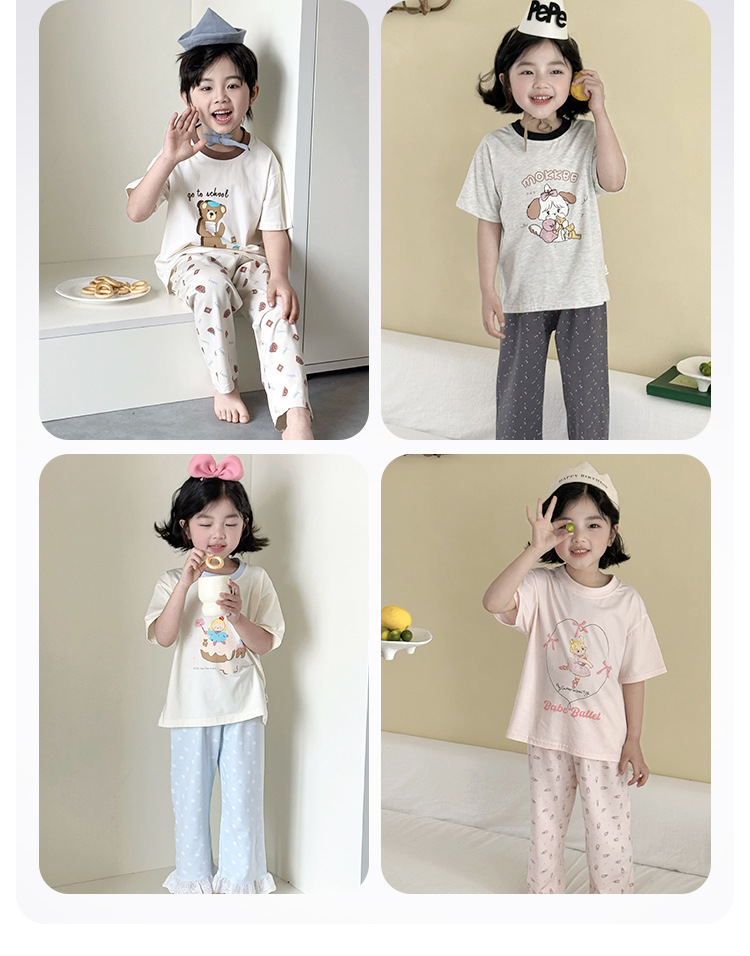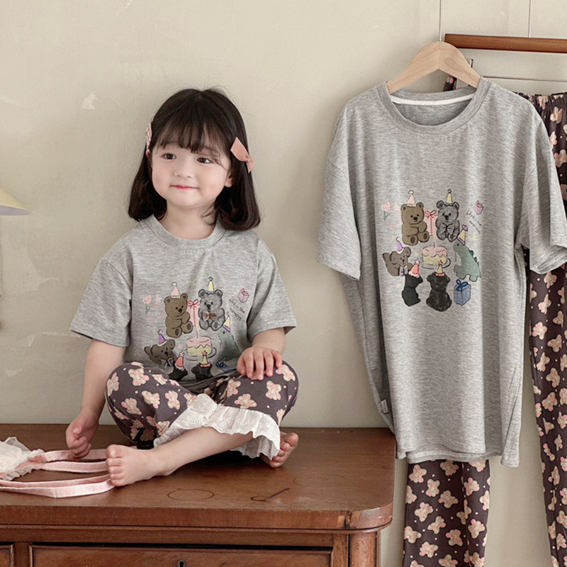 어린이 여름 홈 의류 세트 만화 레이스 소년 소녀를위한 얇은 반팔 잠옷 에어컨 의류 부모-자식 세트스토어 가기