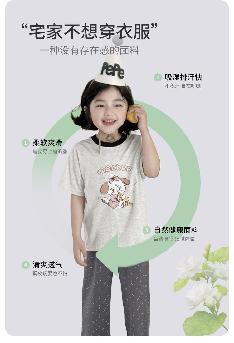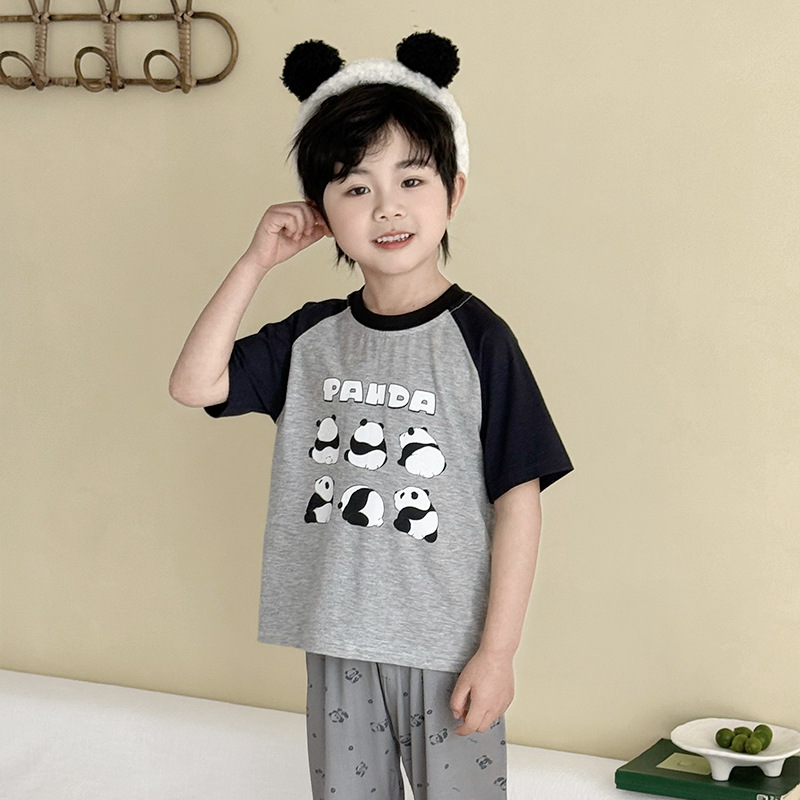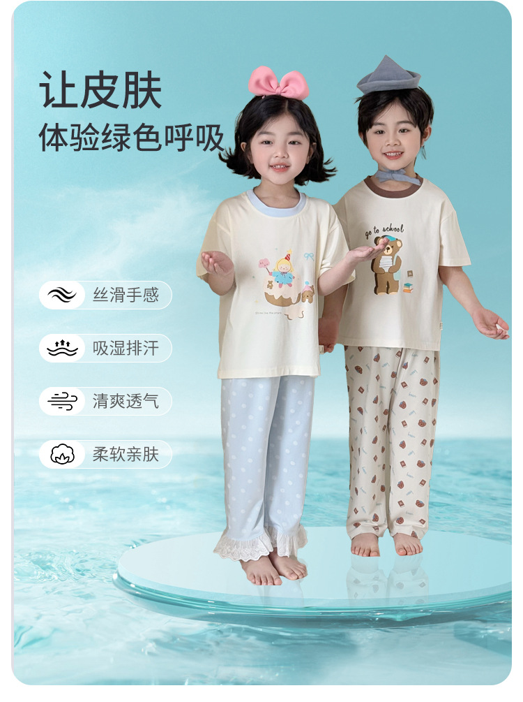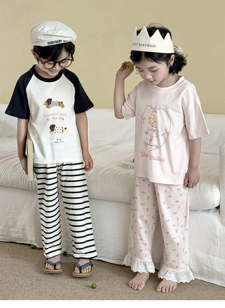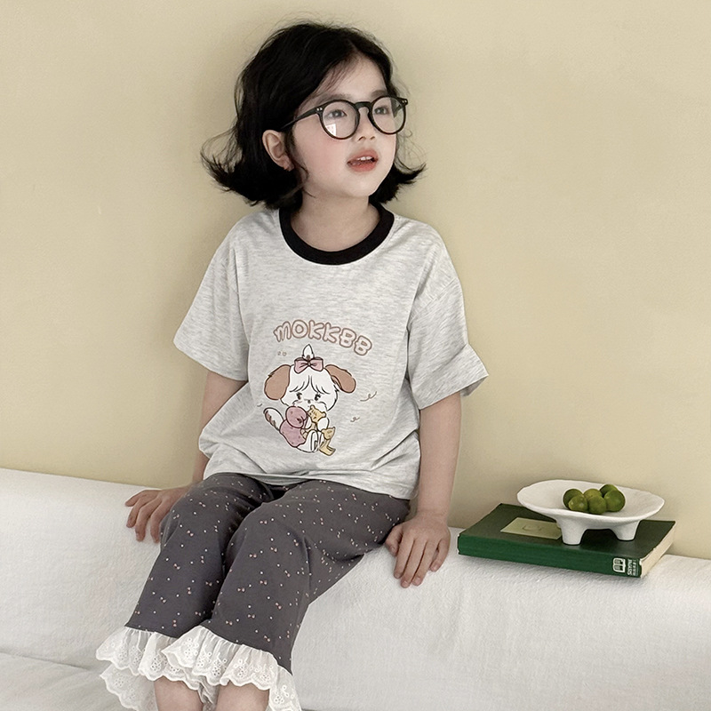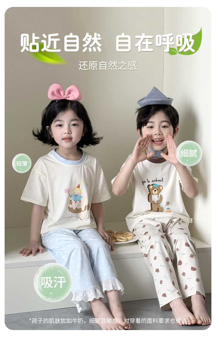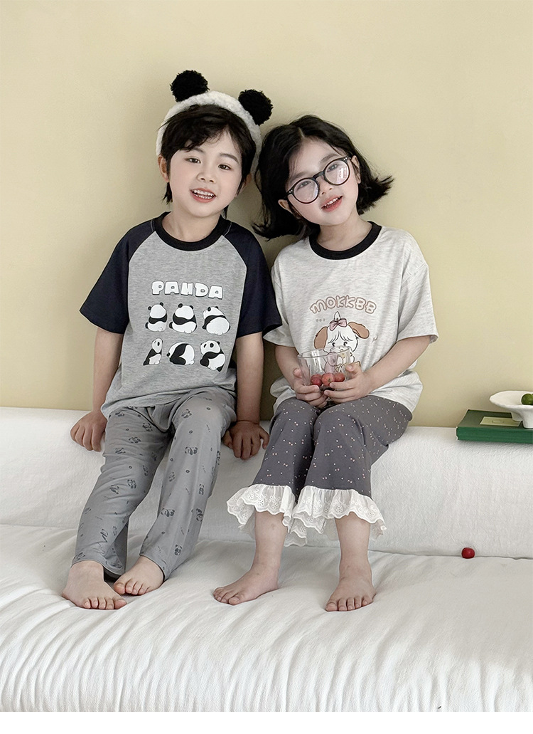 어린이 여름 홈 의류 세트 만화 레이스 소년 소녀를위한 얇은 반팔 잠옷 에어컨 의류 부모-자식 세트