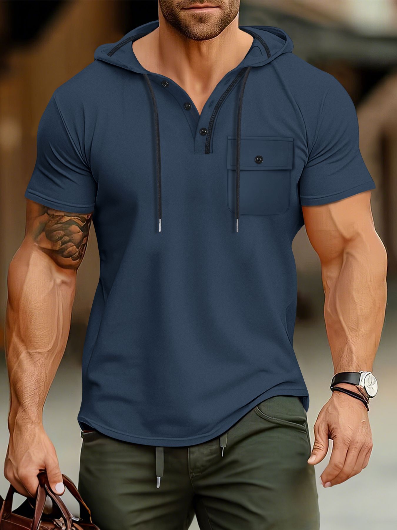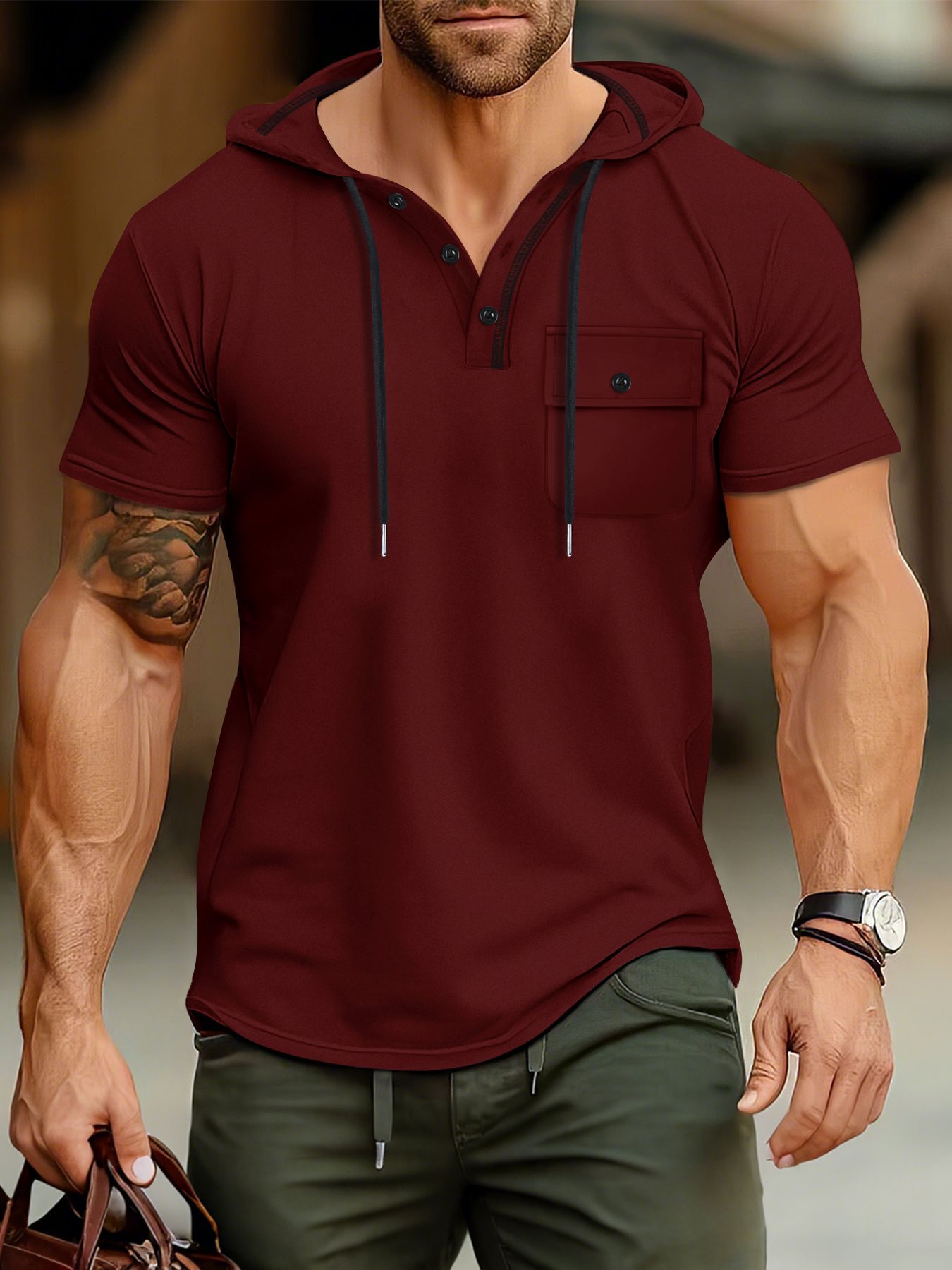 유럽과 미국 남자 스포츠 피트니스 후드 반팔 티셔츠 여름 후드 스포츠 최고 대외 무역 미국 헨리 셔츠