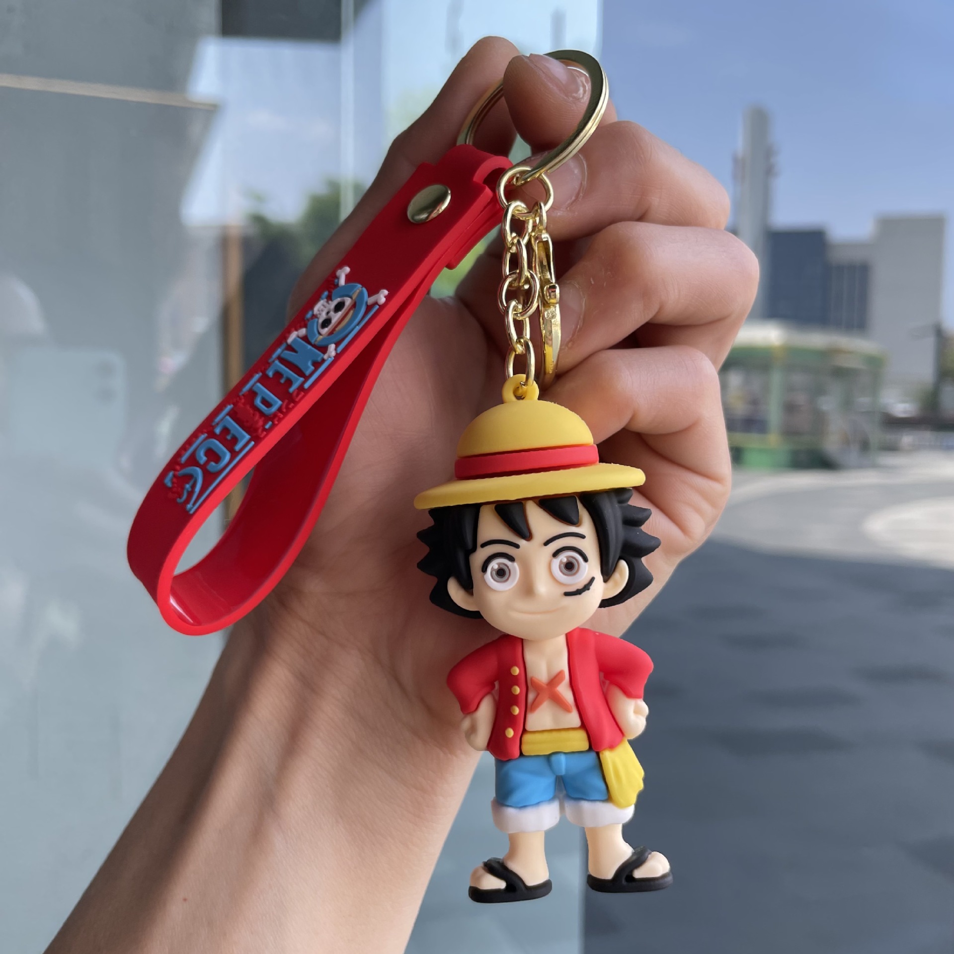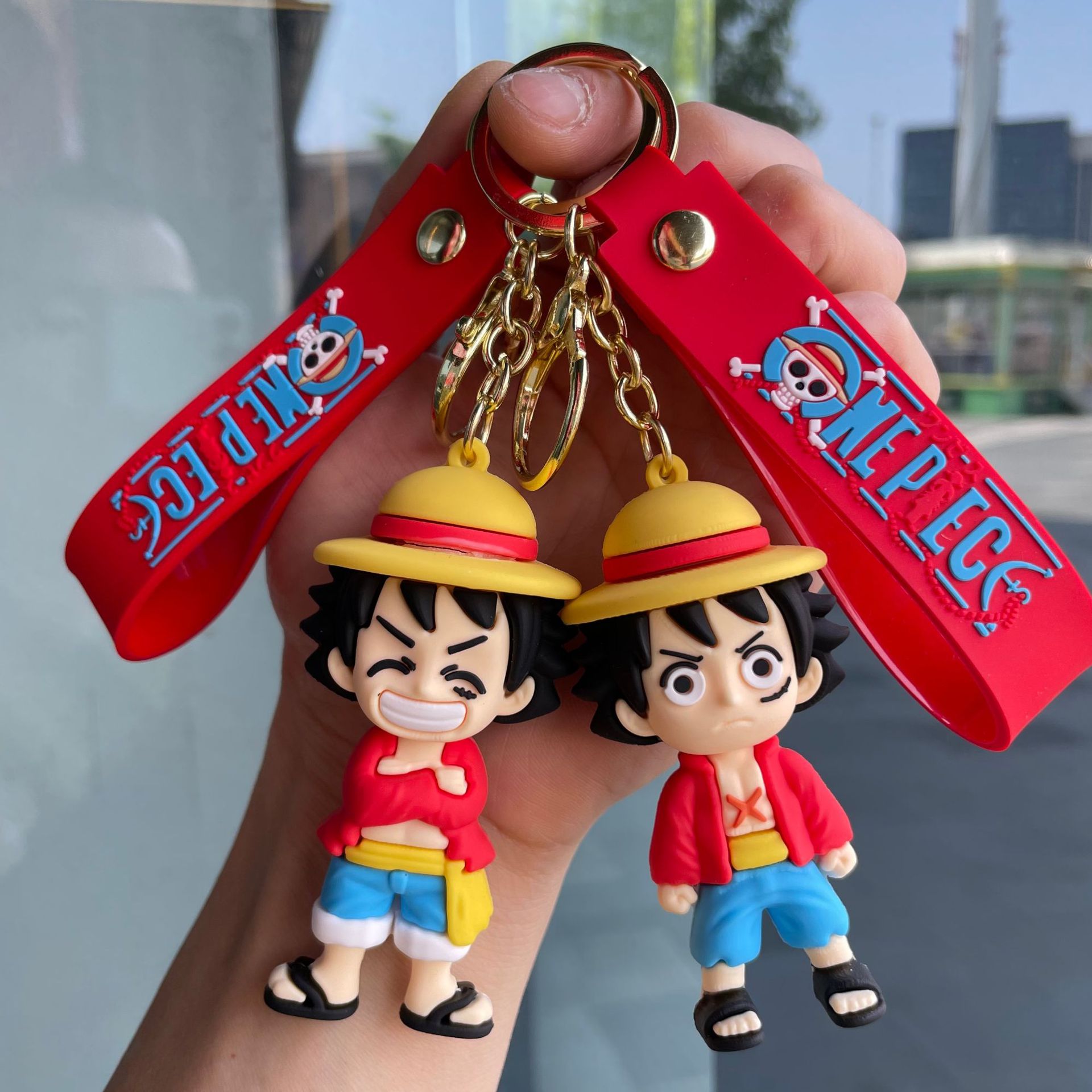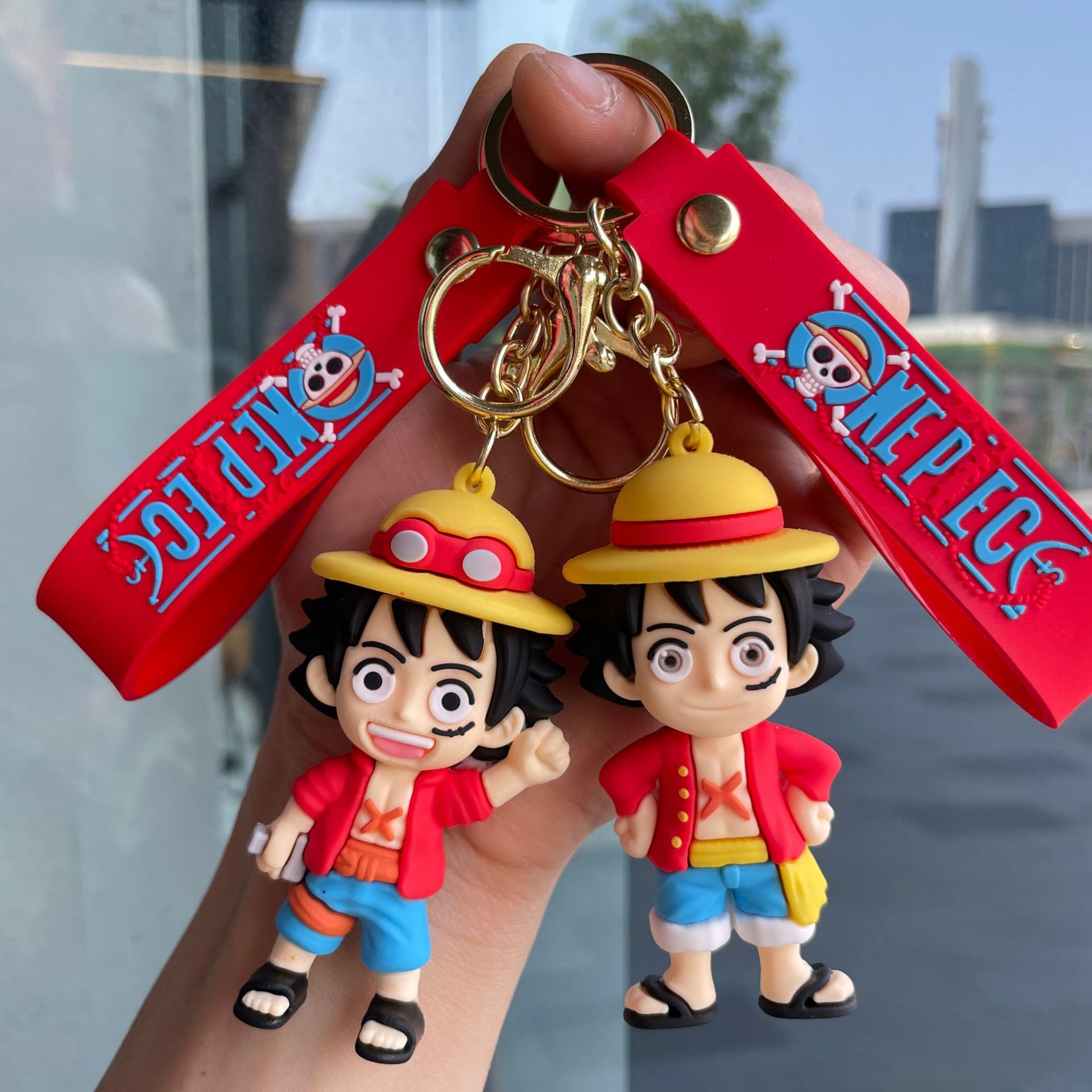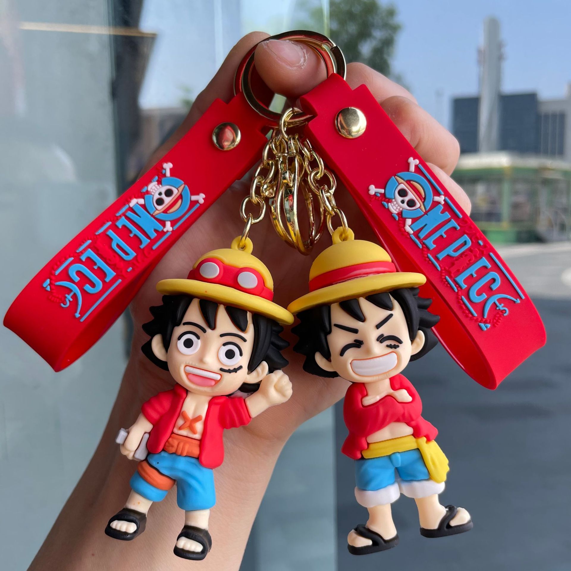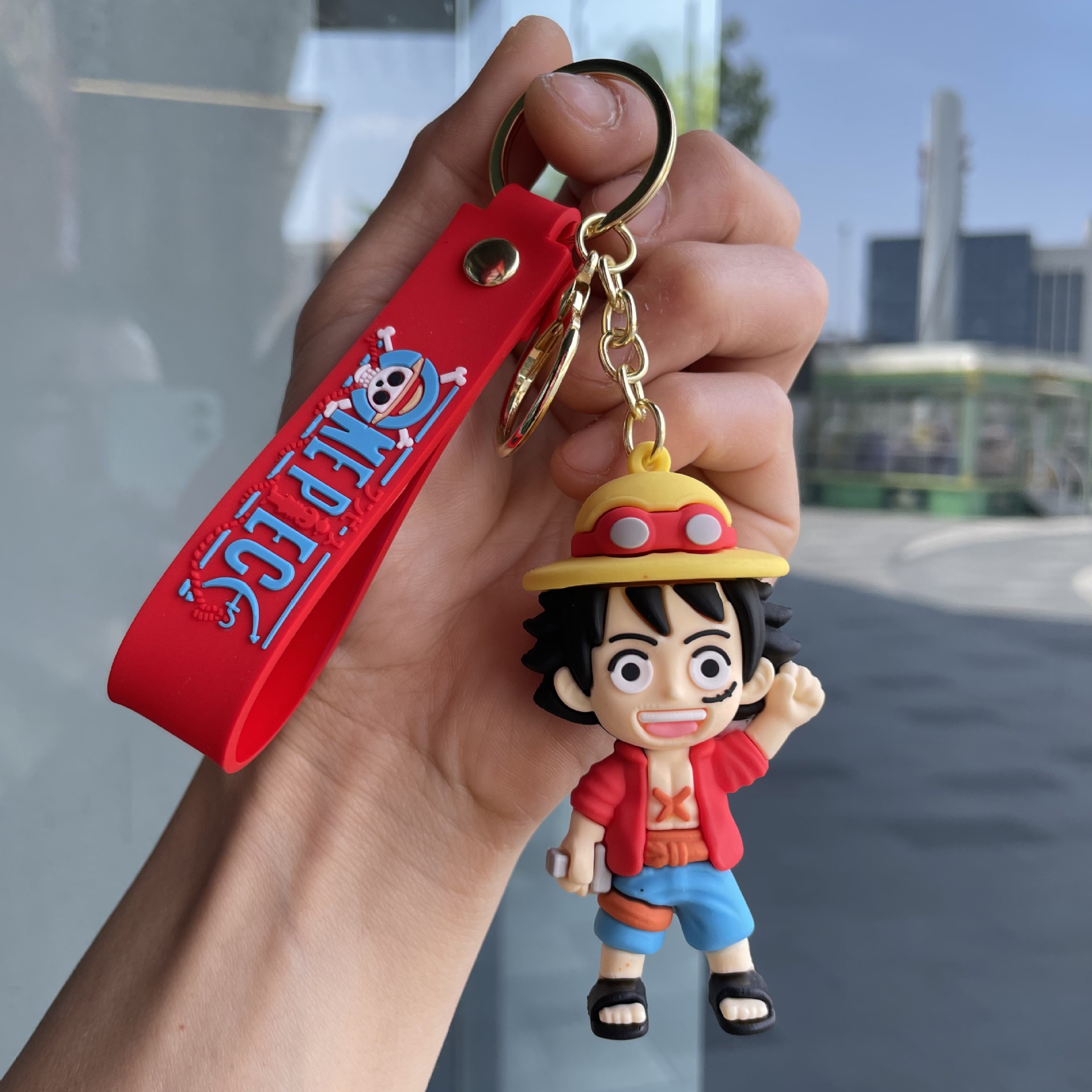 원피스 루피 키 체인 입체 만화 인형 자동차 열쇠 고리 학교 가방 펜던트 인형 뽑기 기계 작은 선물스토어 가기