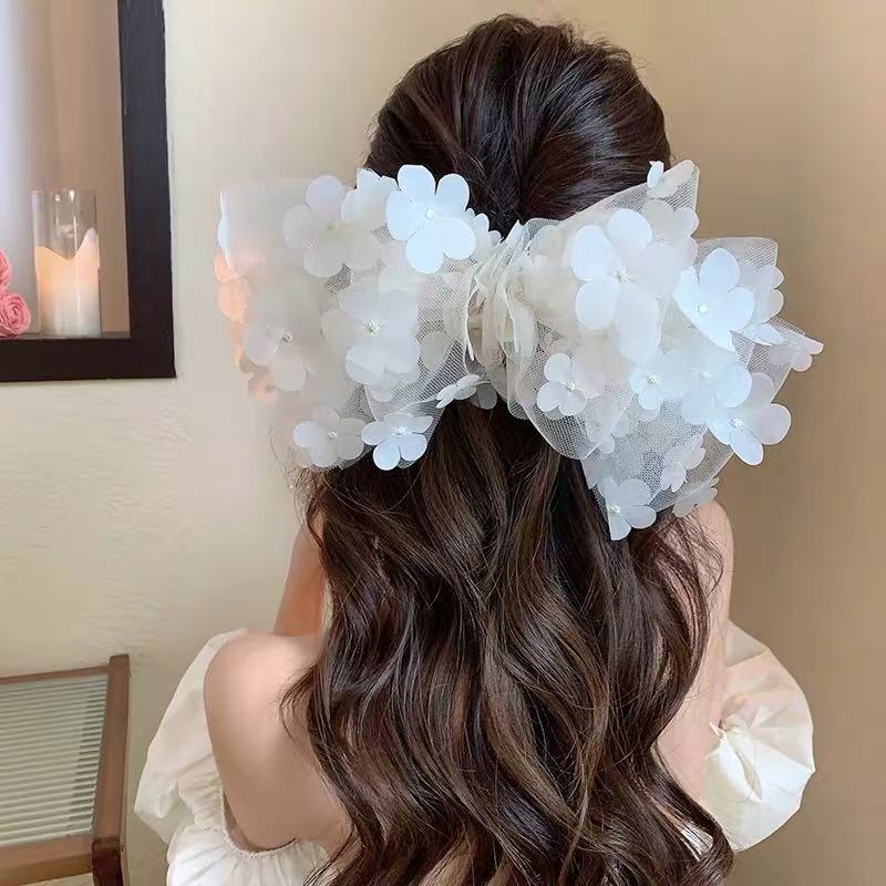 여름 새로운 슈퍼 요정 3 차원 꽃 큰 활 봄 클립 다시 머리 클립 포니 테일 메쉬 헤어핀 헤드웨어 여성