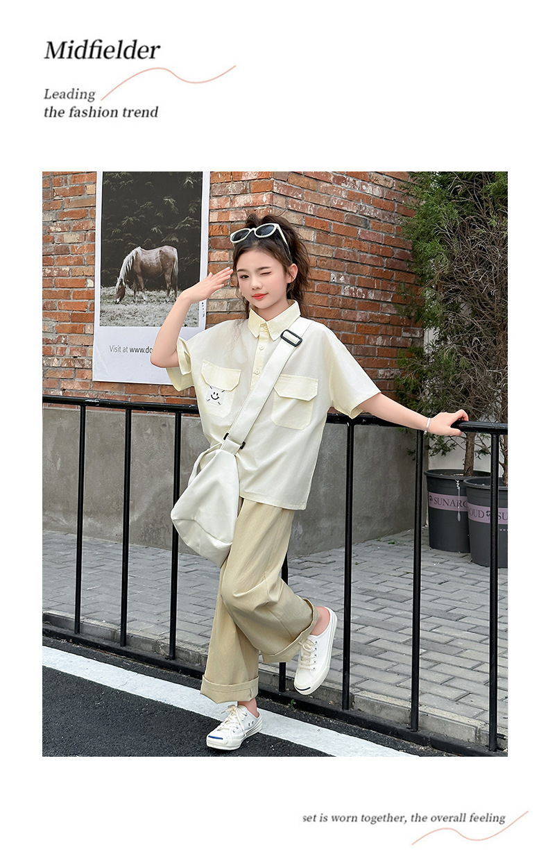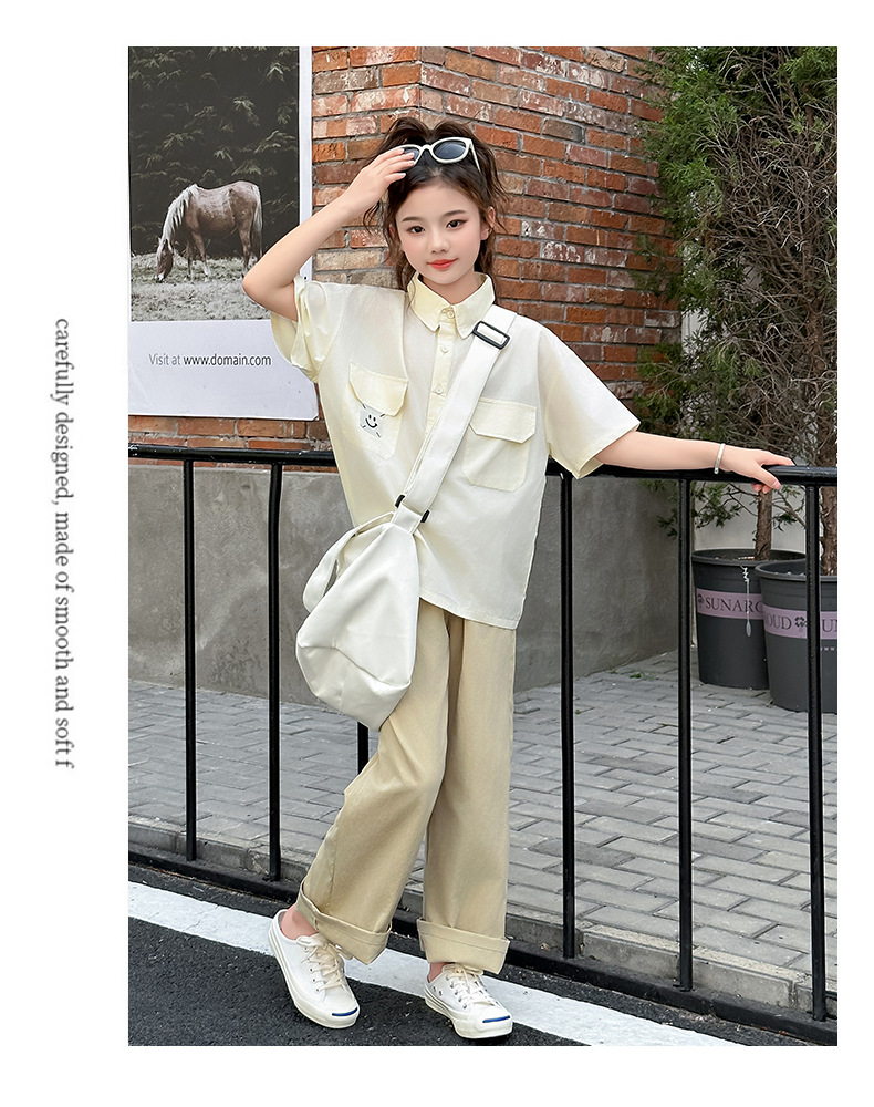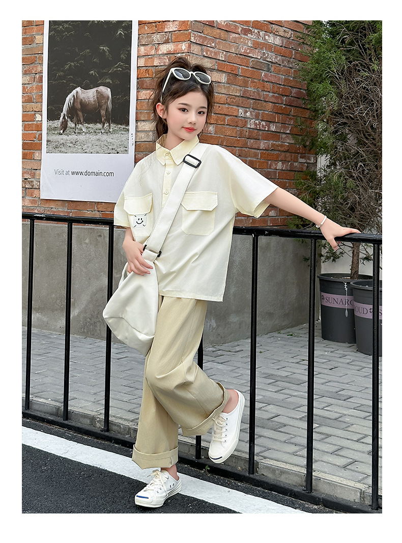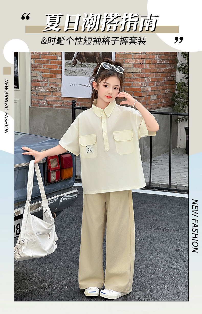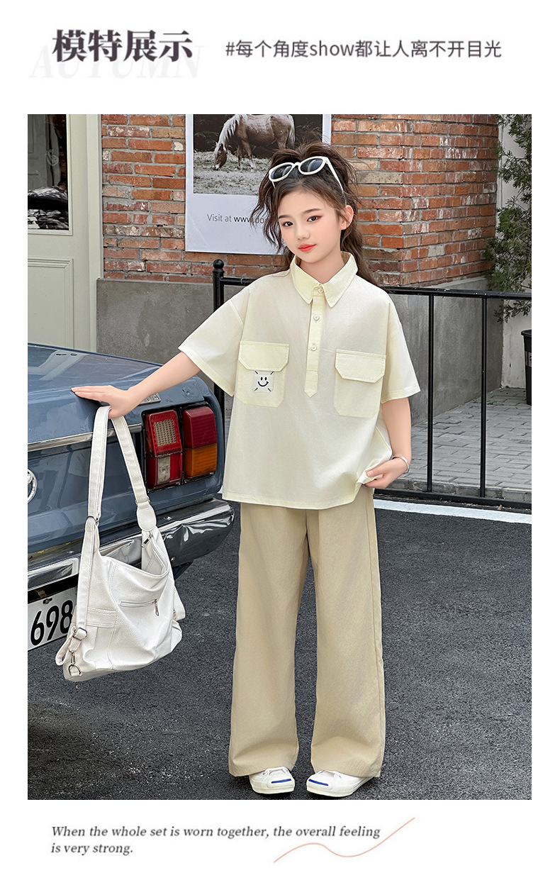 여자 여름 세트 2025 여름 새 여자 셔츠 세트 중대형 어린이 여름 착용 넓은 다리 바지 유행스토어 가기