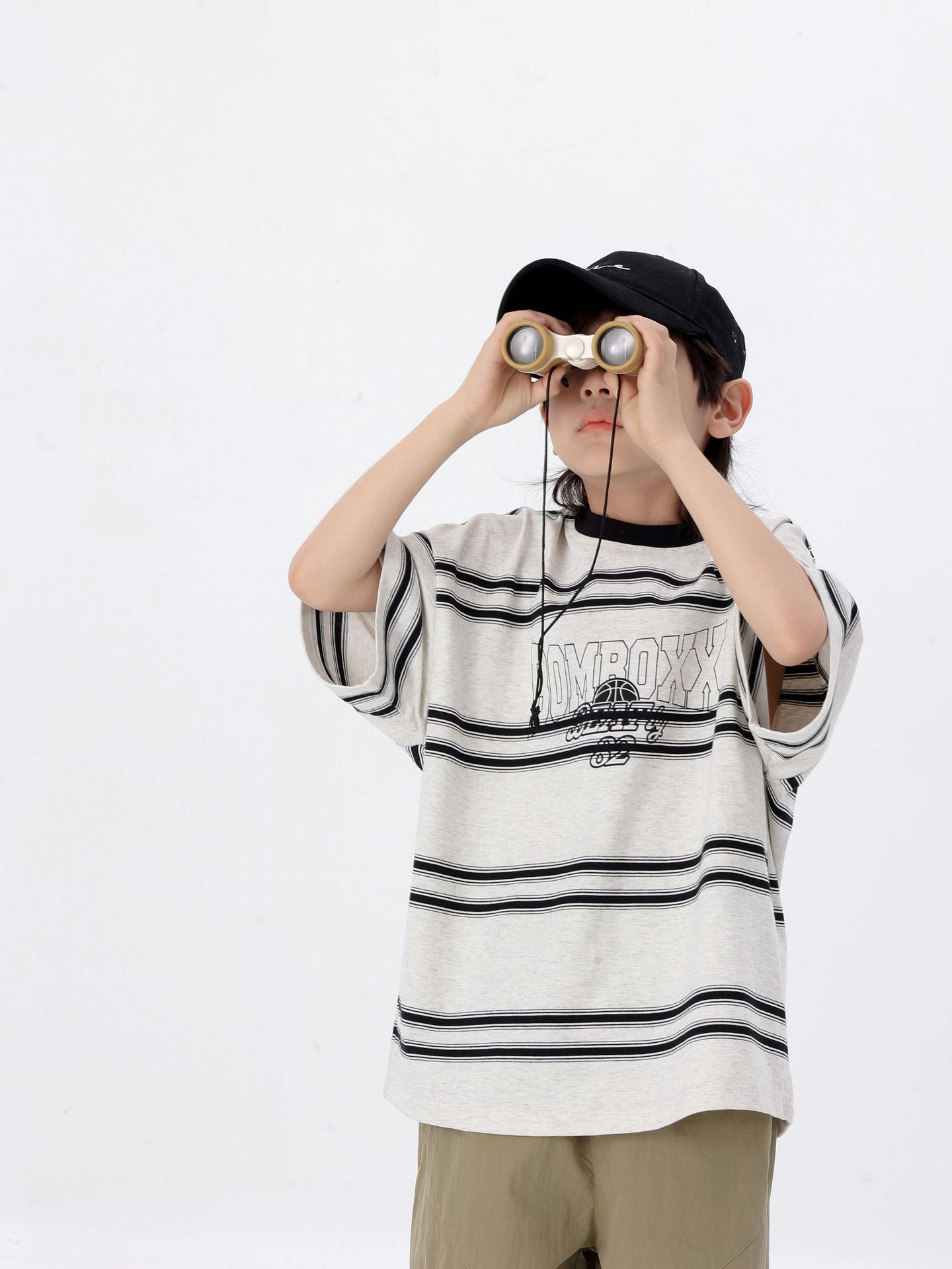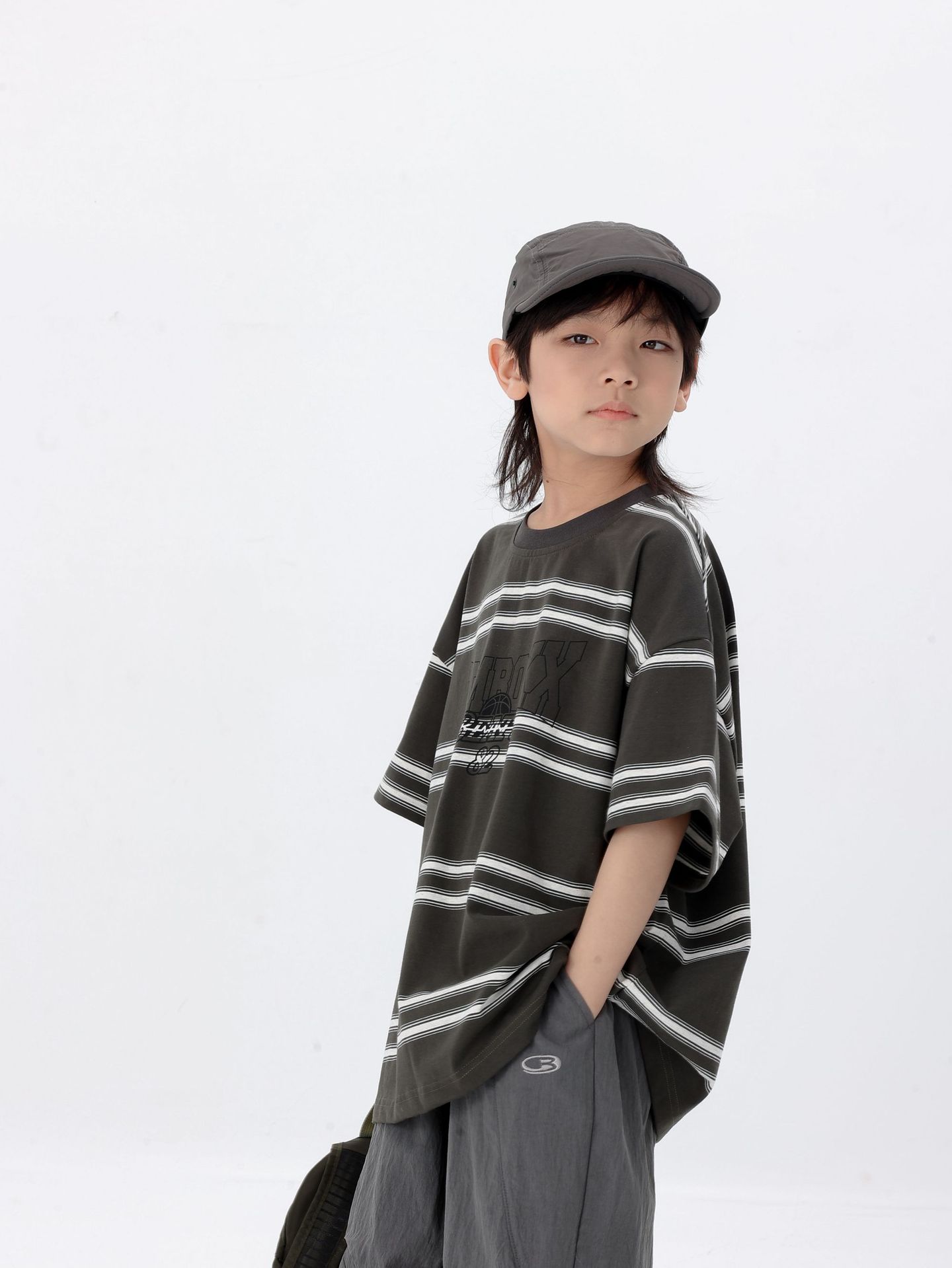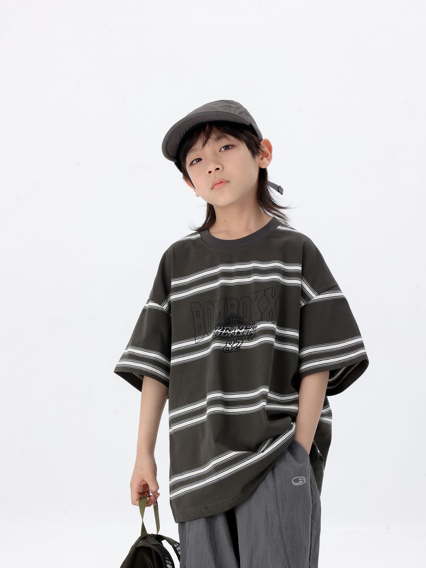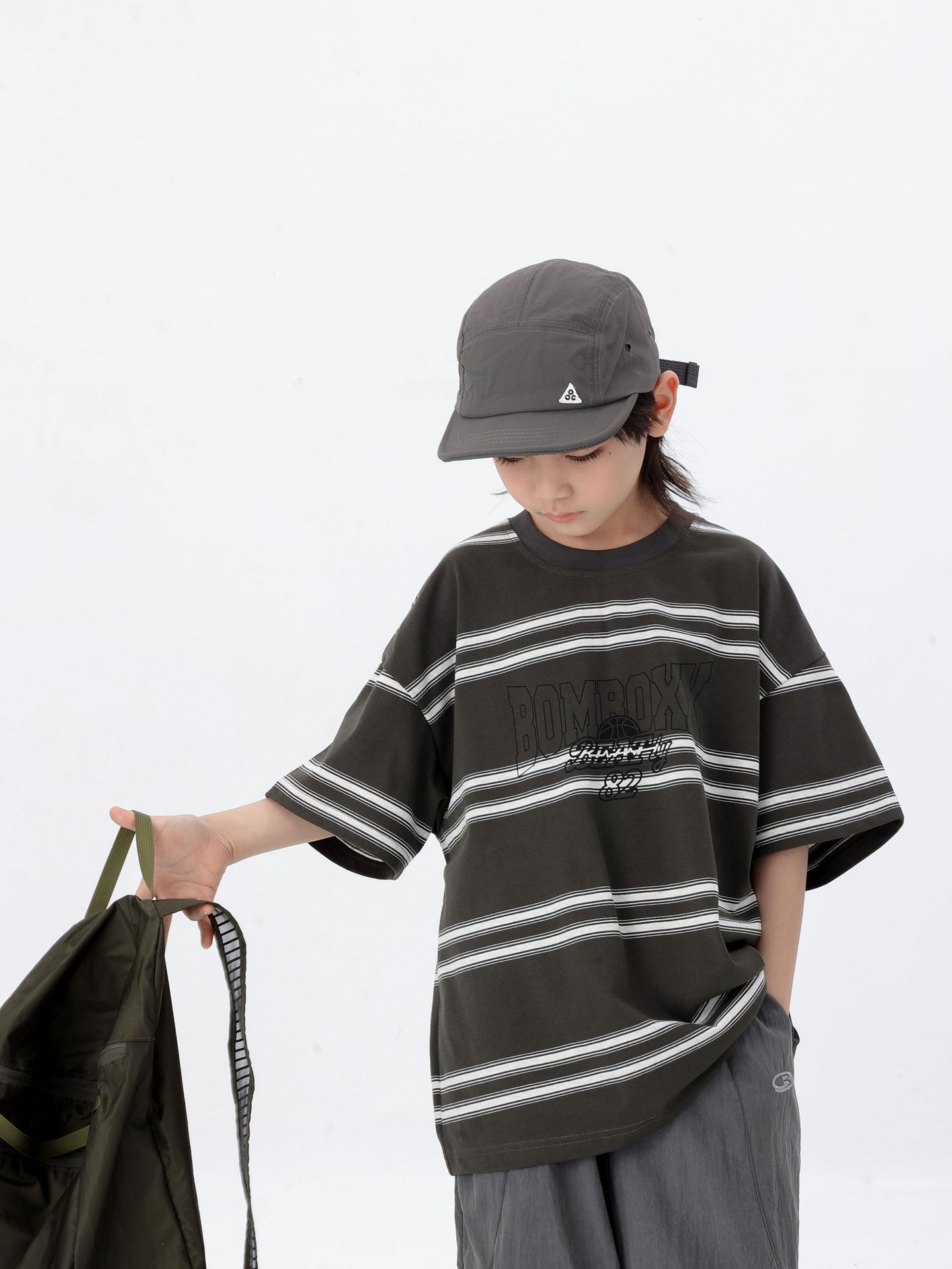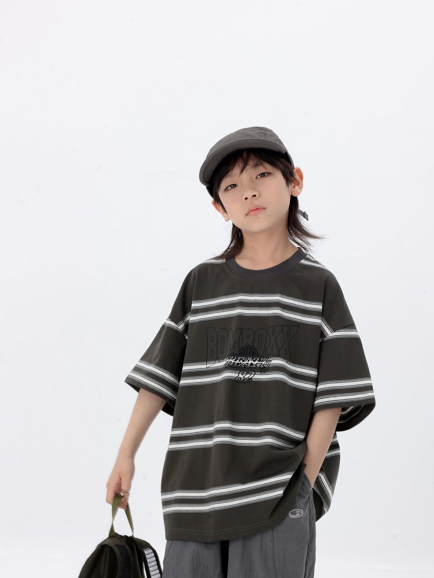 25 여름 새로운 넓은 줄무늬 소년 반팔 티셔츠 클래식 유행 어린이 한국 스타일 느슨한 어린이 편지 티셔츠