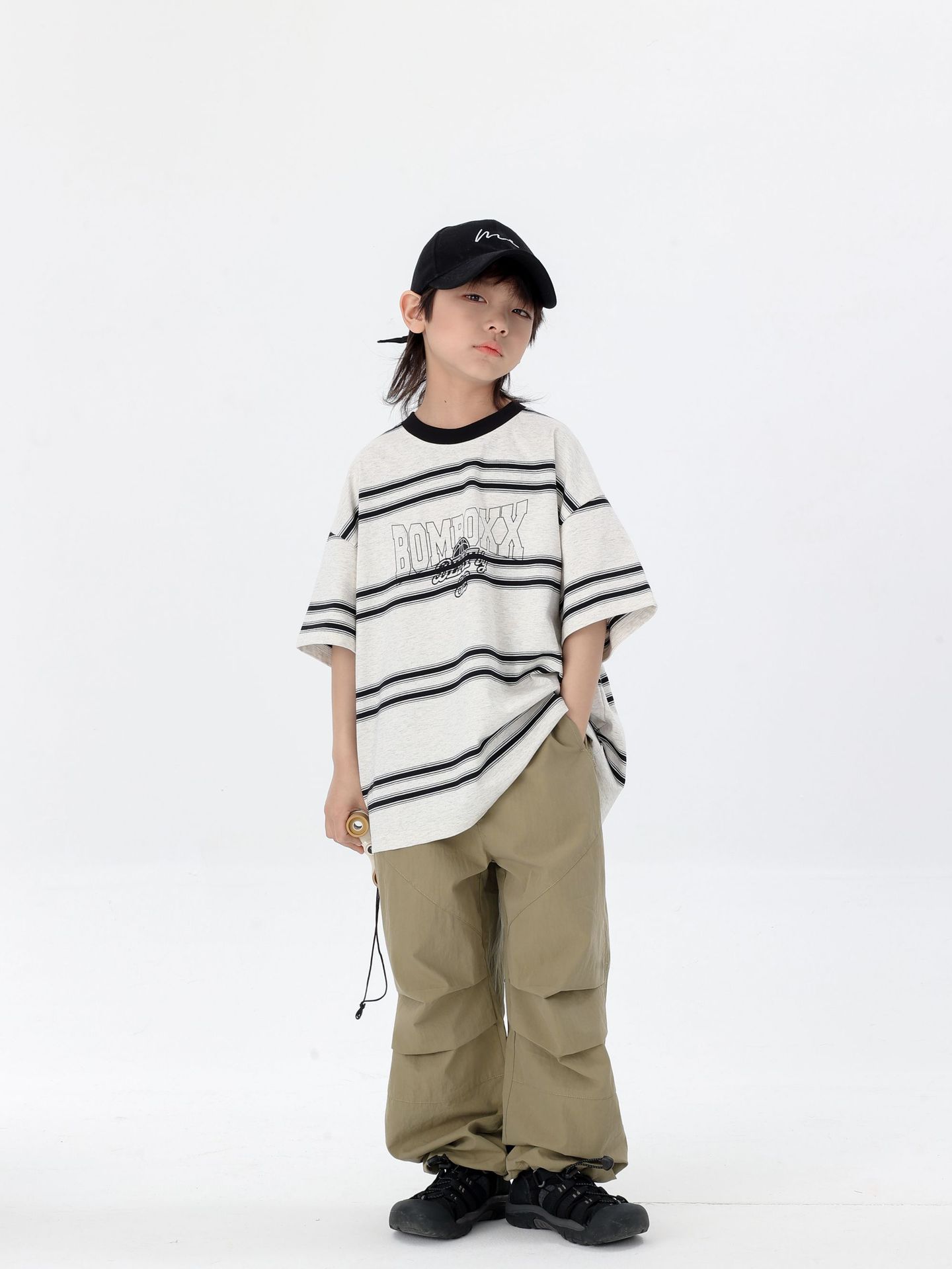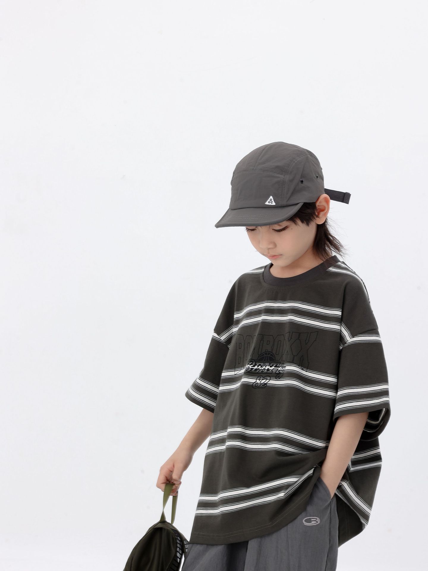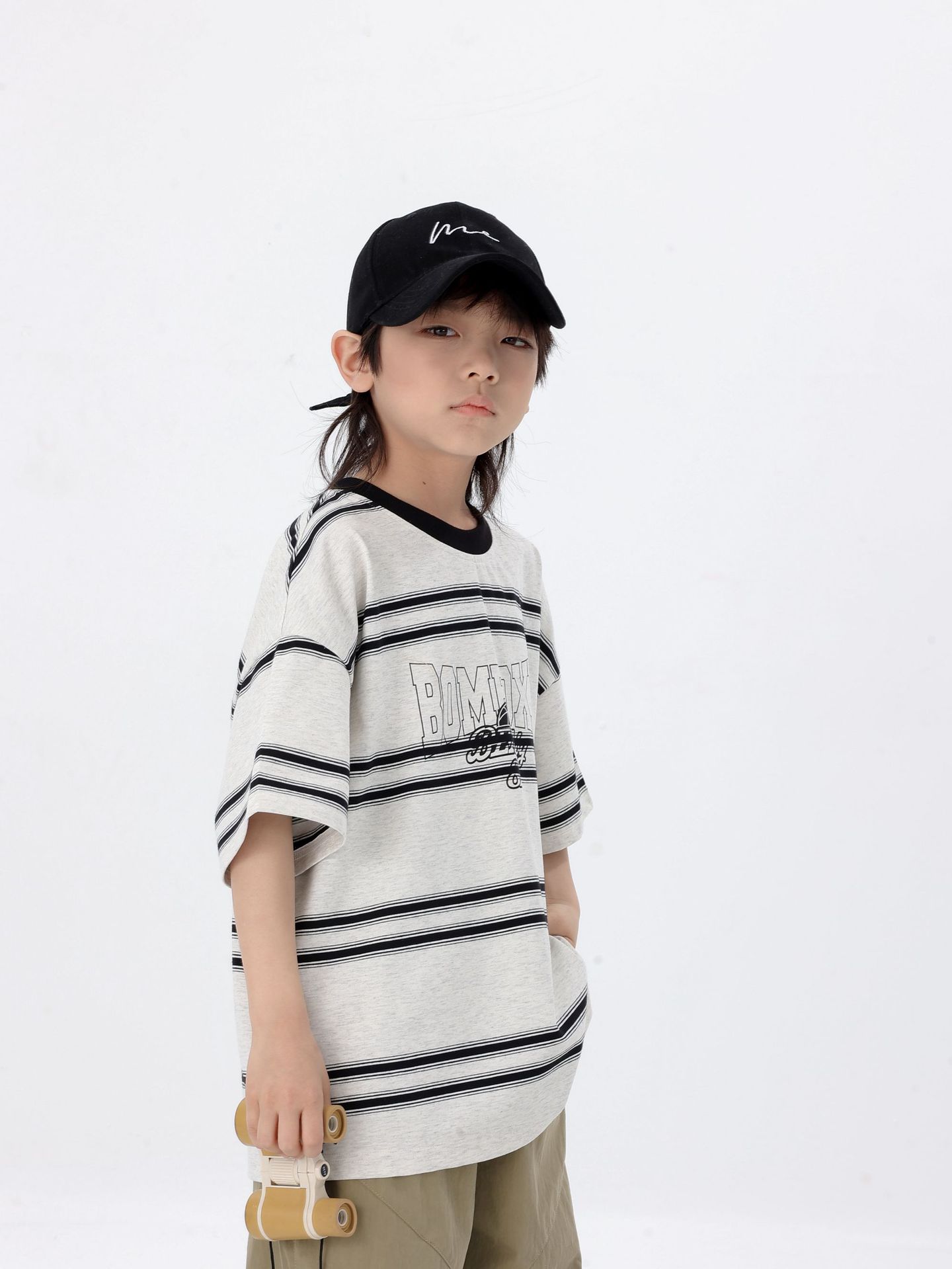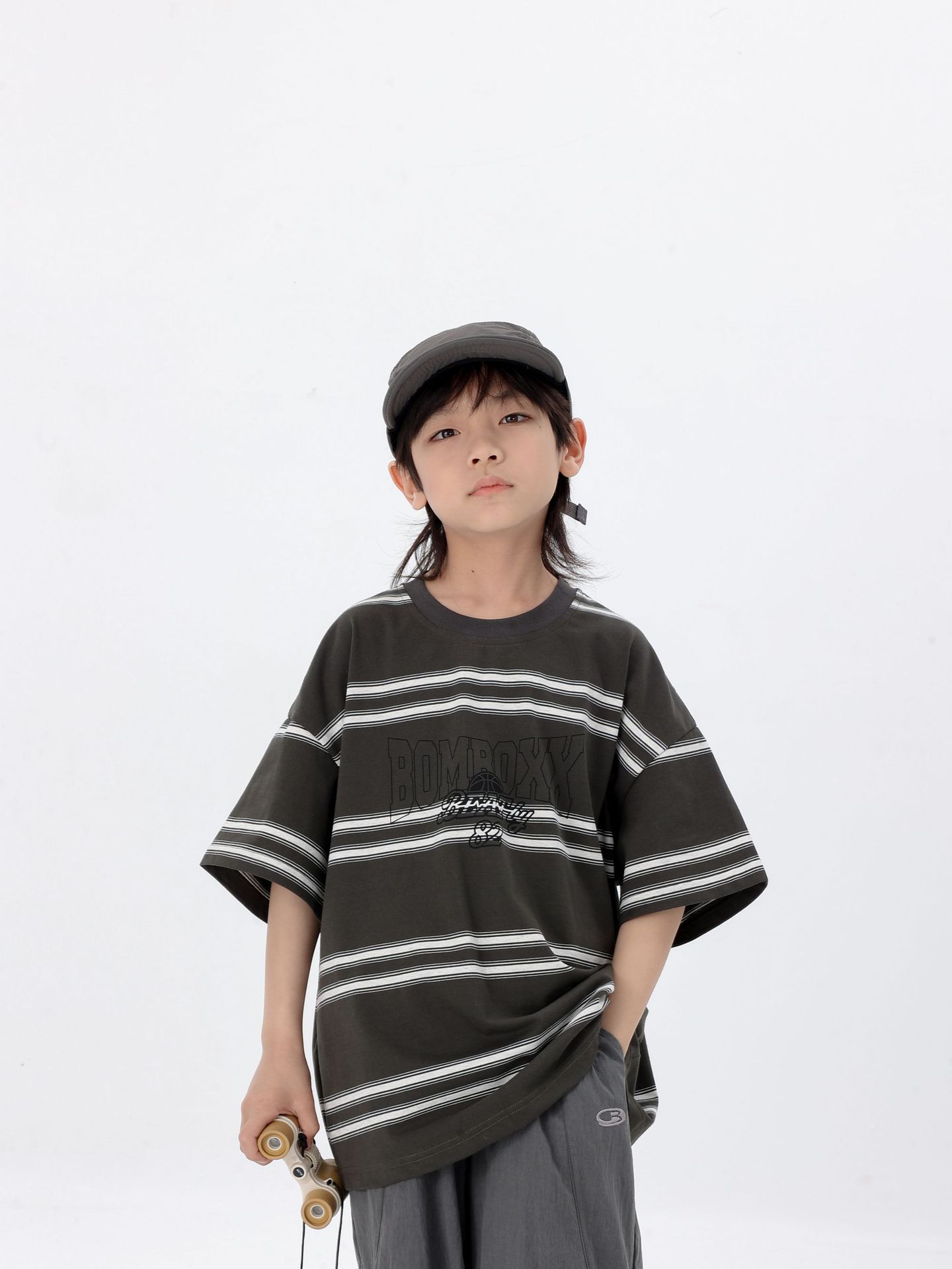 25 여름 새로운 넓은 줄무늬 소년 반팔 티셔츠 클래식 유행 어린이 한국 스타일 느슨한 어린이 편지 티셔츠