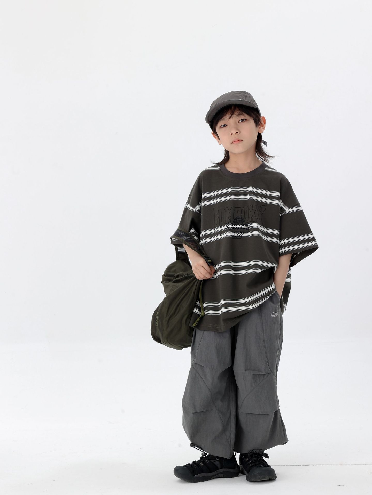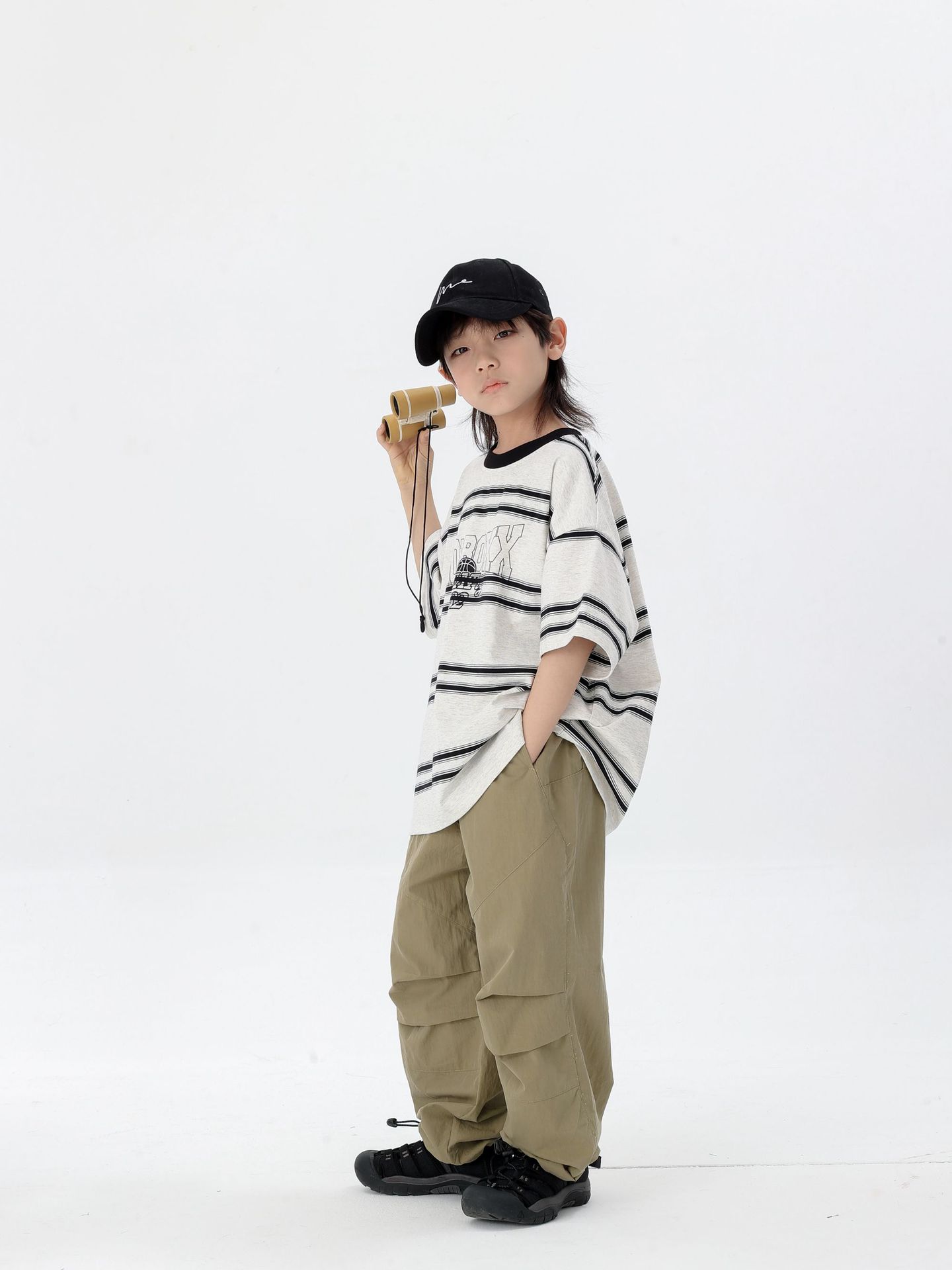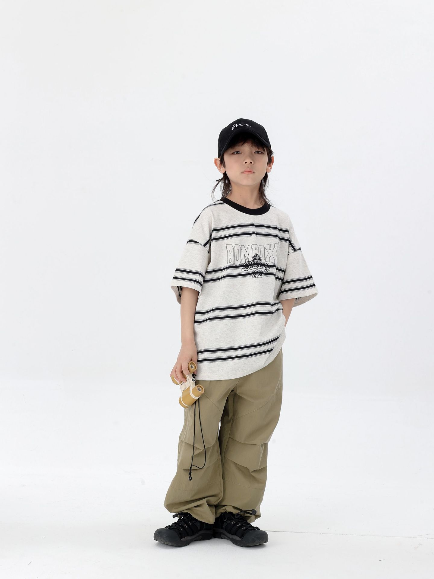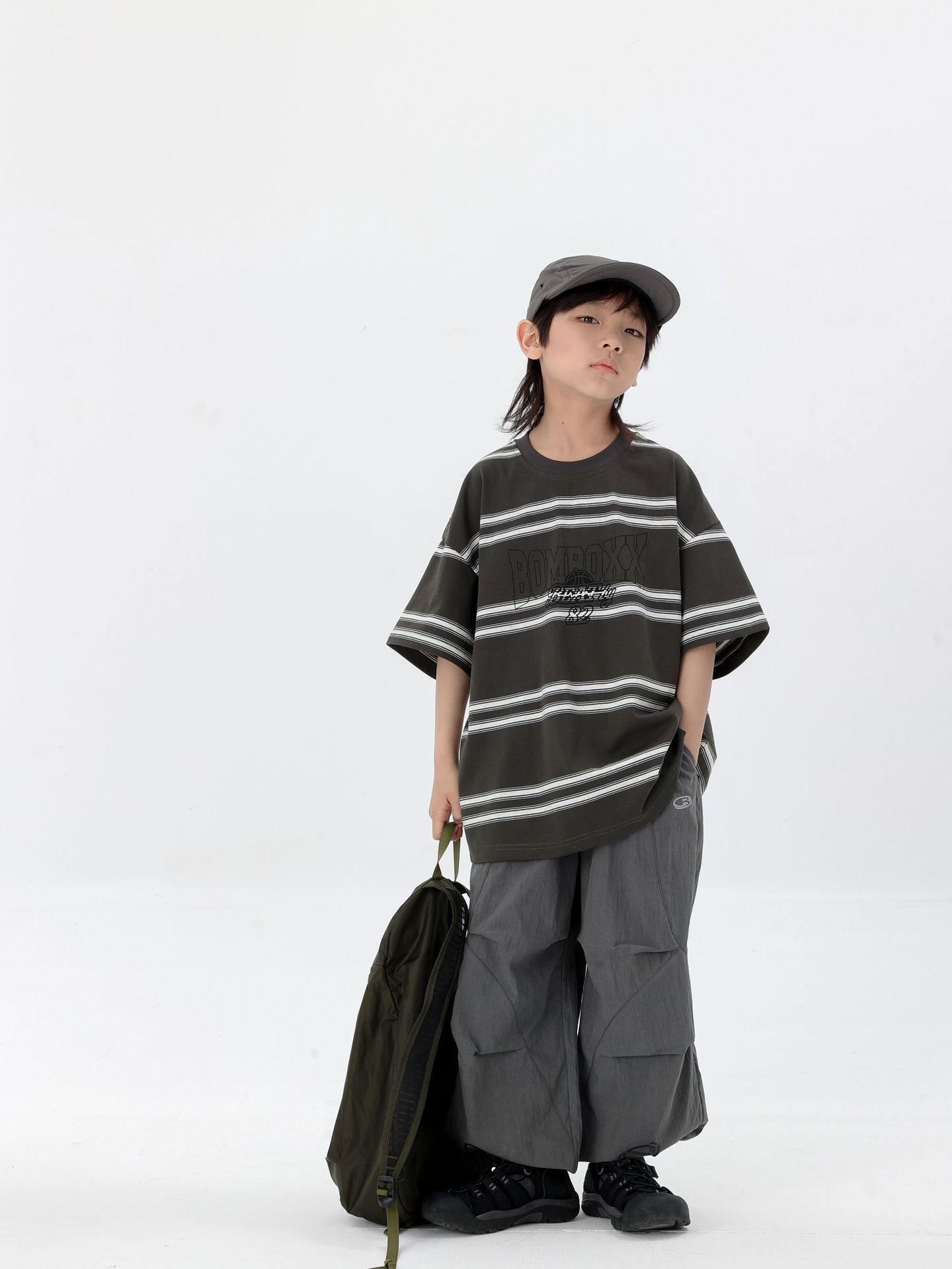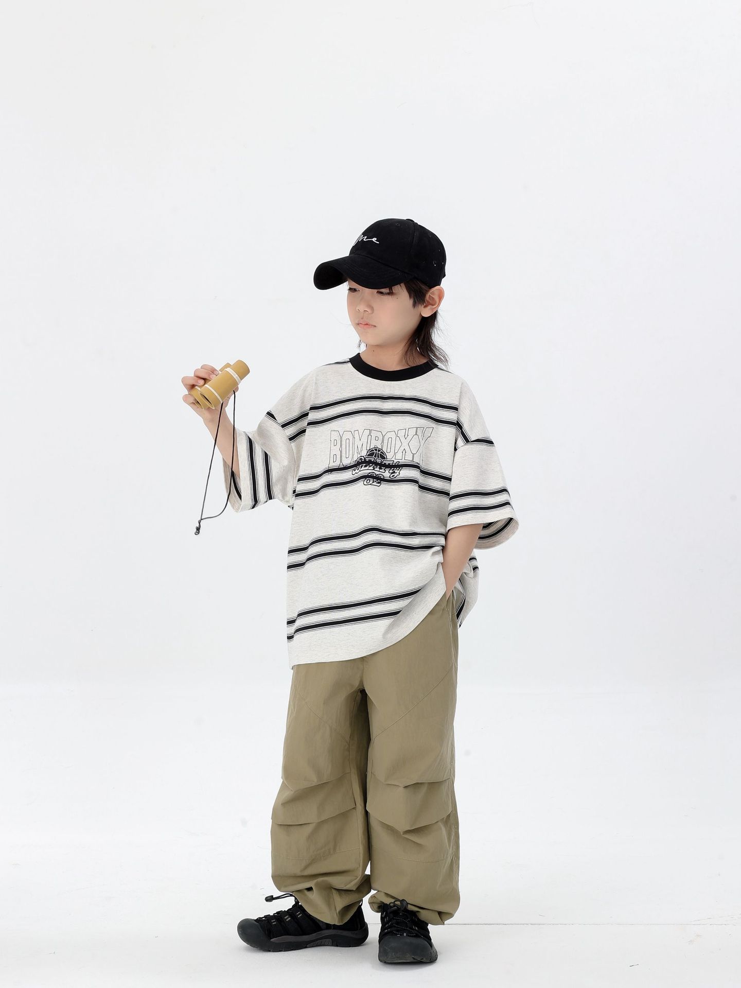25 여름 새로운 넓은 줄무늬 소년 반팔 티셔츠 클래식 유행 어린이 한국 스타일 느슨한 어린이 편지 티셔츠