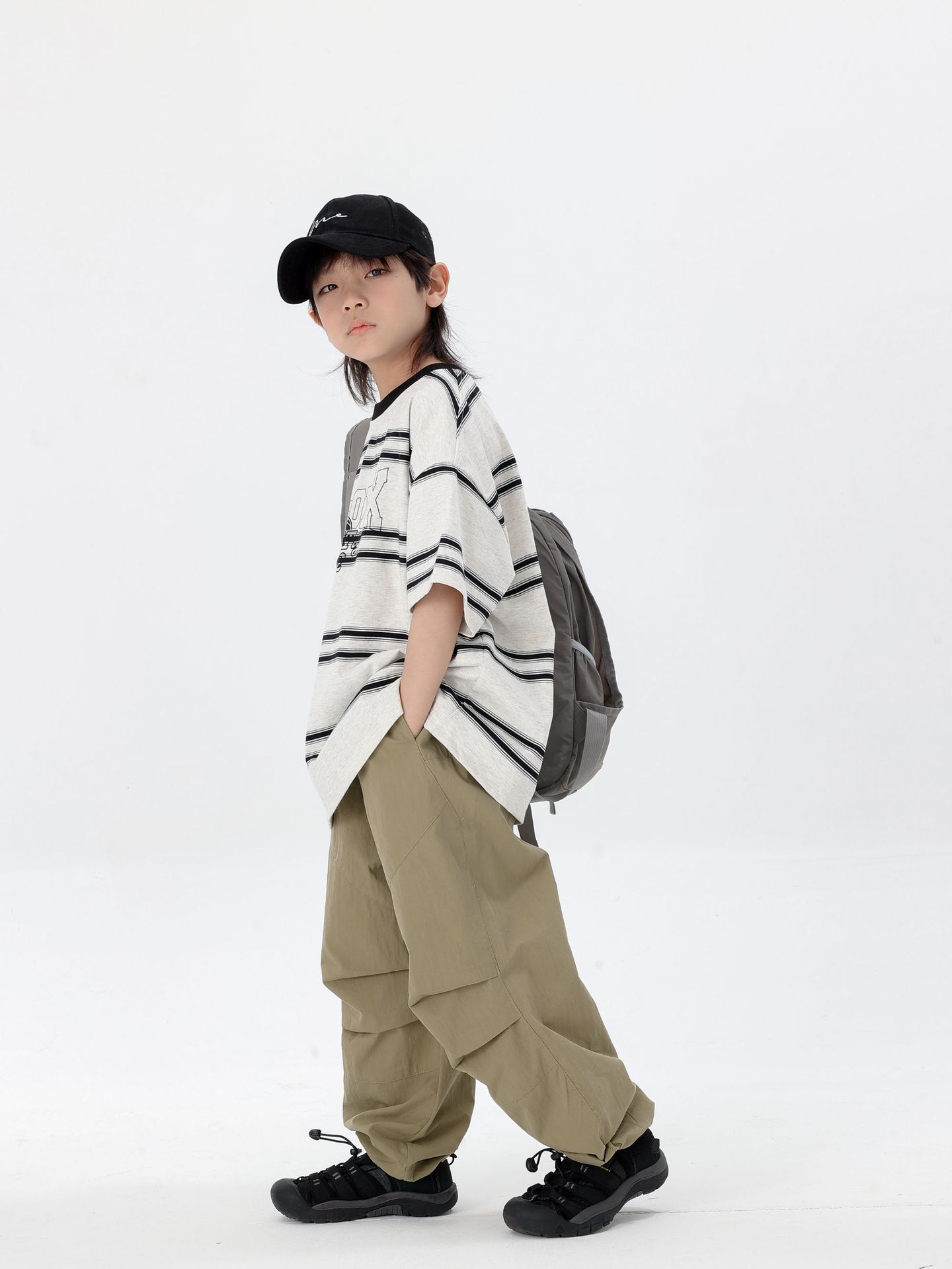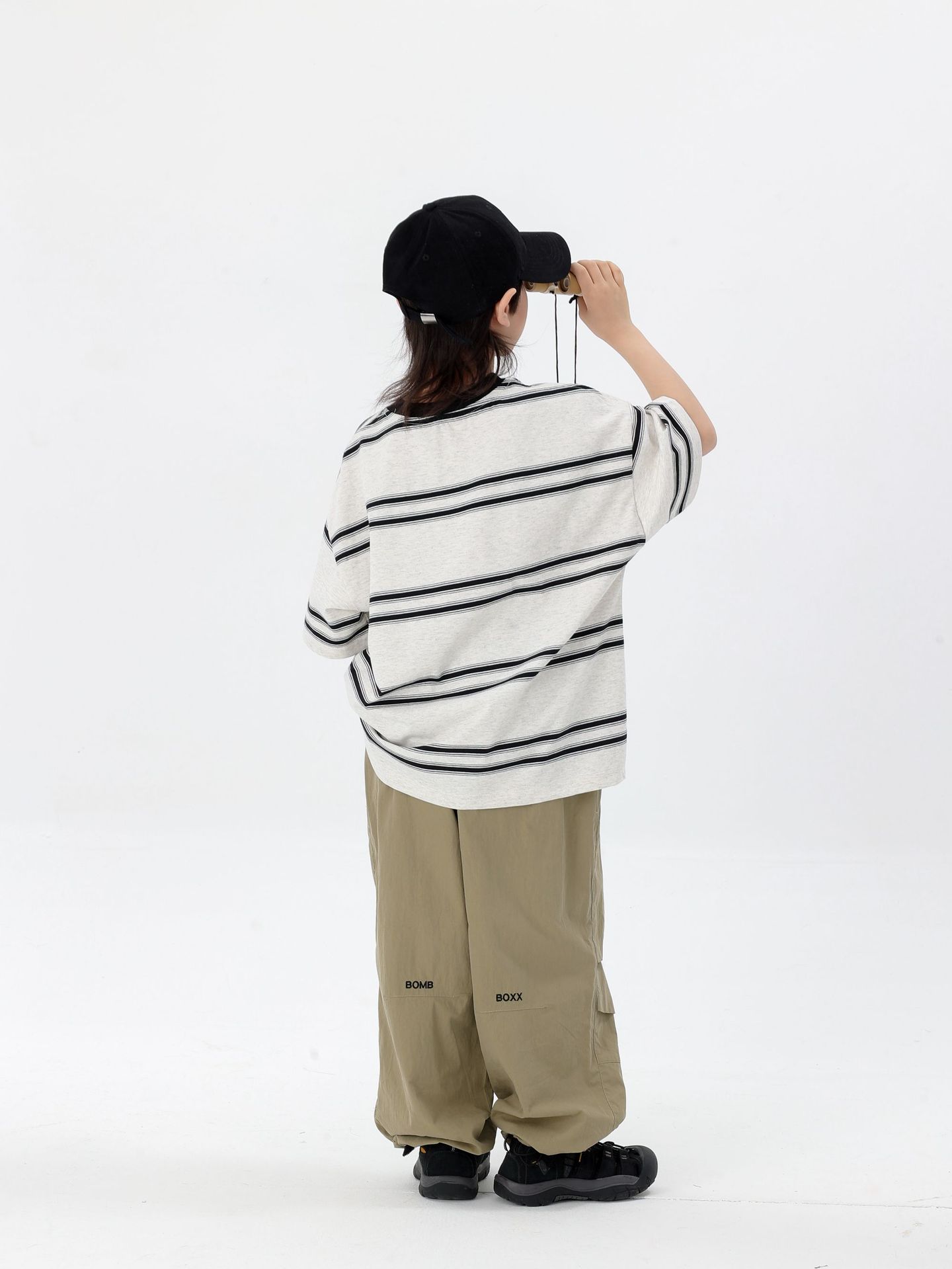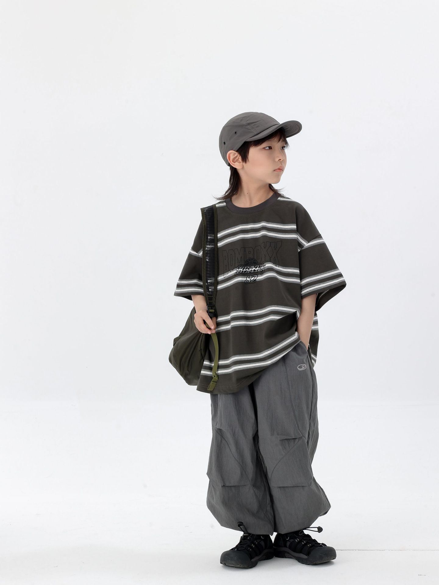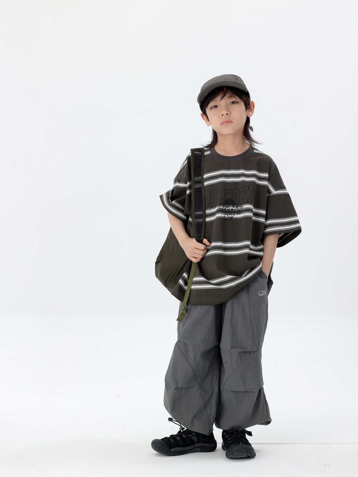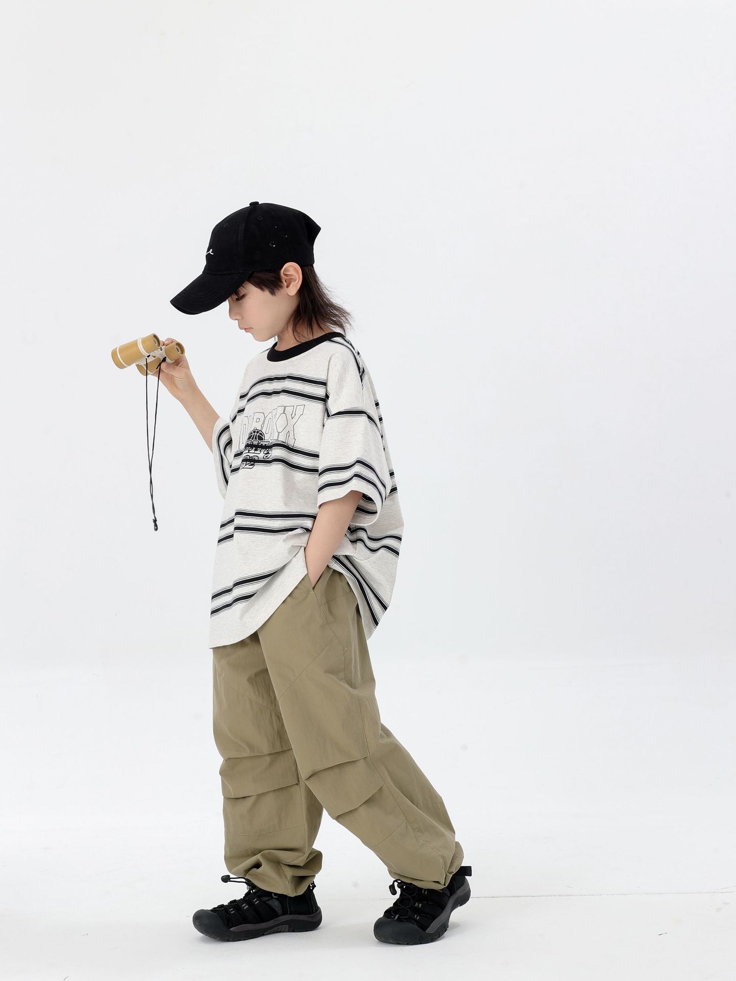 25 여름 새로운 넓은 줄무늬 소년 반팔 티셔츠 클래식 유행 어린이 한국 스타일 느슨한 어린이 편지 티셔츠
