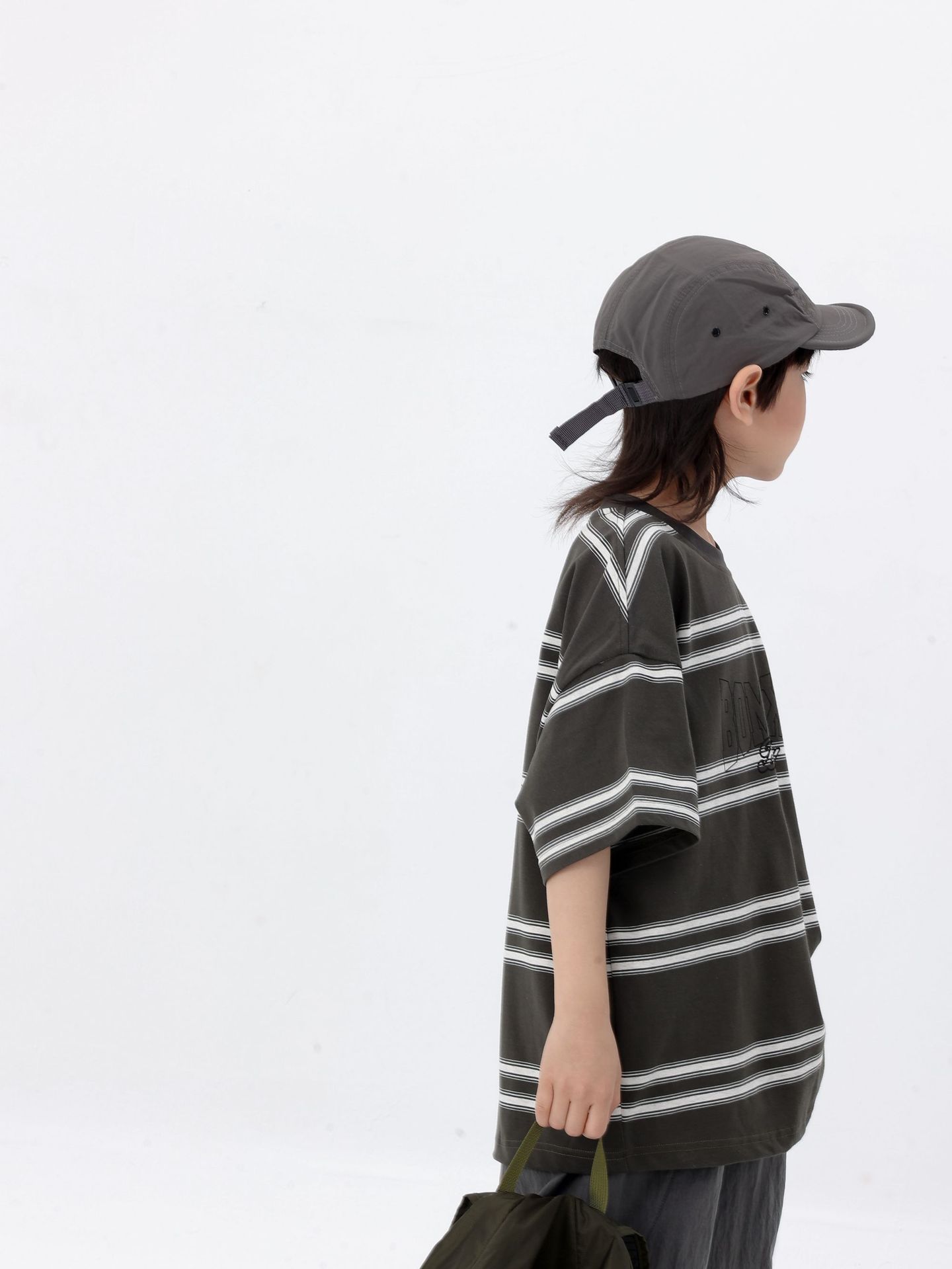 25 여름 새로운 넓은 줄무늬 소년 반팔 티셔츠 클래식 유행 어린이 한국 스타일 느슨한 어린이 편지 티셔츠스토어 가기