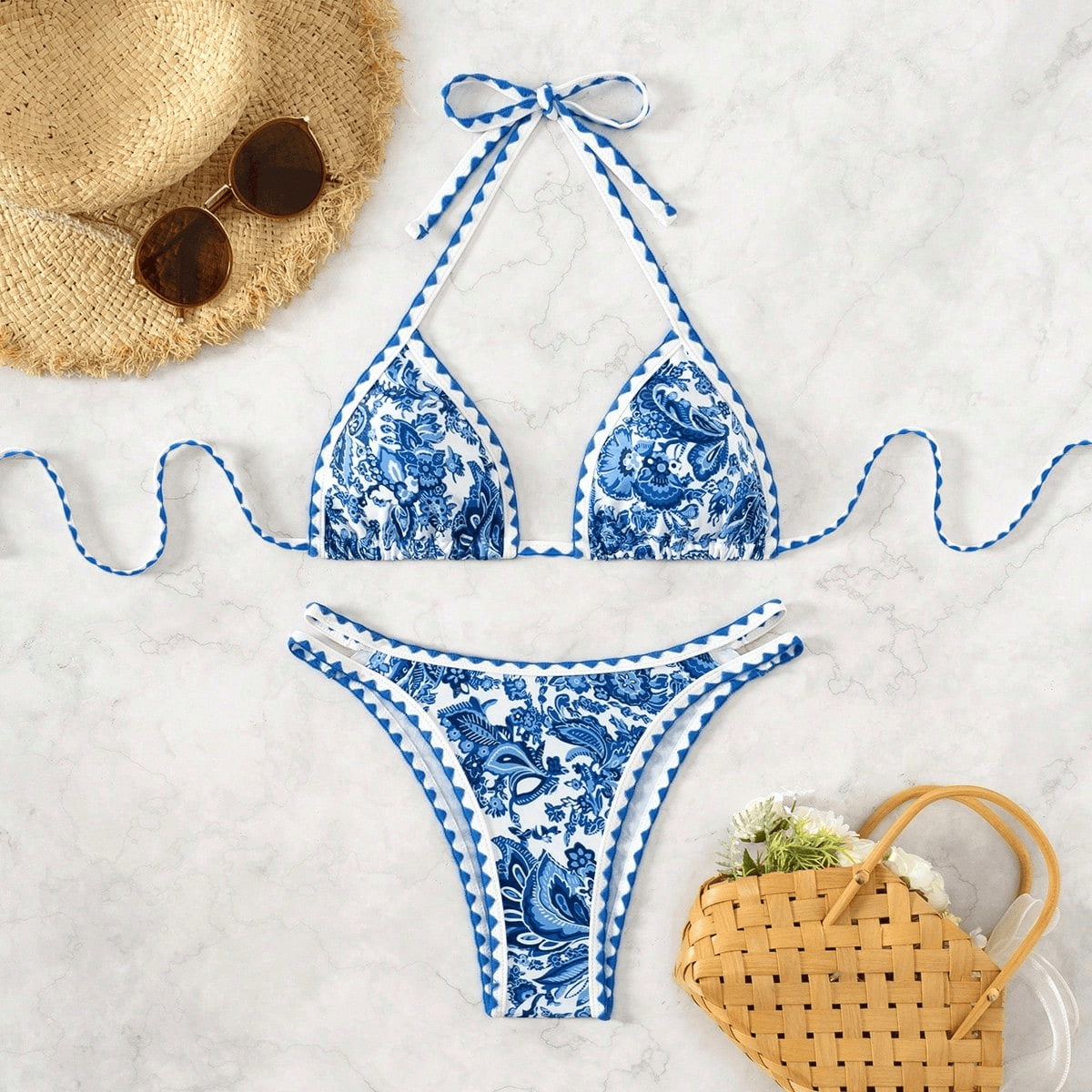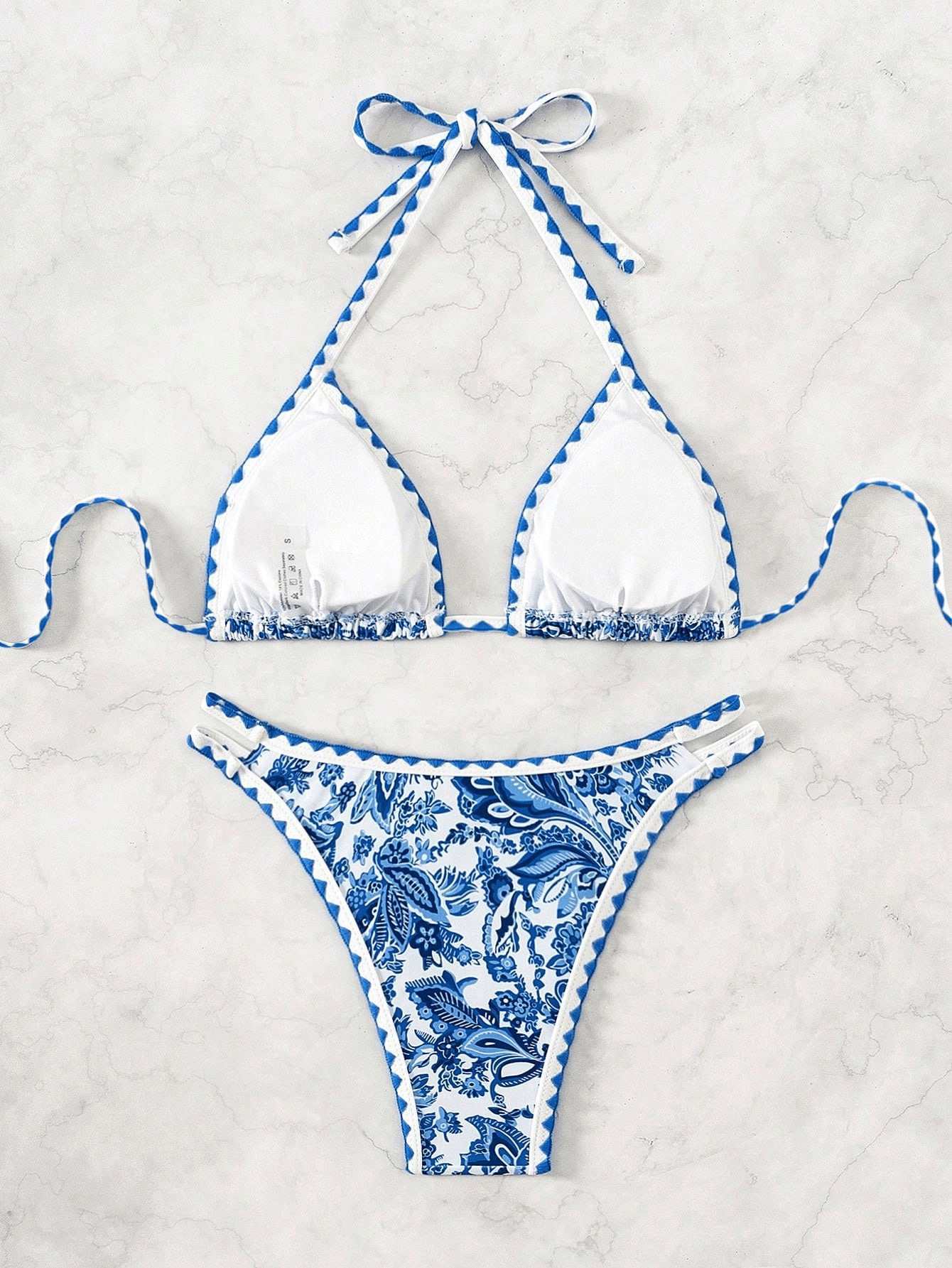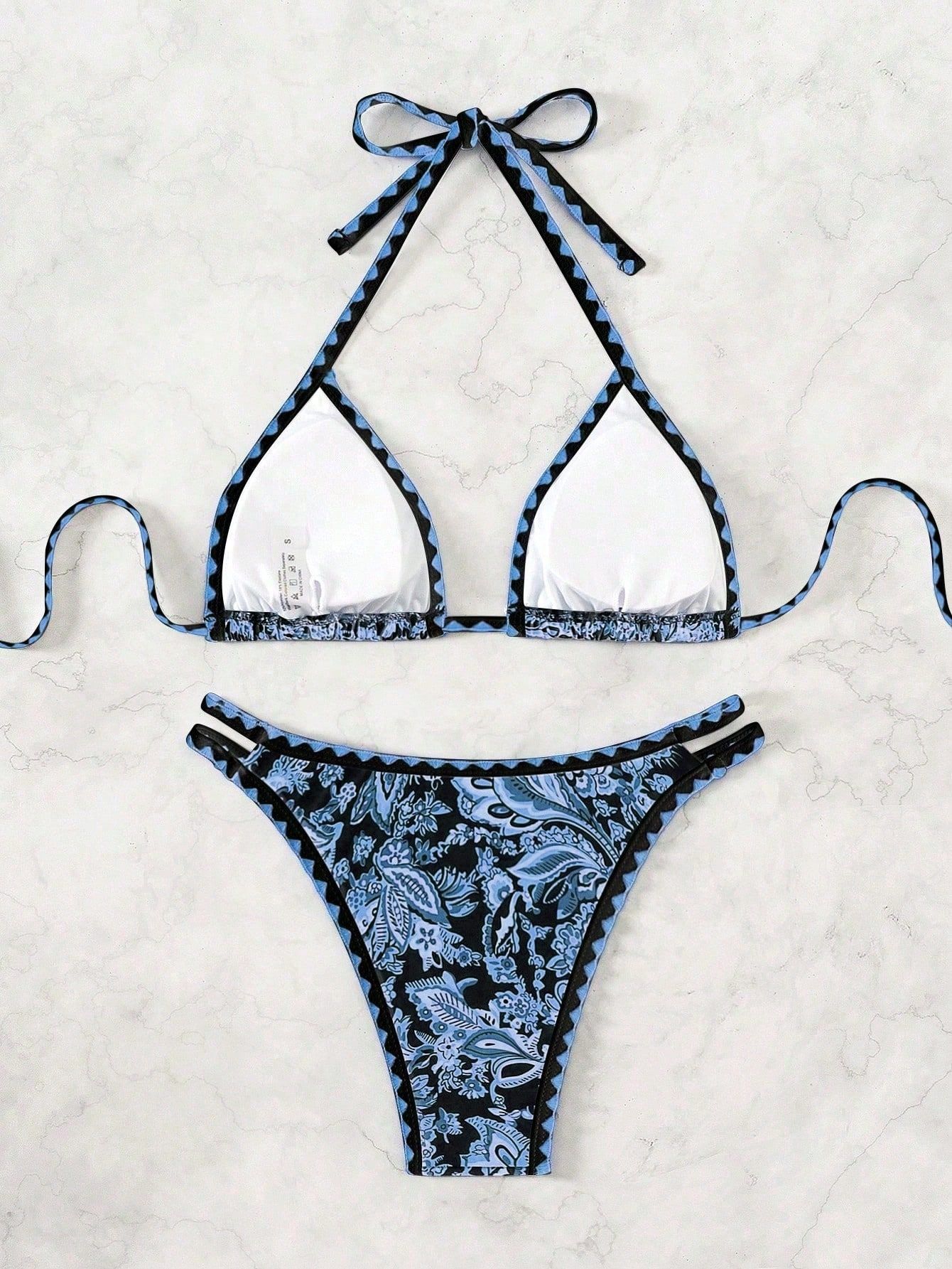 2025 새로운 AliExpress 유럽과 미국의 인쇄 홀터넥 섹시한 비키니 스플릿 수영복 여성 비치 수영복 비키니