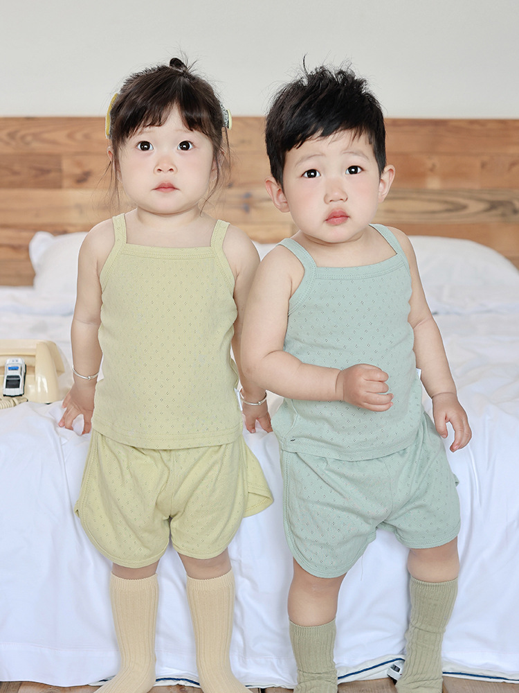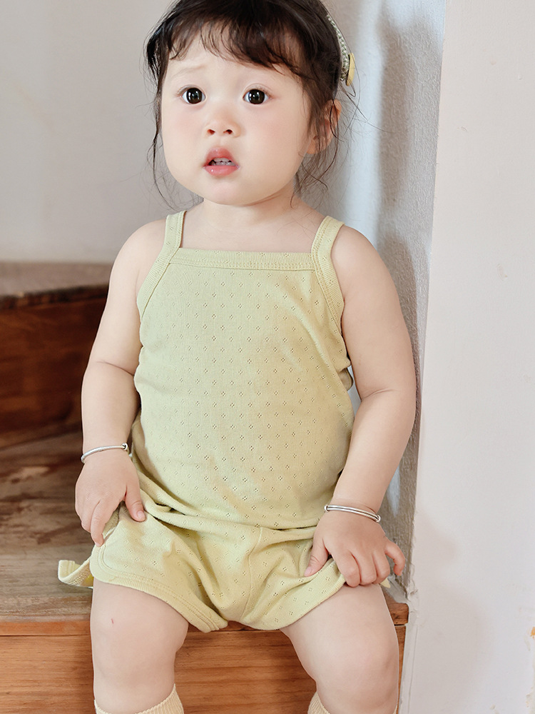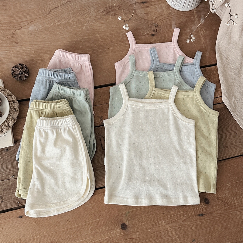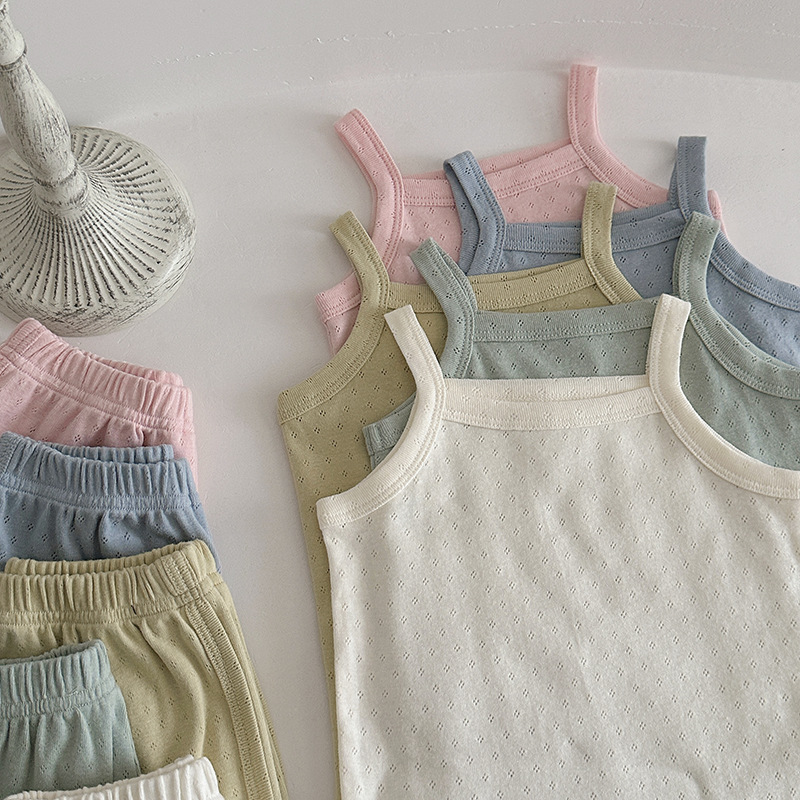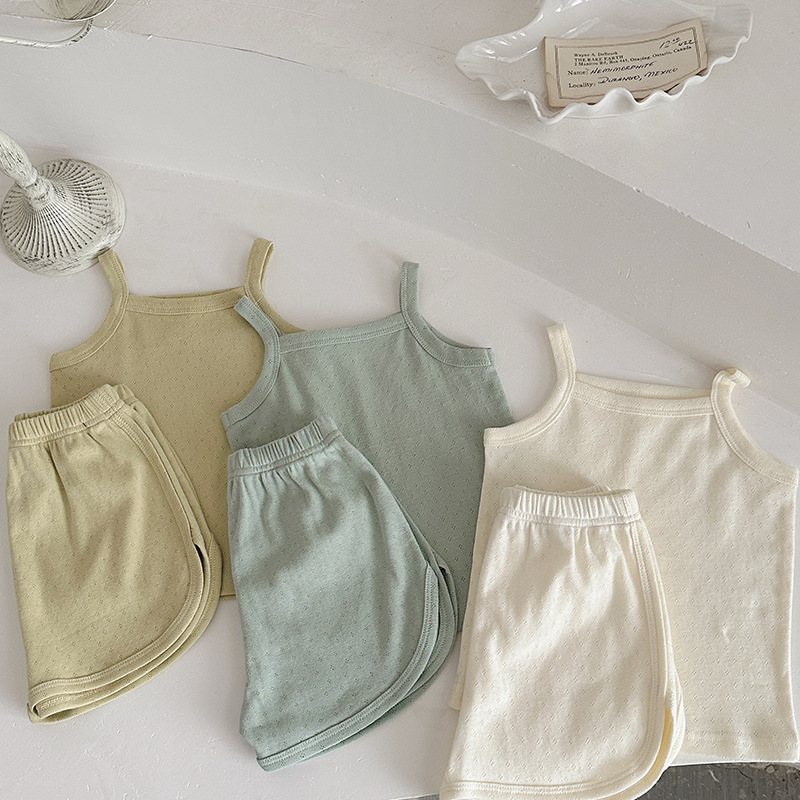 어린이 세트 2025 여름 얇은 단색 소녀 슬링 세트 순수한 면 통기성 여름 아기 소녀를위한 투피스 세트