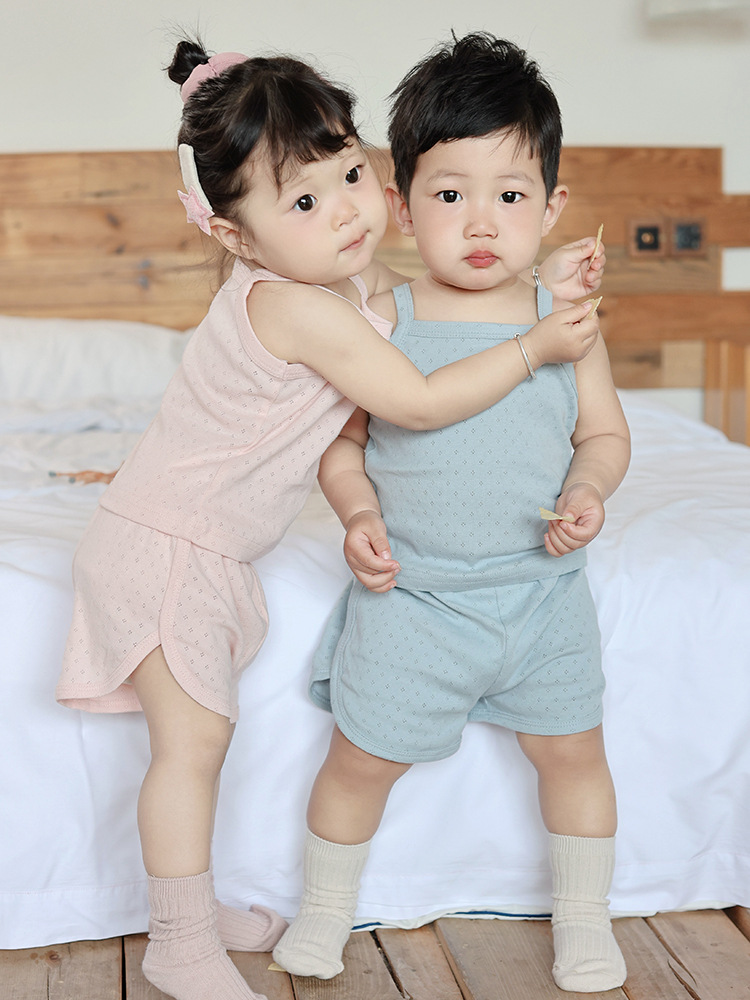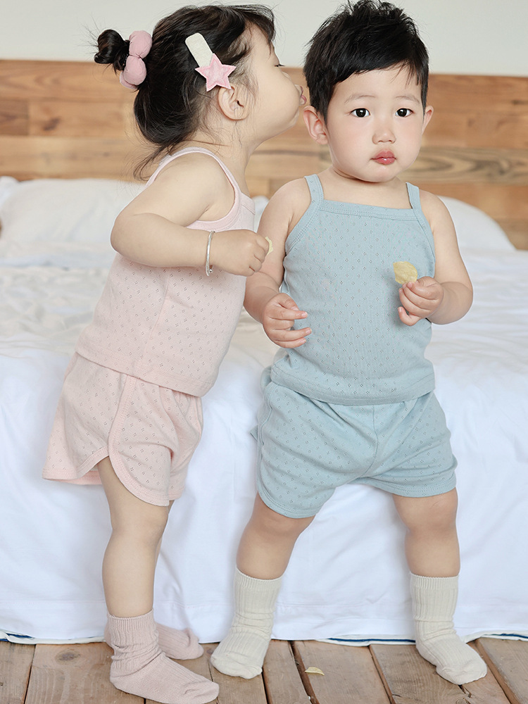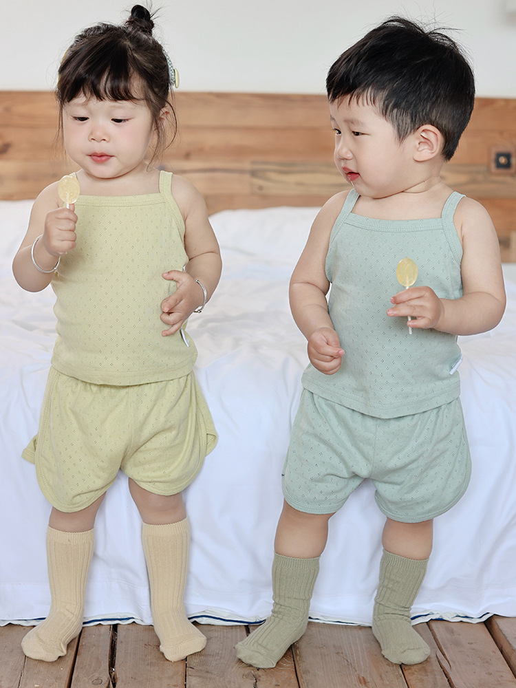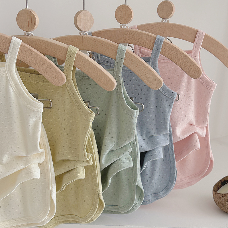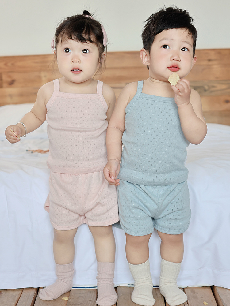 어린이 세트 2025 여름 얇은 단색 소녀 슬링 세트 순수한 면 통기성 여름 아기 소녀를위한 투피스 세트스토어 가기