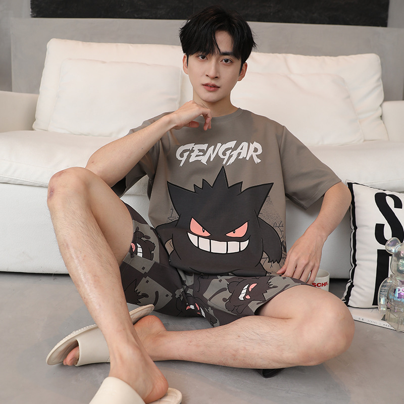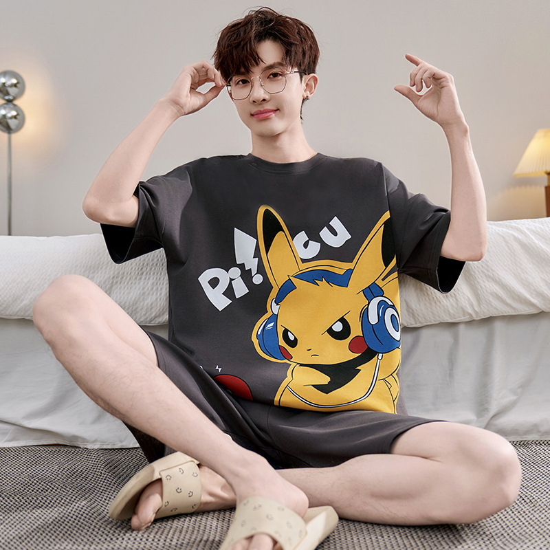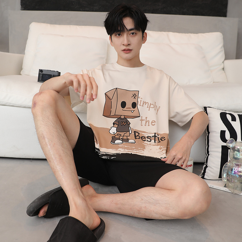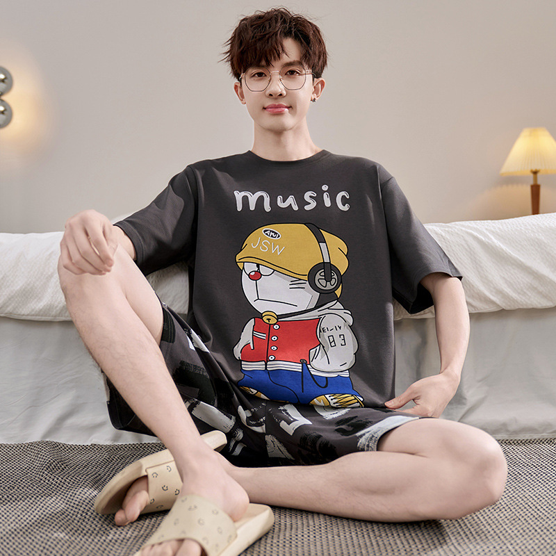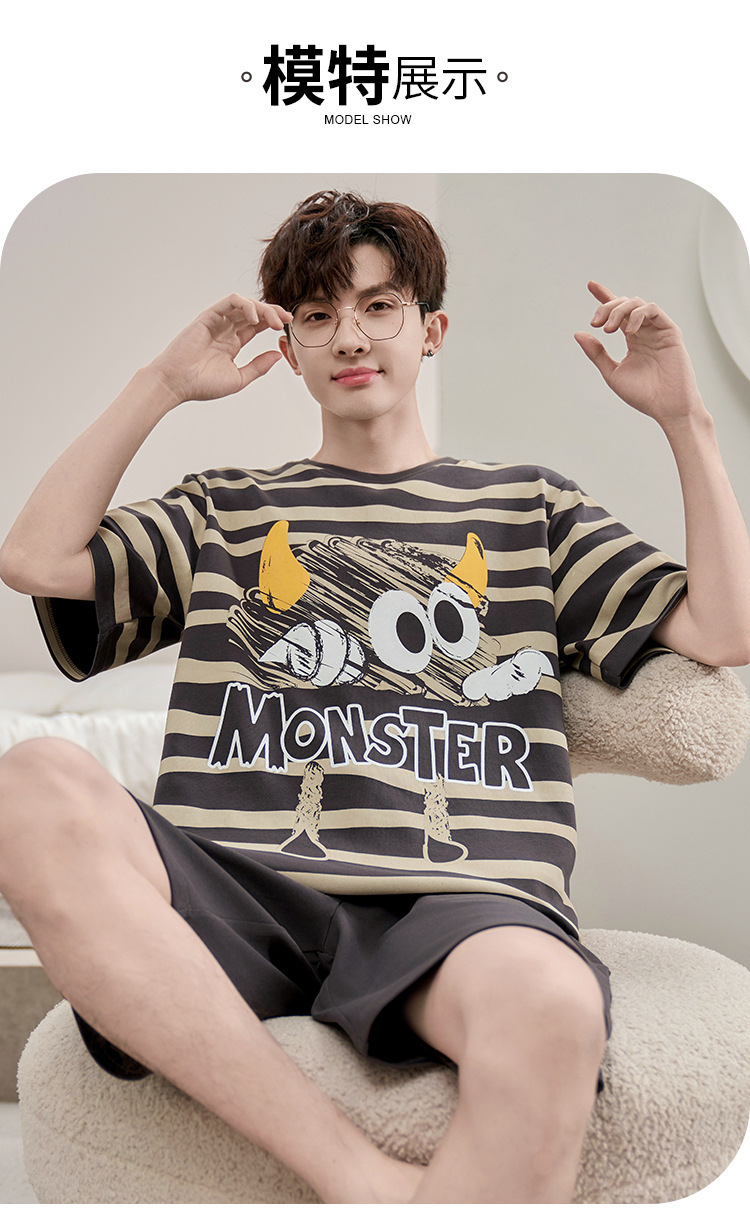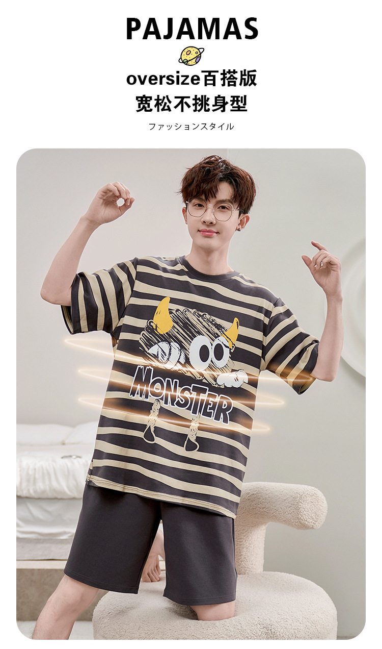 100% 면 잠옷 남성 여름 반팔 만화 줄무늬 청소년 느슨한 대형 착용 가능한 홈웨어 세트스토어 가기