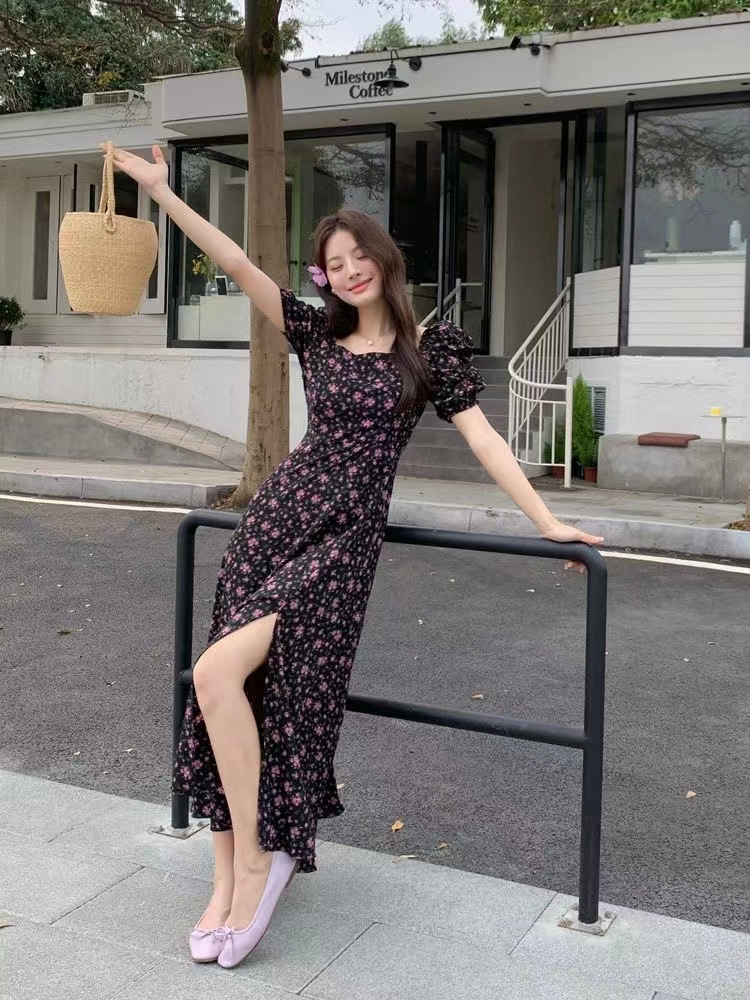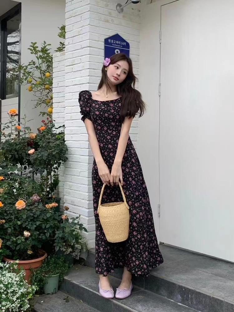 프랑스 레트로 스퀘어 칼라 원피스 여자 여름 하이 엔드 오프 숄더 스커트 타이트 허리 슬리밍 플로럴 롱 스커트스토어 가기